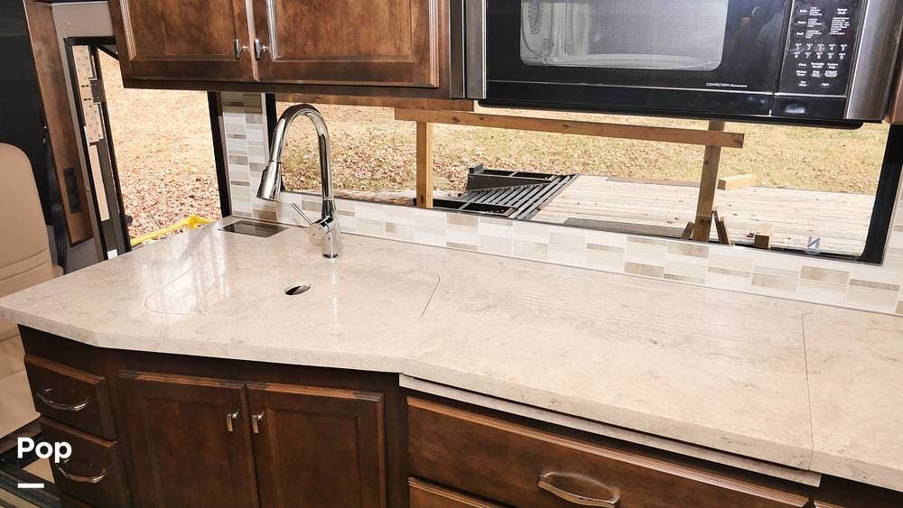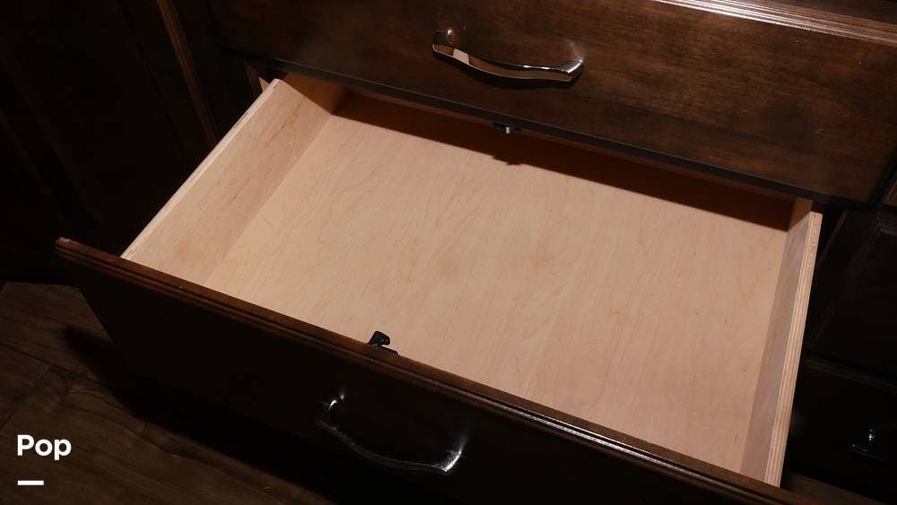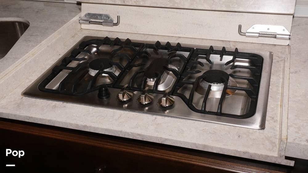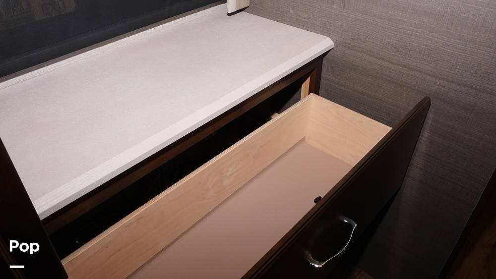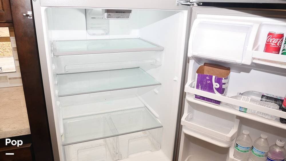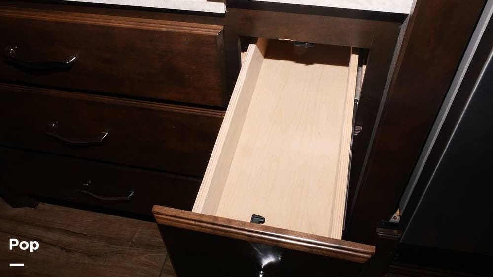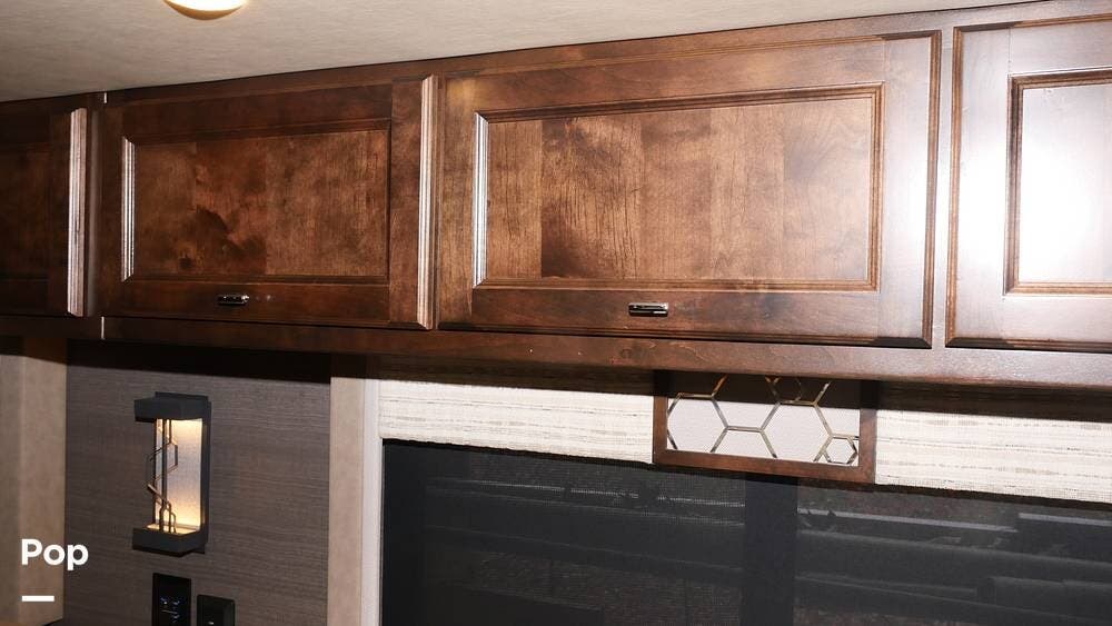 There's also a booth dinette-sleeper for dining, relaxing, and accommodating extra guests. Add the optional drop-down overhead bunk, and you can bring the whole family! The chef will love the full kitchen with task lighting, a smart convection microwave with an air fryer, and a 20 cu. ft. stainless steel residential refrigerator with a top freezer.