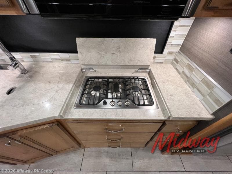Imagine having your own 72" x 80" king-size bed slide, a wardrobe with drawers below, a cabinet, and a flat panel TV with a vanity any where you decide to set up camp. You will soon find out how the private toilet and sink is convenient allowing one person to get cleaned up while another one washes their hands or dries their hair. When you're ready to wind down your night, you can choose to either relax on the sofa bed or play some card games at the booth dinette, and you can even choose to add the optional fireplace for even more luxury. The optional drop down front bunk might come in handy as well. The chef of the family will love the kitchen with its three burner cooktop, spray rinser at the sink faucet, and the two door refrigerator with a pantry!