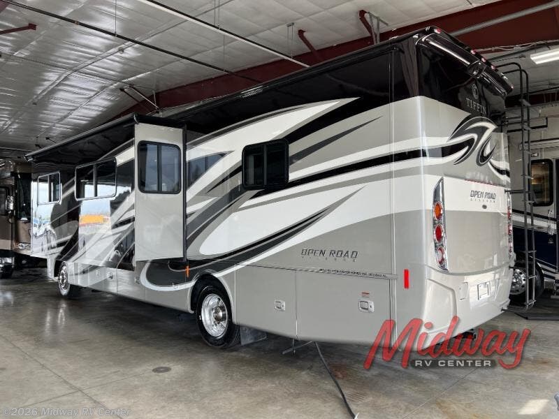 Each Open Road Allegro Class A gas coach by Tiffin Motorhomes offers a one-piece moisture resistant molded fiberglass roof cap providing insulation and strength, a durable and lightweight tubular aluminum wall skeleton, and fiberglass front and rear caps allowing you to enjoy your motorhome for many years to come. The multiplex Spyder Controls system allows you to monitor various tank levels and adjust electrical components of the coach from the comfort of one screen, and the hydraulic automatic leveling jacks make set up a breeze. The kitchen panoramic galley window offers you beautiful scenery, and the high gloss flat panel hardwood cabinet doors, solid wood cabinet fascias, and Ultraleather furniture gives you comfort and style. The midsection flat panel TV, the sound bar system with a subwoofer, and the Blu-Ray player are sure to keep you busy on those rainy days. Start making a lifetime of memories with your own Tiffin Motorhomes Open Road Allegro Class A gas motorhome!