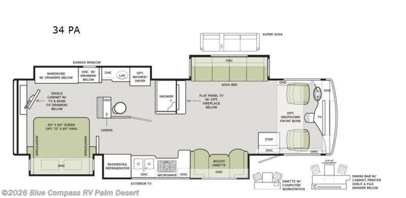 There are plenty of standard features and options to make this motorhome exactly what you want! From the optional drop down bunk over the front Ultraleather power driver and passenger seats and the optional dinette with a computer workstation that can be replaced for the booth dinette to the optional washer and dryer area inside the bathroom. You can even choose to add the optional fireplace below the flat panel TV for even more comfort as you relax on the sofa bed slide out. The rear private bedroom comes standard with a 60" x 80" queen-size memory foam mattress but if you want something bigger then you can switch it out for the optional king-size mattress instead. Yet you might decide the RV is perfect just as it comes!