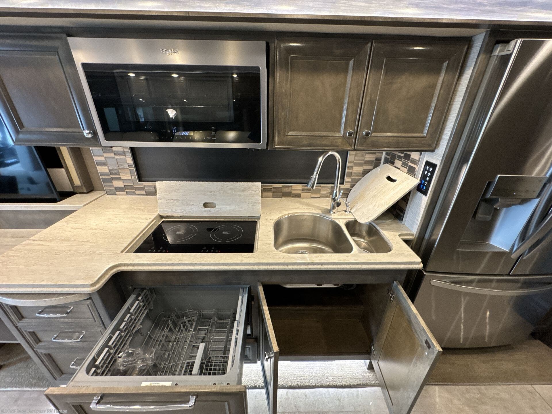 Your trip across the states will be spent in luxury with this Phaeton motorhome. You can comfortably sleep six people each night, and more if you choose the optional drop-down front bunk. There will be plenty of space to relax thanks to the four dual opposing slides, and the grandkids can sleep on the two sofas or the booth dinette. There is even a lift TV so they can watch a movie at night! You and your spouse can take the rear bedroom with a queen bed, a large closet, and an overhead cabinet with drawers below for all your belongings. Choose to add the optional stacked washer and dryer, and you're ready for full-time RV living! In the morning, the chef of the group can prepare breakfast in the spacious kitchen that includes plenty of counter space, a convection microwave, and a residential refrigerator just like at home. You can spend your day hiking and sightseeing, or you may just want to watch the big game on the exterior TV!