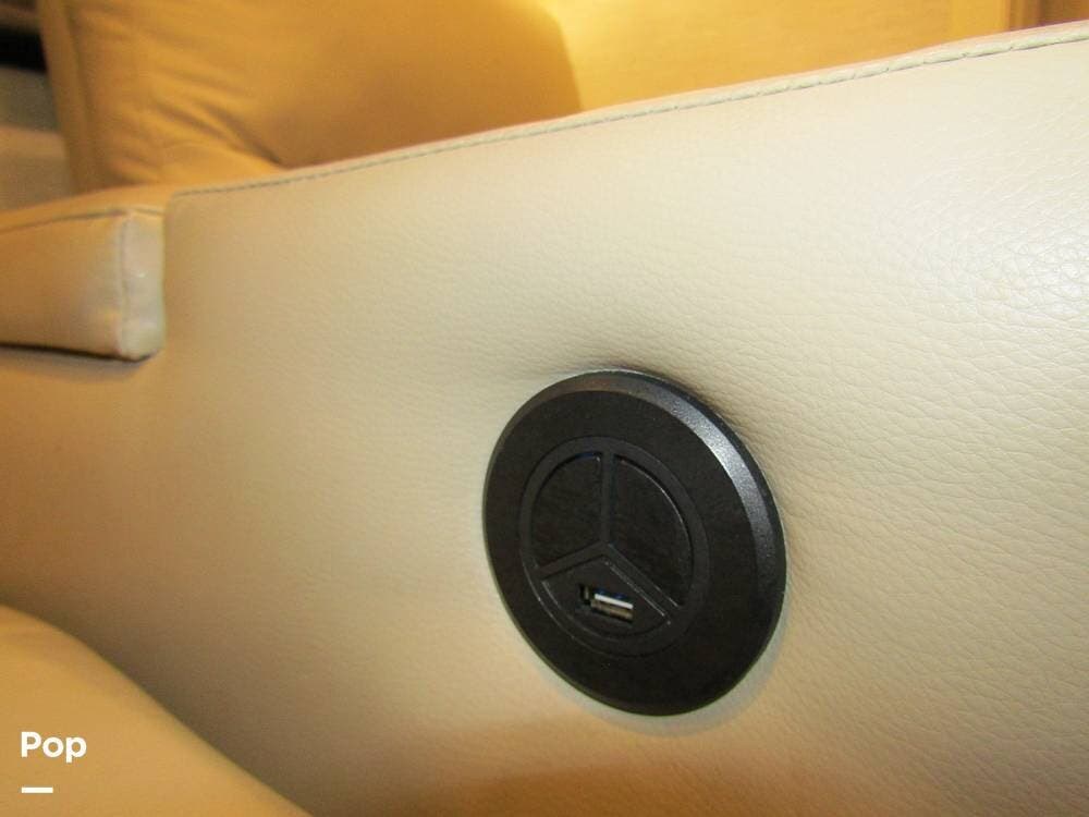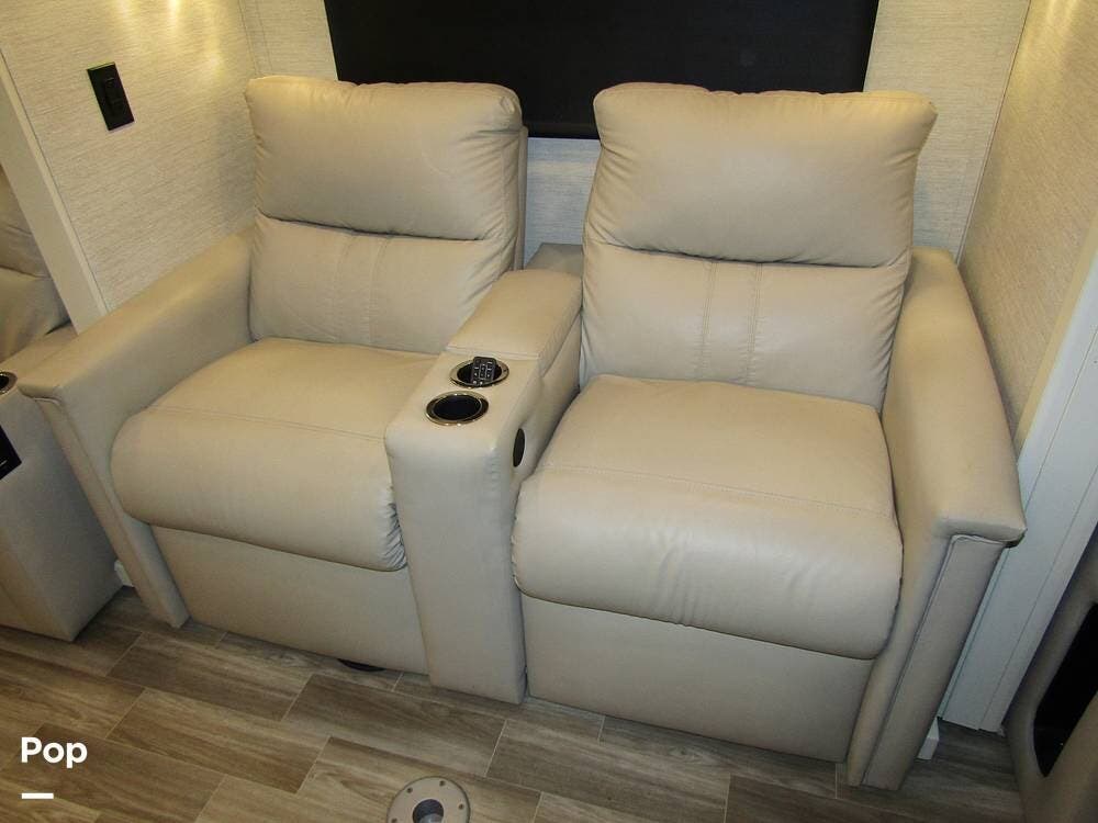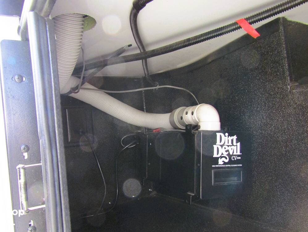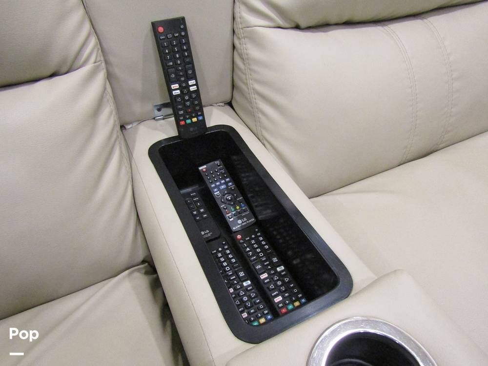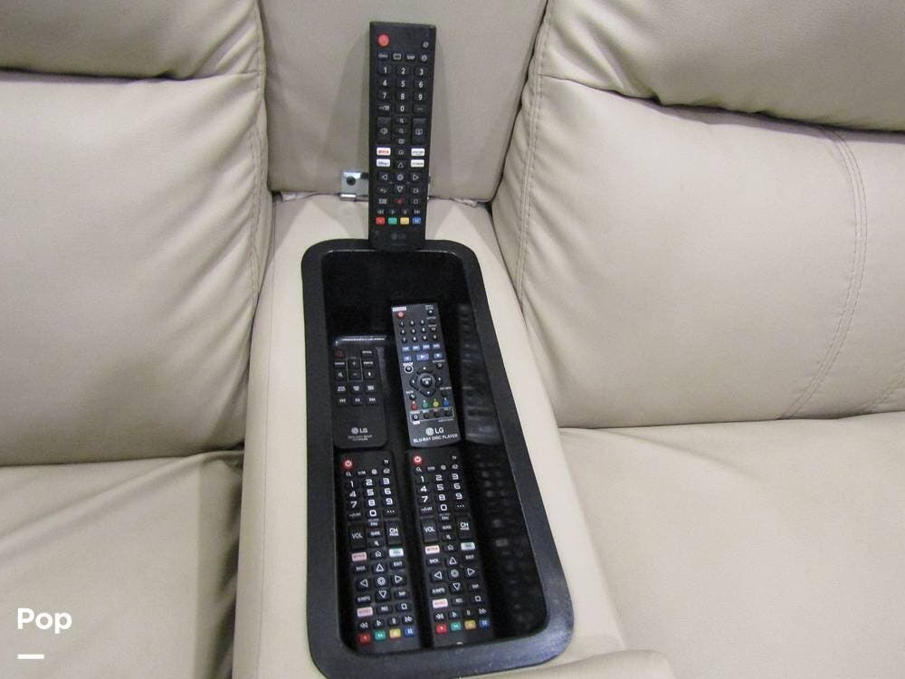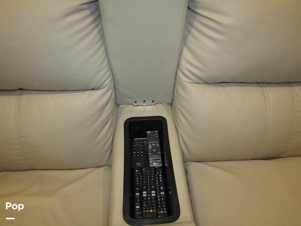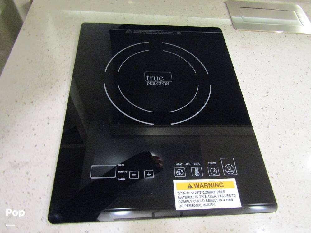 Internally, it is equipped with a leather dual reclining theater seat with power recline and console storage. Across from it, you'll see lots of kitchen counter space as well as solid countertops, a stainless steel microwave and refrigerator, and an induction stove top burner. Towards the rear, you'll find a leather sofa with cup holders that converts to a queen Murphy bed. She also has a Red Devil central vacuum system, two interior TVs, a sound bar, and a CD/DVD player.