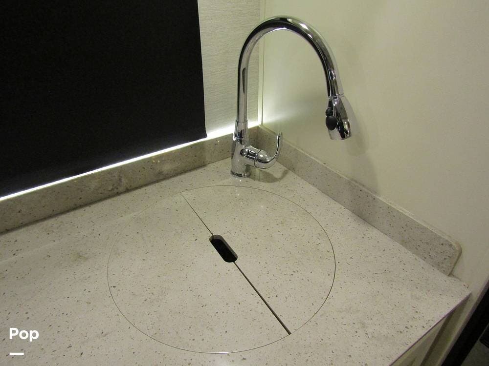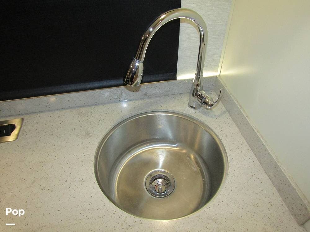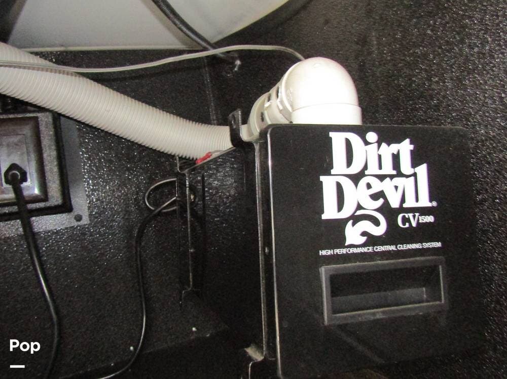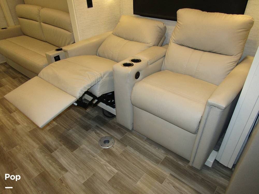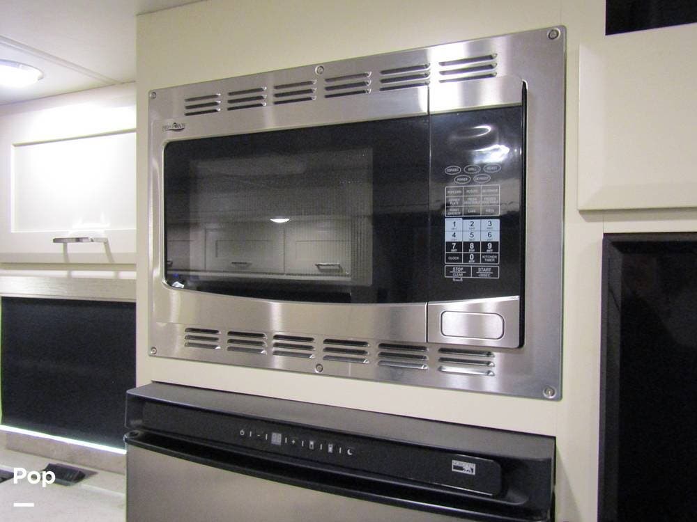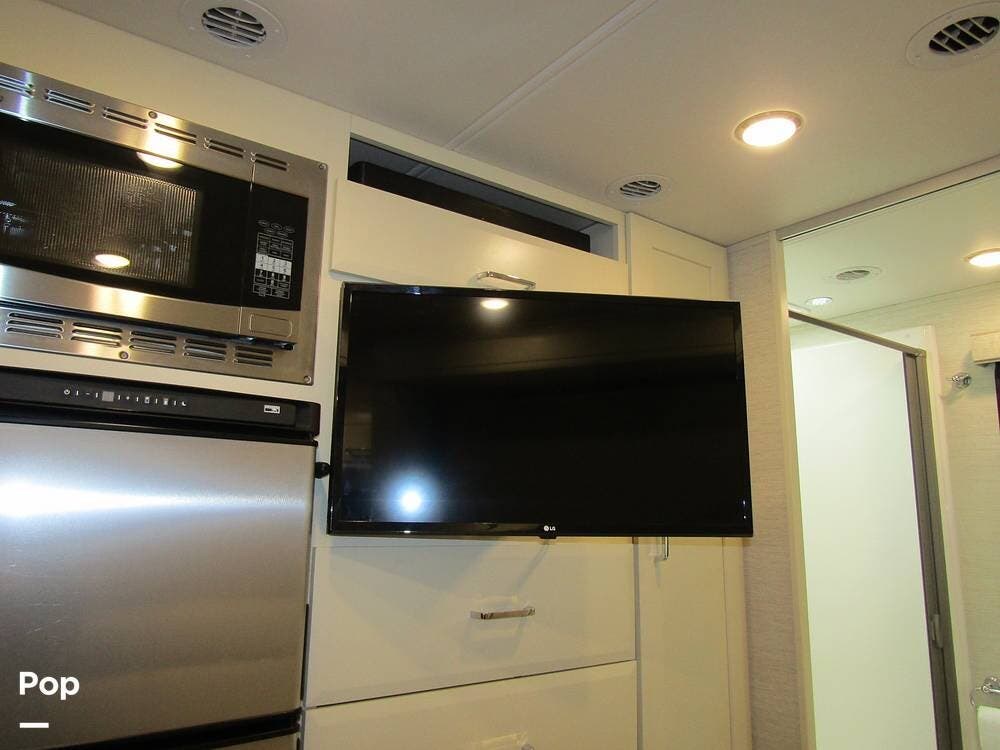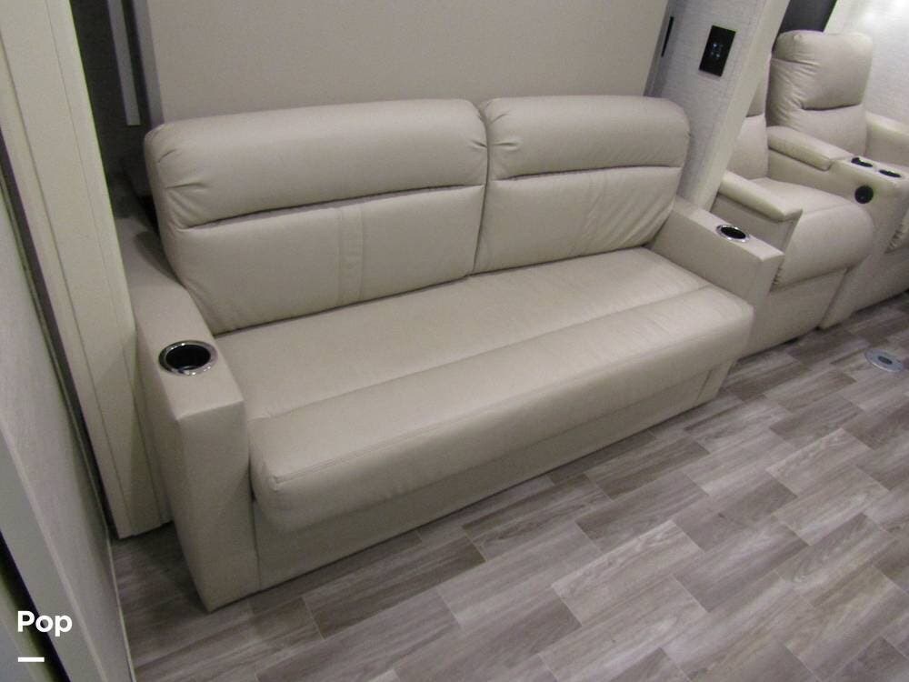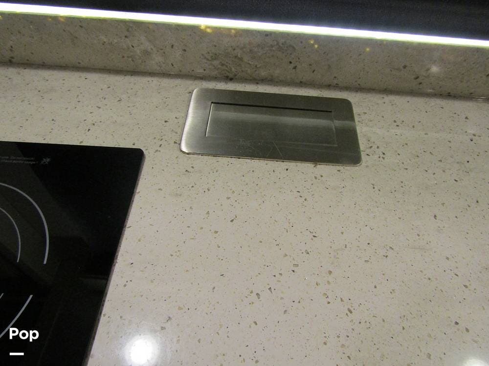 Internally, it is equipped with a leather dual reclining theater seat with power recline and console storage. Across from it, you'll see lots of kitchen counter space as well as solid countertops, a stainless steel microwave and refrigerator, and an induction stove top burner. Towards the rear, you'll find a leather sofa with cup holders that converts to a queen Murphy bed. She also has a Red Devil central vacuum system, two interior TVs, a sound bar, and a CD/DVD player.