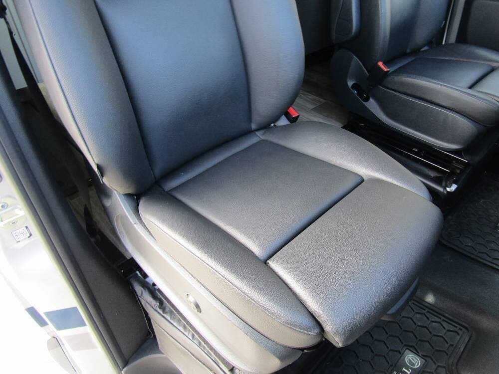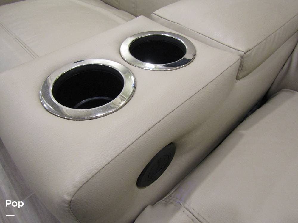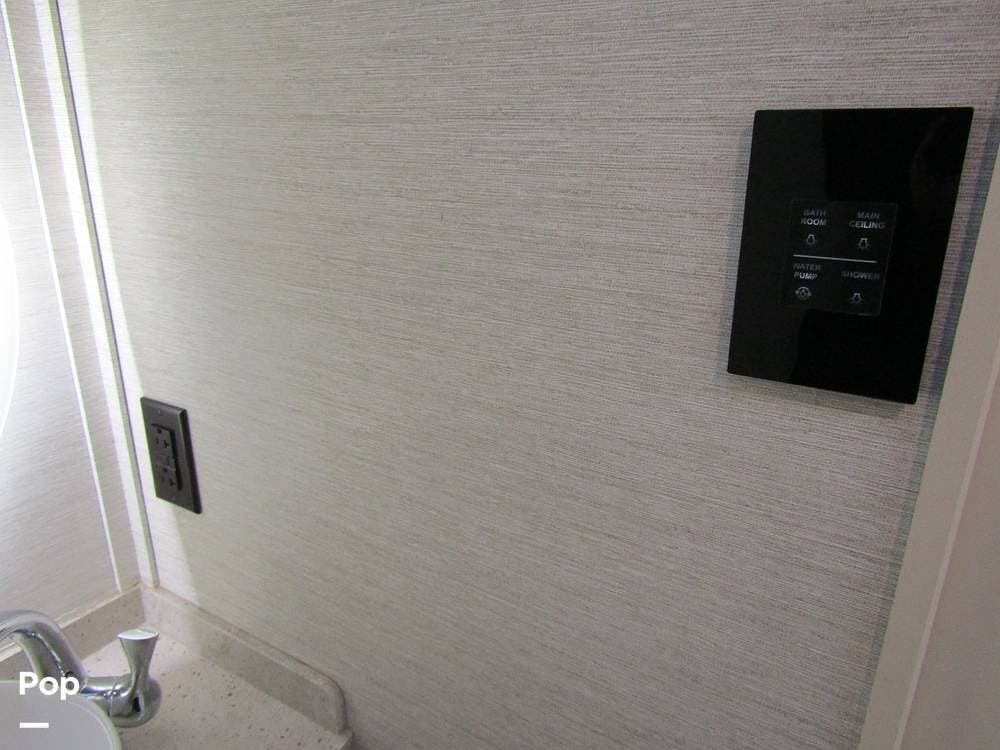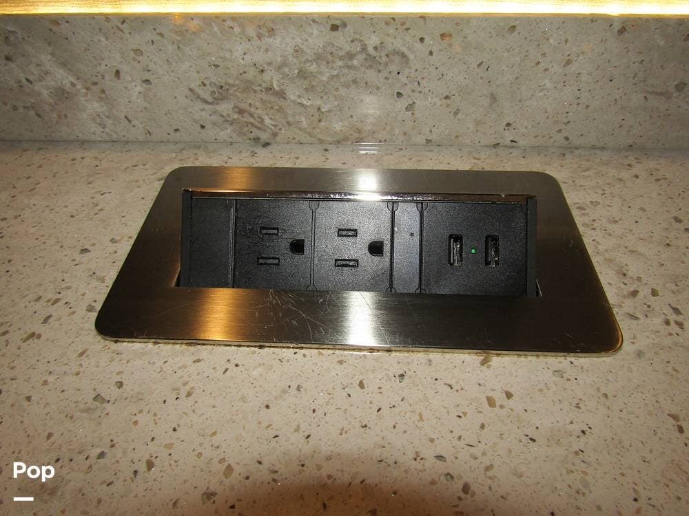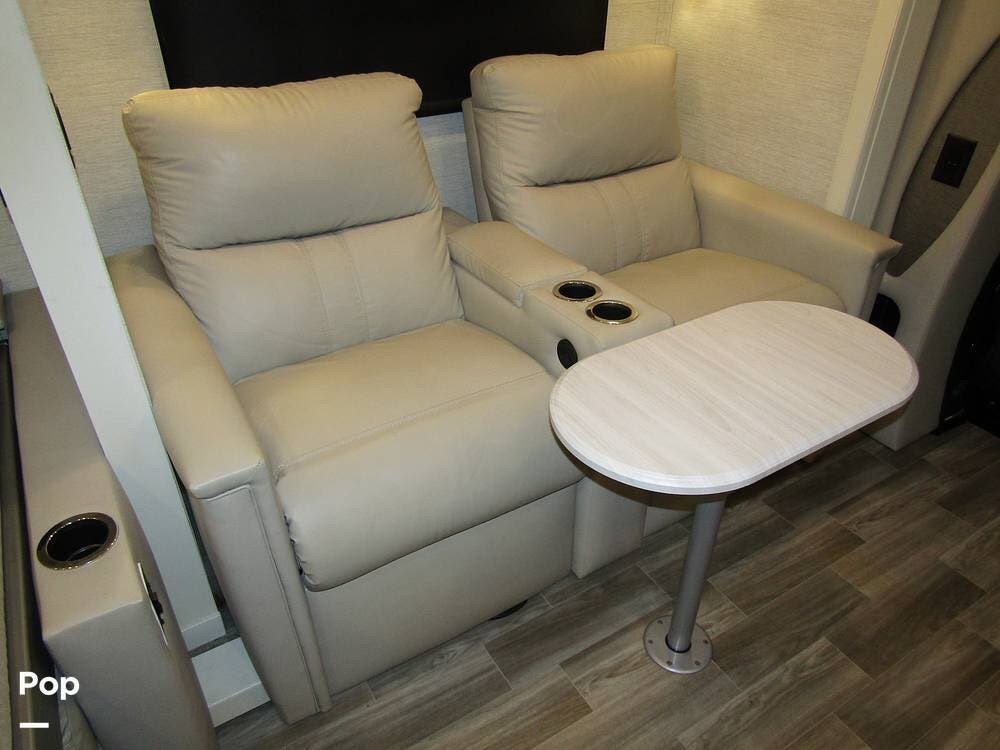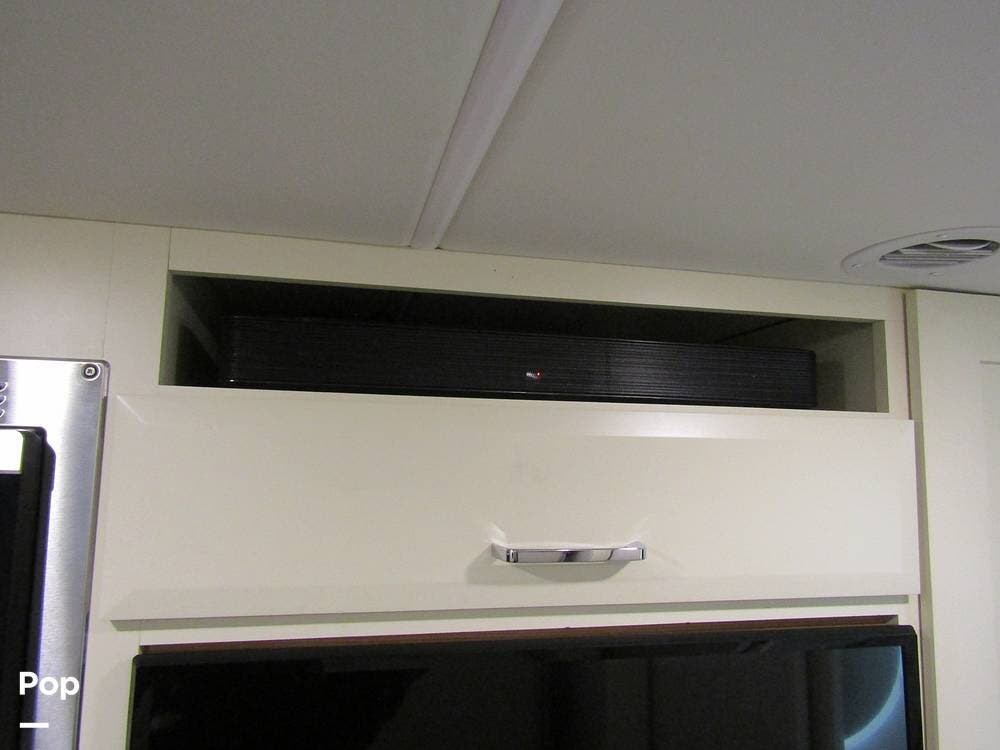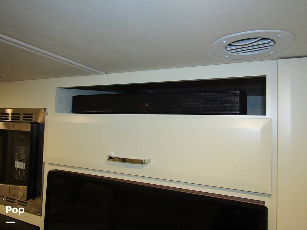 Internally, it is equipped with a leather dual reclining theater seat with power recline and console storage. Across from it, you'll see lots of kitchen counter space as well as solid countertops, a stainless steel microwave and refrigerator, and an induction stove top burner. Towards the rear, you'll find a leather sofa with cup holders that converts to a queen Murphy bed. She also has a Red Devil central vacuum system, two interior TVs, a sound bar, and a CD/DVD player.