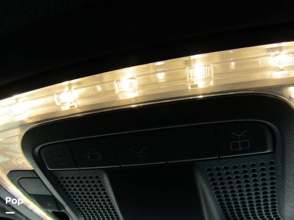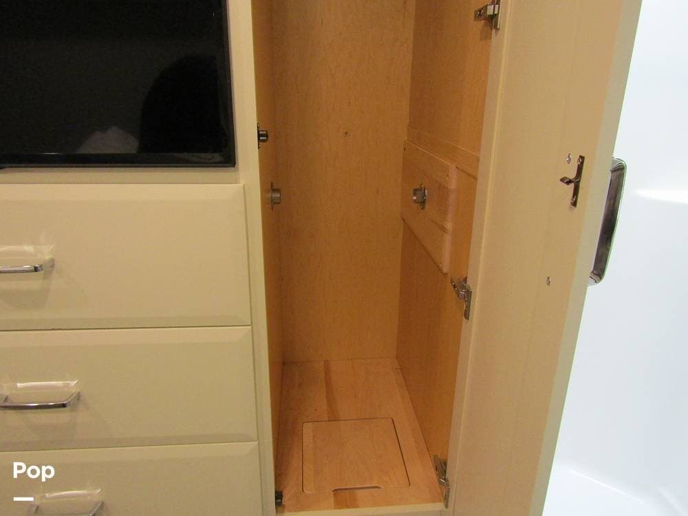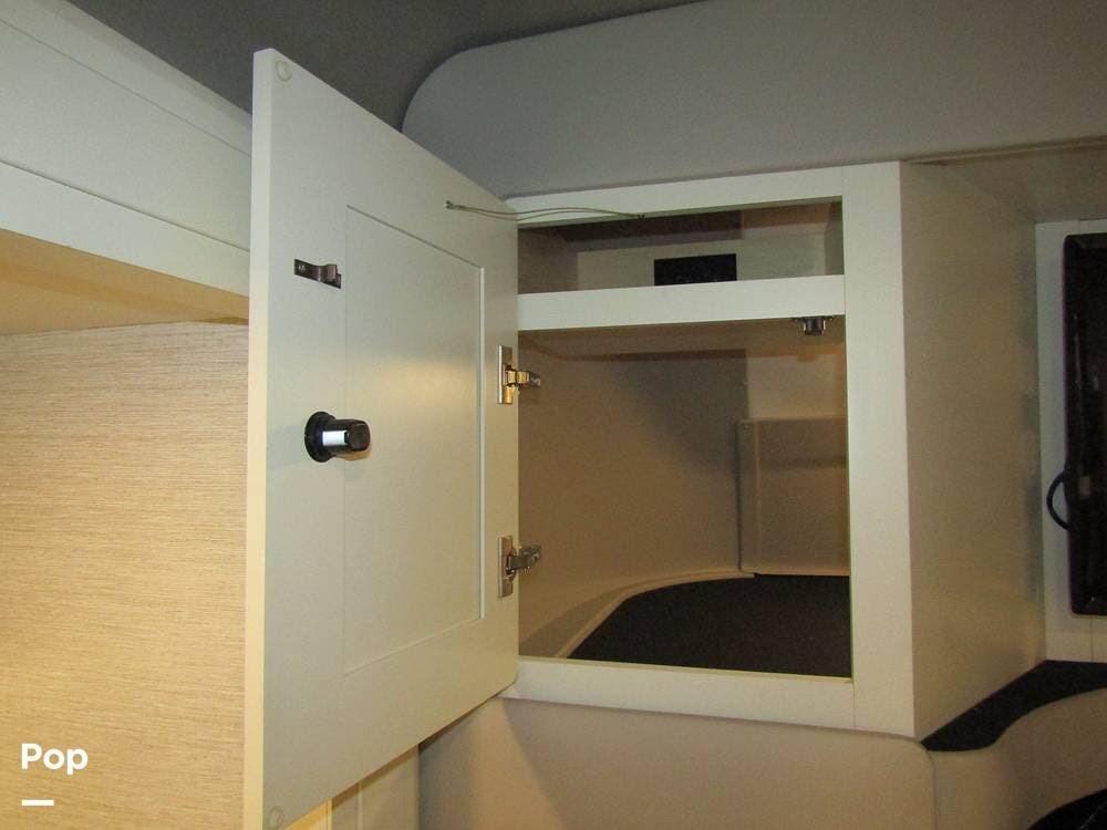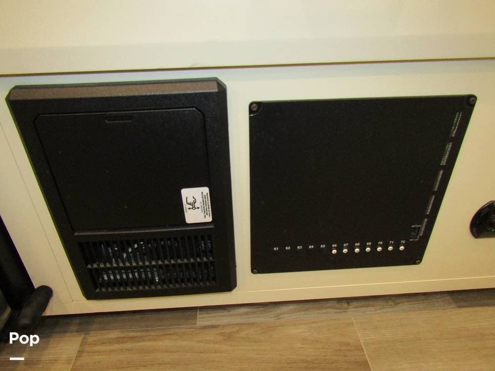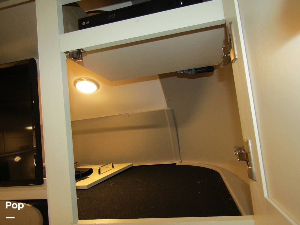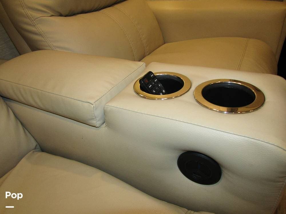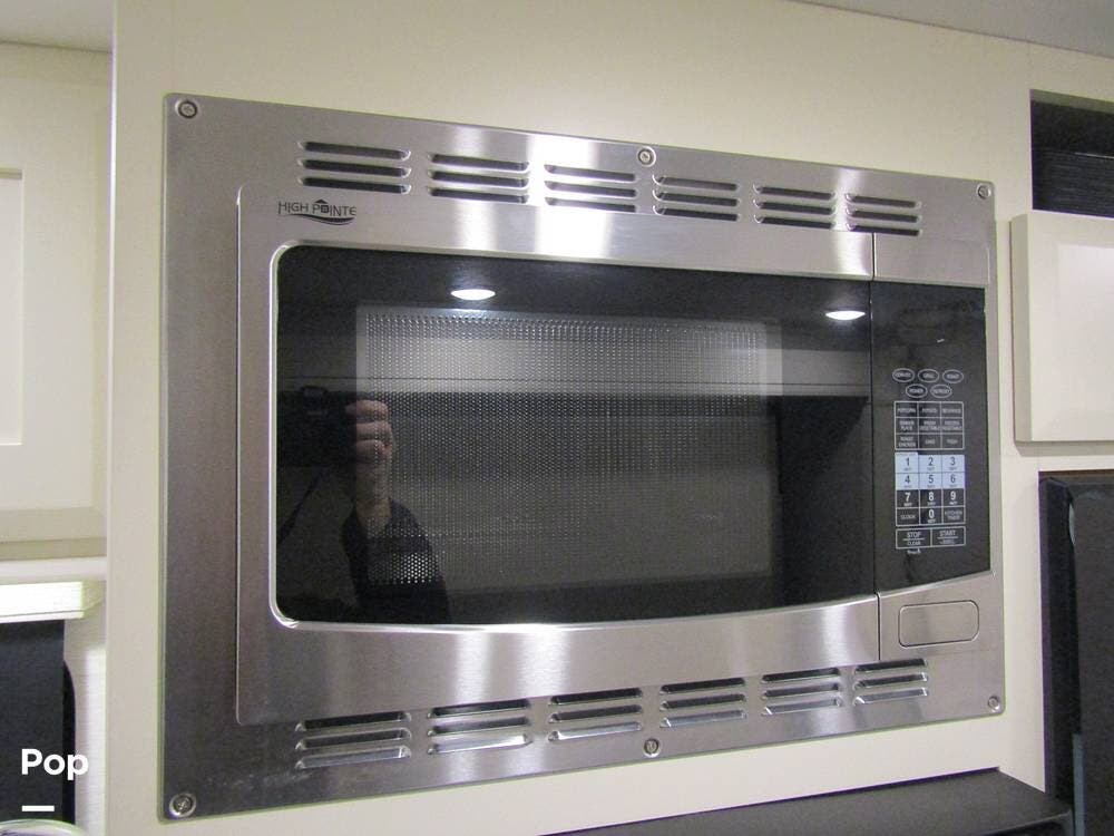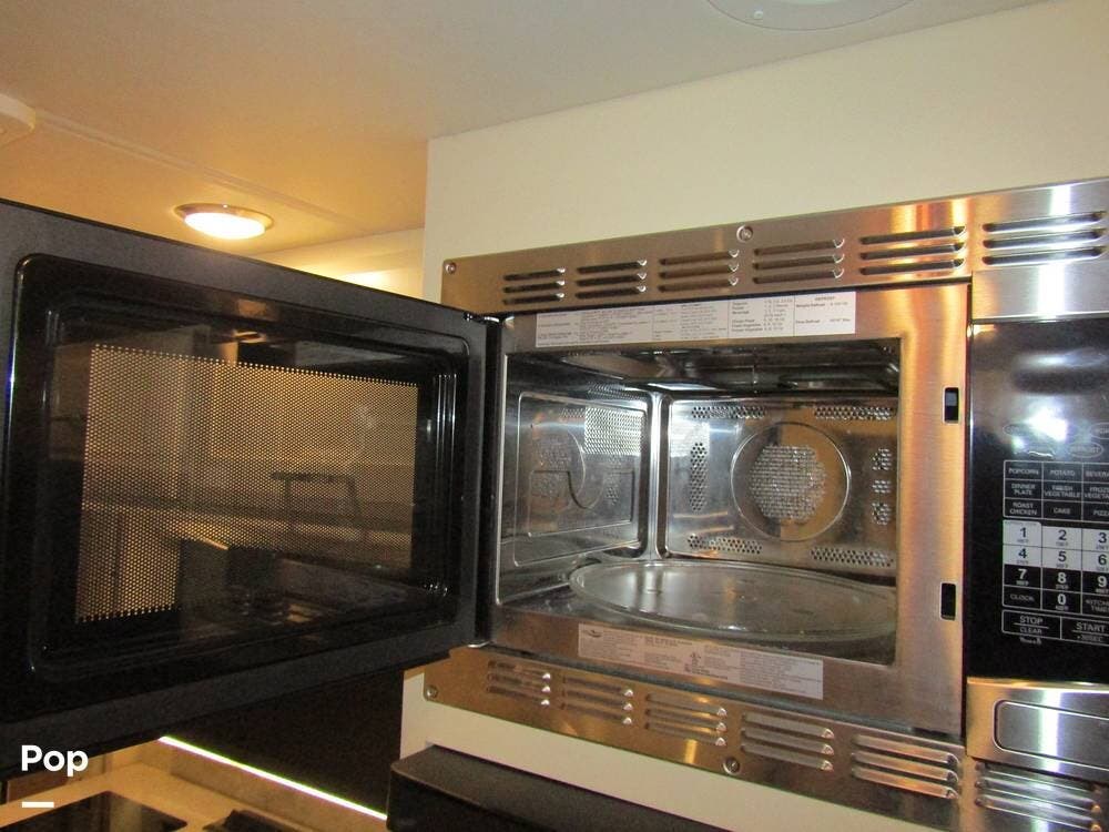 Internally, it is equipped with a leather dual reclining theater seat with power recline and console storage. Across from it, you'll see lots of kitchen counter space as well as solid countertops, a stainless steel microwave and refrigerator, and an induction stove top burner. Towards the rear, you'll find a leather sofa with cup holders that converts to a queen Murphy bed. She also has a Red Devil central vacuum system, two interior TVs, a sound bar, and a CD/DVD player.