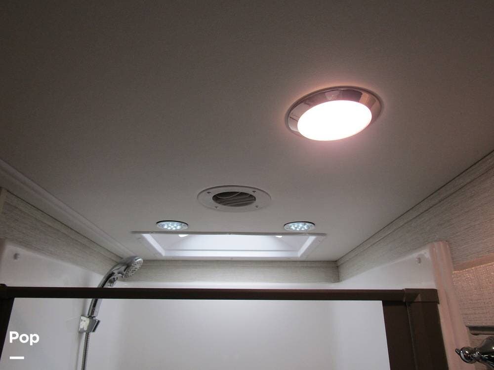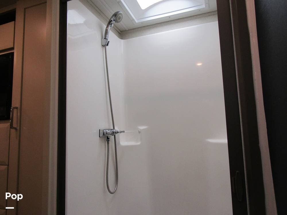 In the very back is a full-size bathroom with a large shower, roof vents, and an on-demand hot water system.