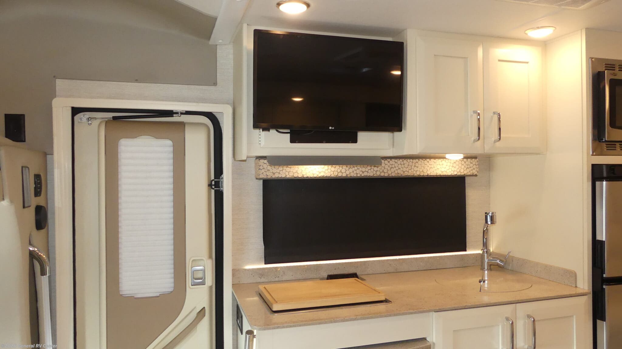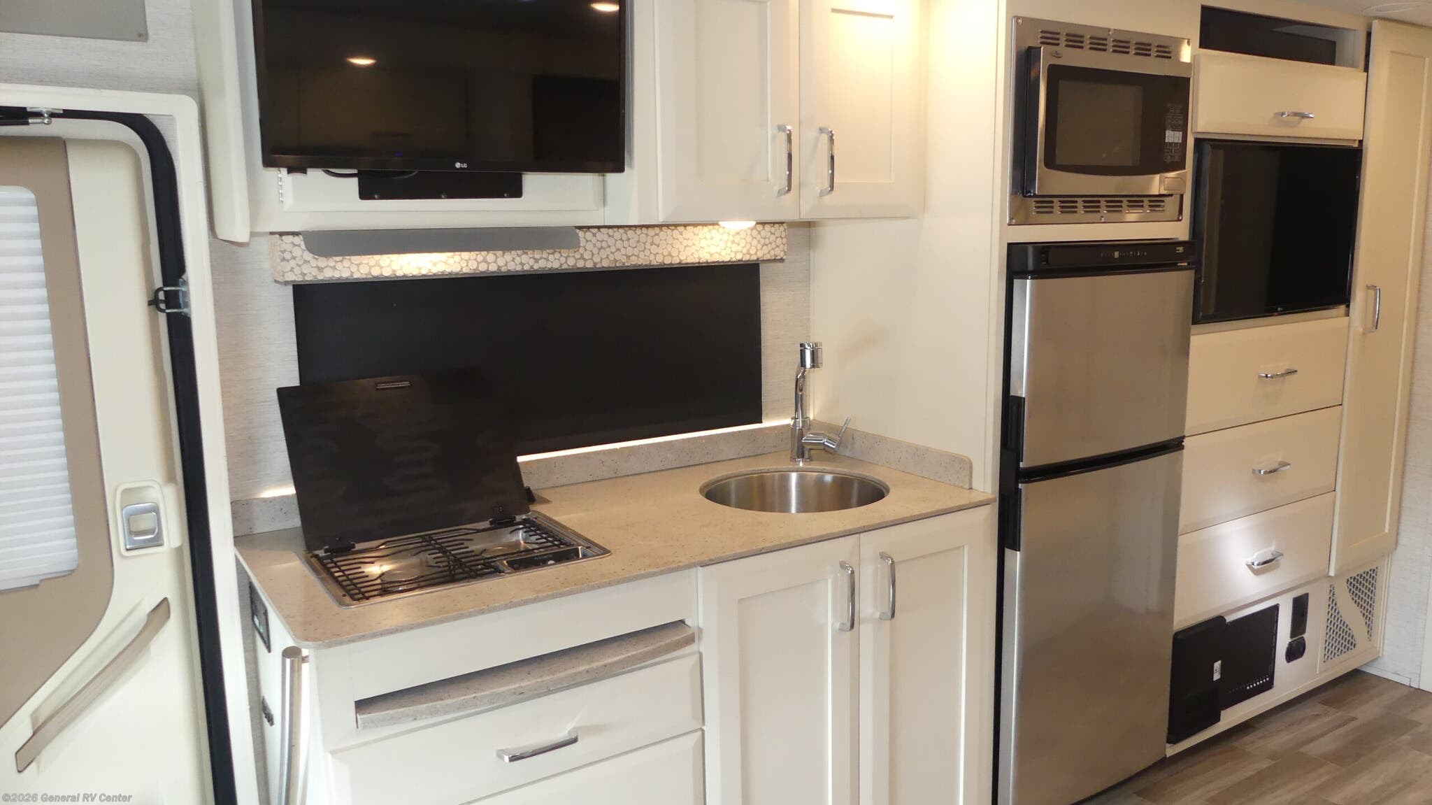 Tiffin Motorhomes Wayfarer Class C diesel motorhome 25 RW highlights: Rear Bathroom Murphy Bed Bedroom TV Countertop Extension Bedroom Wardrobe Bunk Over Cab Maximize space and comfort each time you travel in this coach. The queen Murphy bed and sofa allow you to increase your living area each morning after waking up from a good night's rest. You can get cleaned up in the full rear bathroom with space savings sliding door and grab your clothing from the wardrobe or cabinet in front of the bed. There is a 32" TV to watch as well. The booth dinette allows two people to dine, two seatbelts for traveling and a space for one to sleep. The bunk over the cab is another space available for your overnights guests, yet you can choose to add the optional entertainment center in its place. The cook will love the galley kitchen with everything at their fingertips including a handy countertop extension and convection microwave. With each Wayfarer Class C diesel motorhome by Tiffin Motorhomes you will enjoy the ride as much as the destination with the ergonomic heated seats, the 10.25" Mercedes-Benz User Experience (MBUX) multimedia system with in-dash navigation as well as the Mercedes chassis and turbo diesel engine offering high-performance. The interior offers plenty of storage for clothing, linens and such as well as LED reading lights, inverted outlets in the bedroom for a CPAP machine, kitchen over and under-the-counter lighting, plus more! Take a Wayfarer on the road for any reason you want, either maximum spatial efficiency, ample storage and/or luxury features!