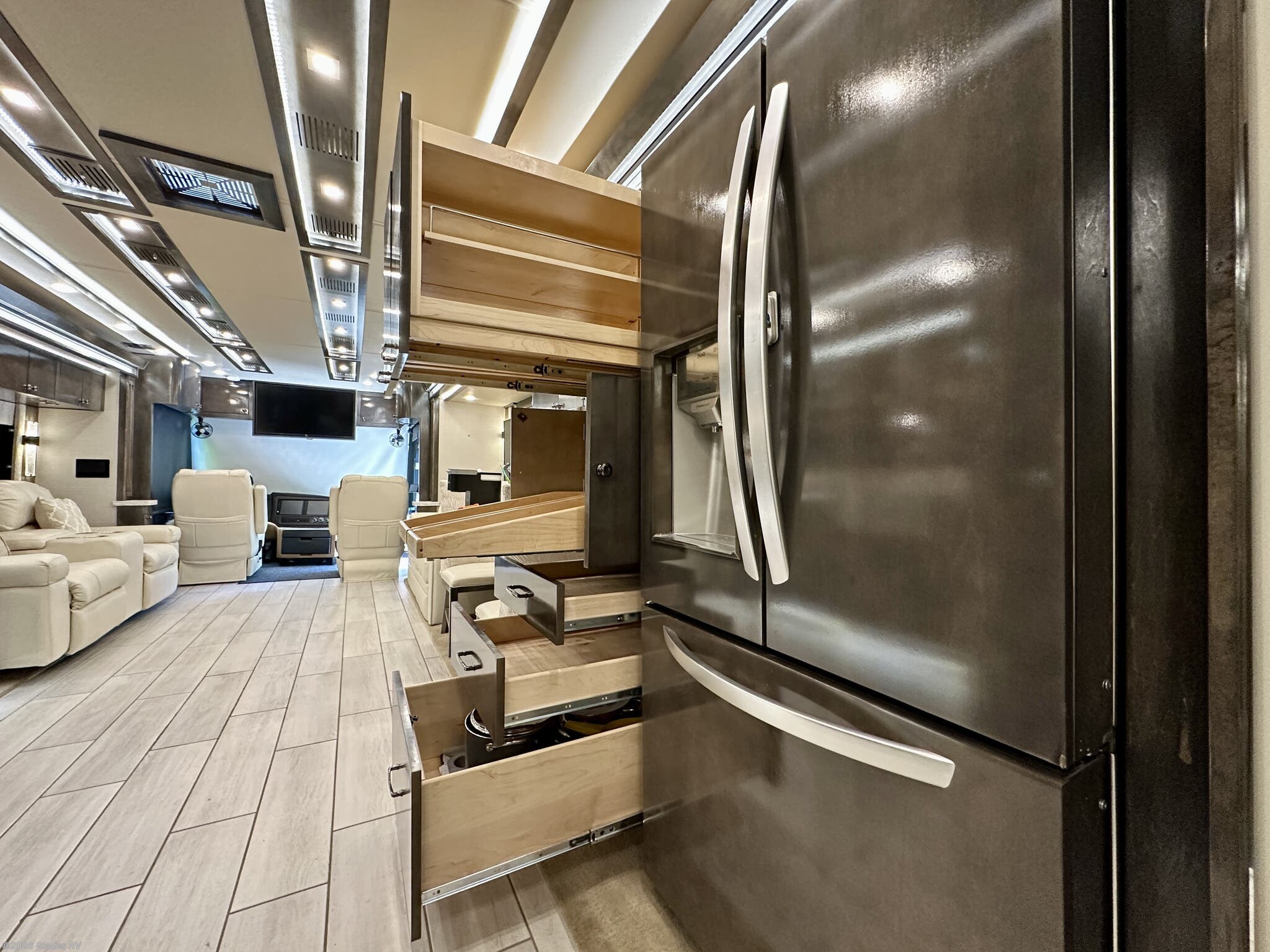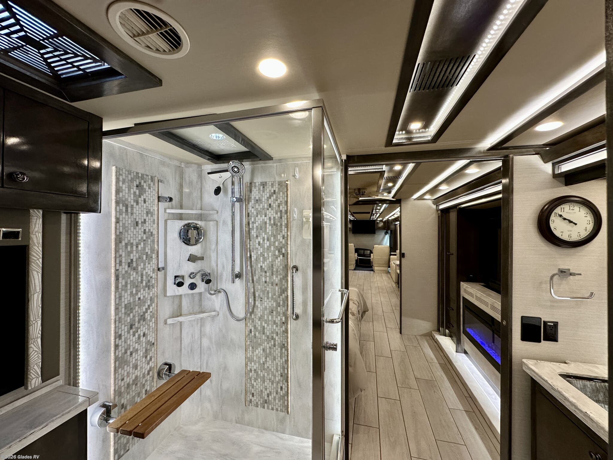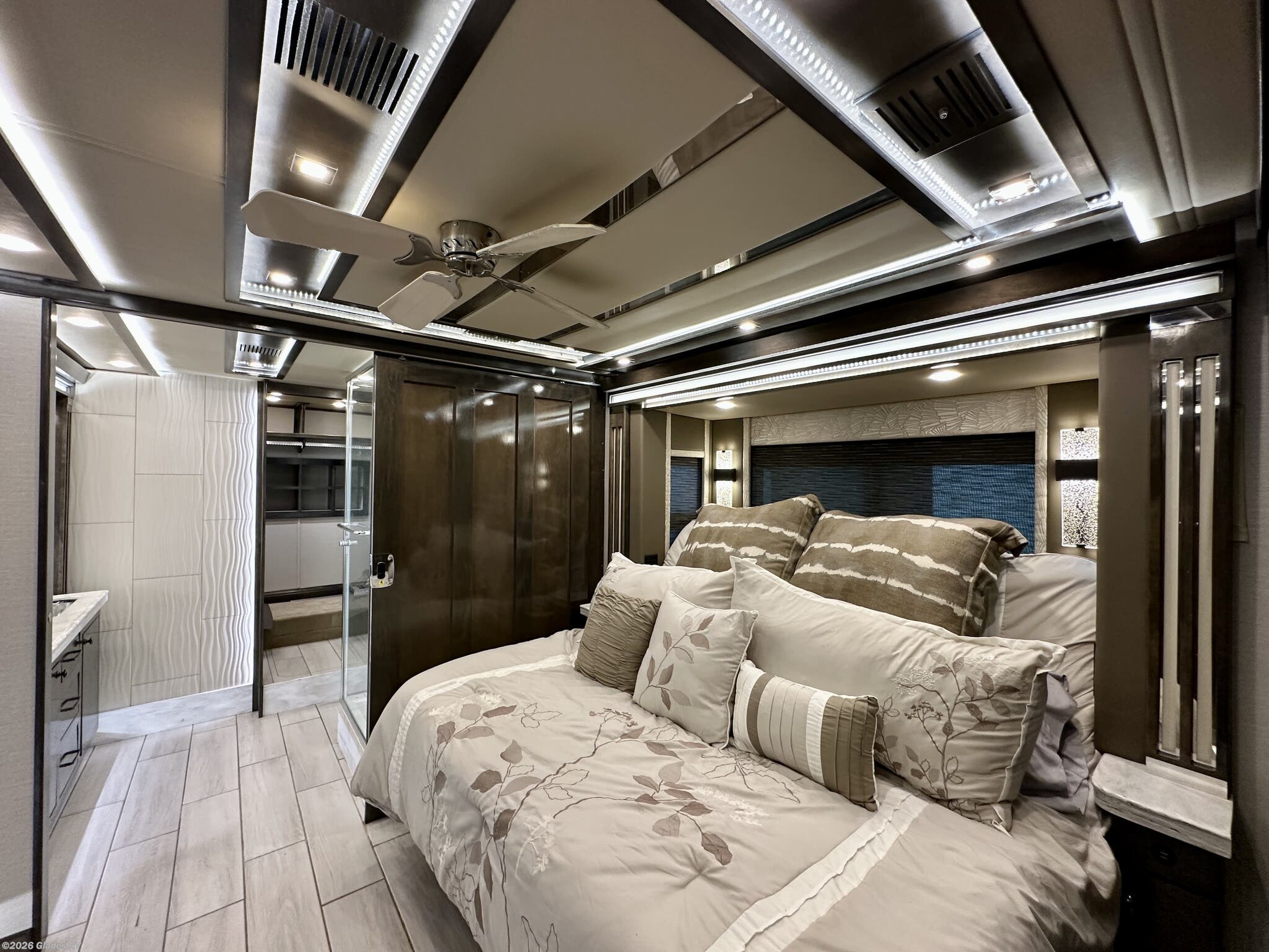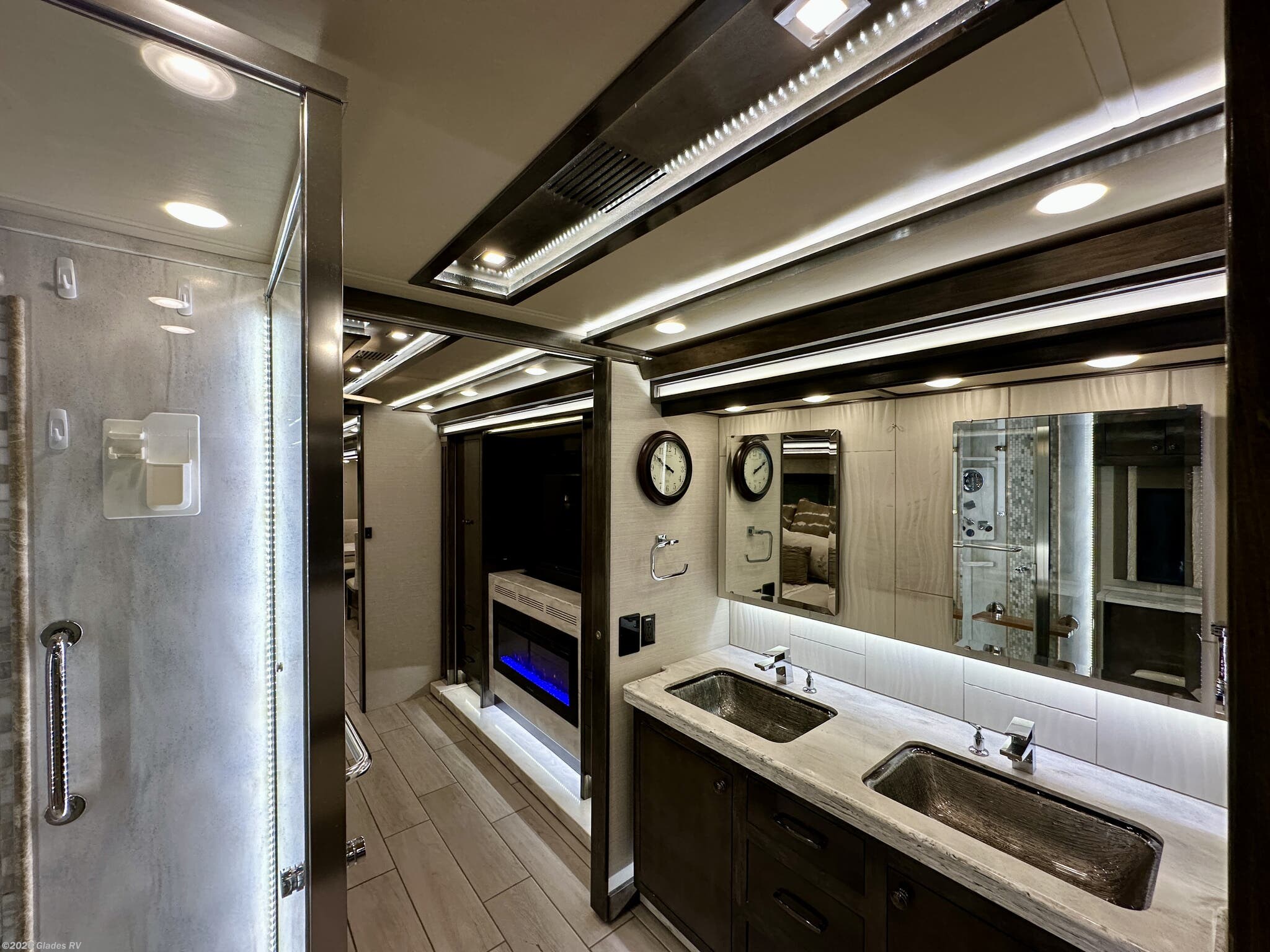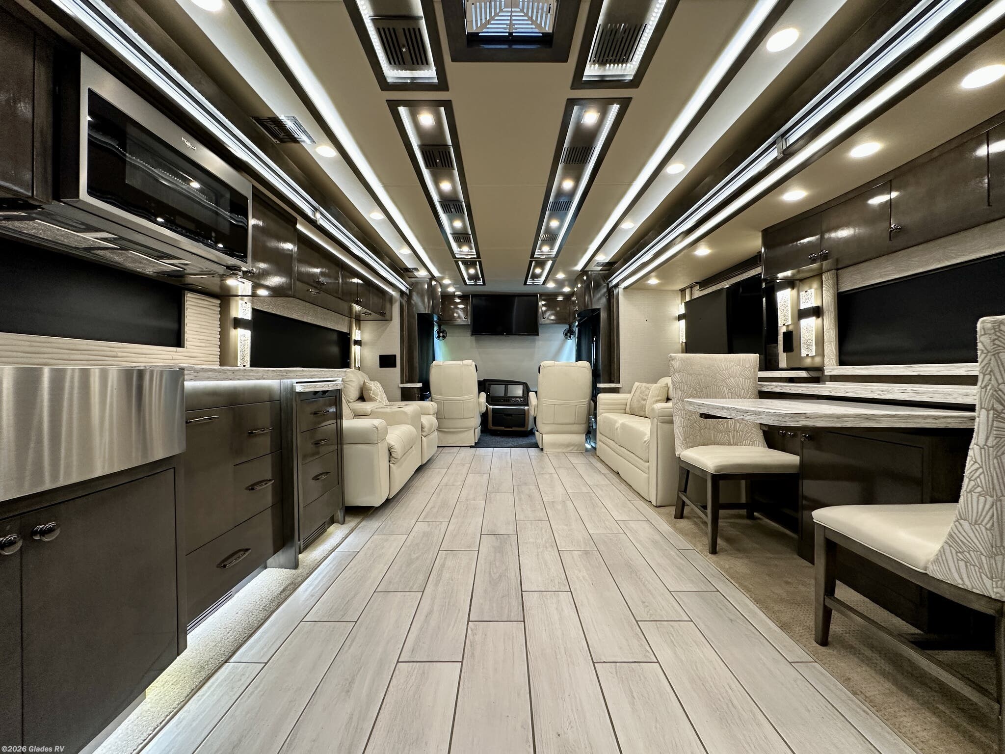AUTO HYDRAULIC & AIR LEVELING, POWER INTEGRATED AWNINGS, SLIDE TRAYS IN BASEMENT, FIREPLACE, TELEVATOR TVS, HYDRONIC HEATING, POWER DAY/NIGHT SHADES, STACKED WASHER & DRYER, THEATER SEATS, OUTSIDE ENTERTAINMENT, HEATED FLOORS, KING BED, RESIDENTIAL REFRIGERATOR, OUTSIDE FREEZER, POWER WINDOW AWNINGS AND MUCH MORE...