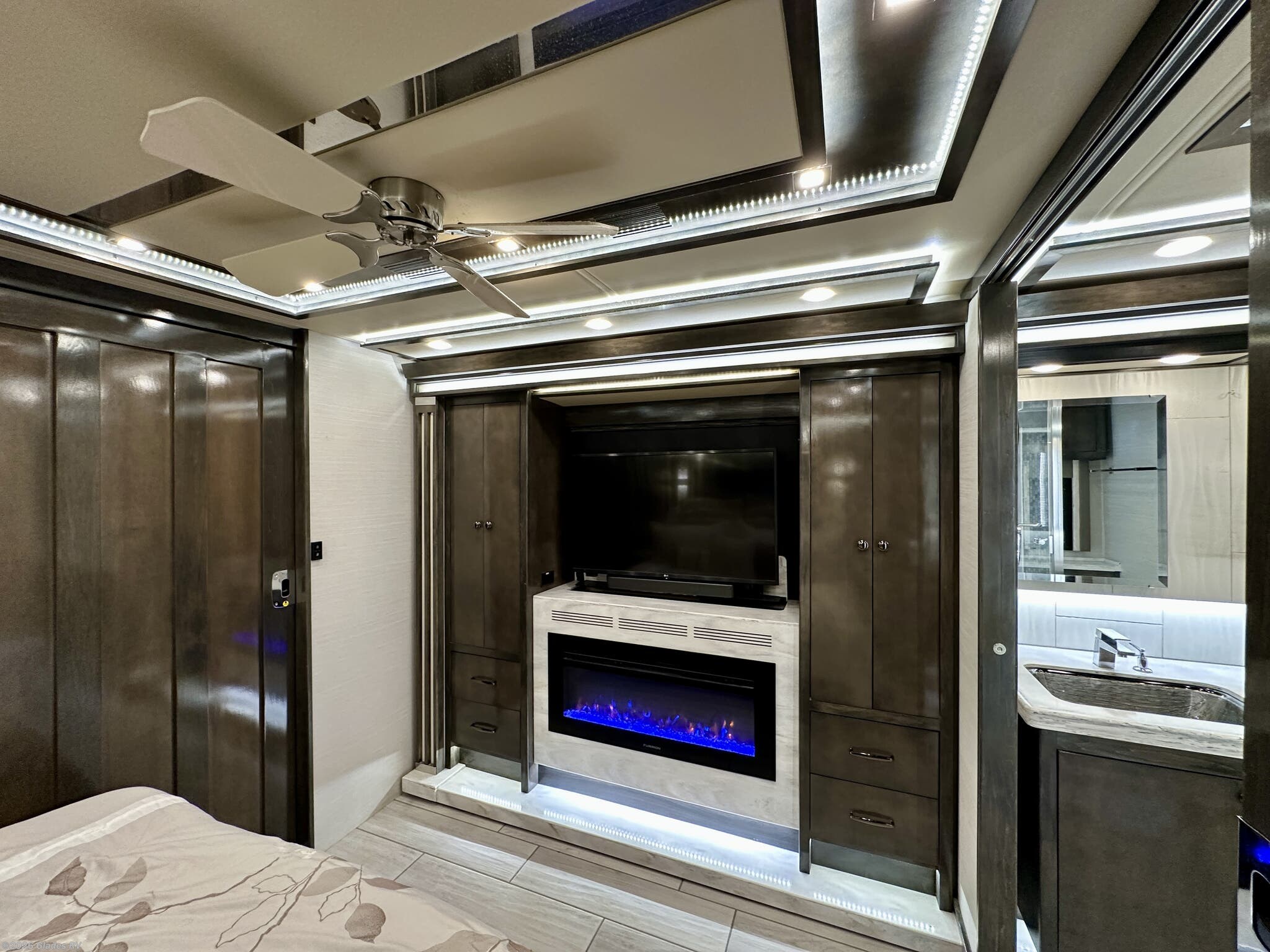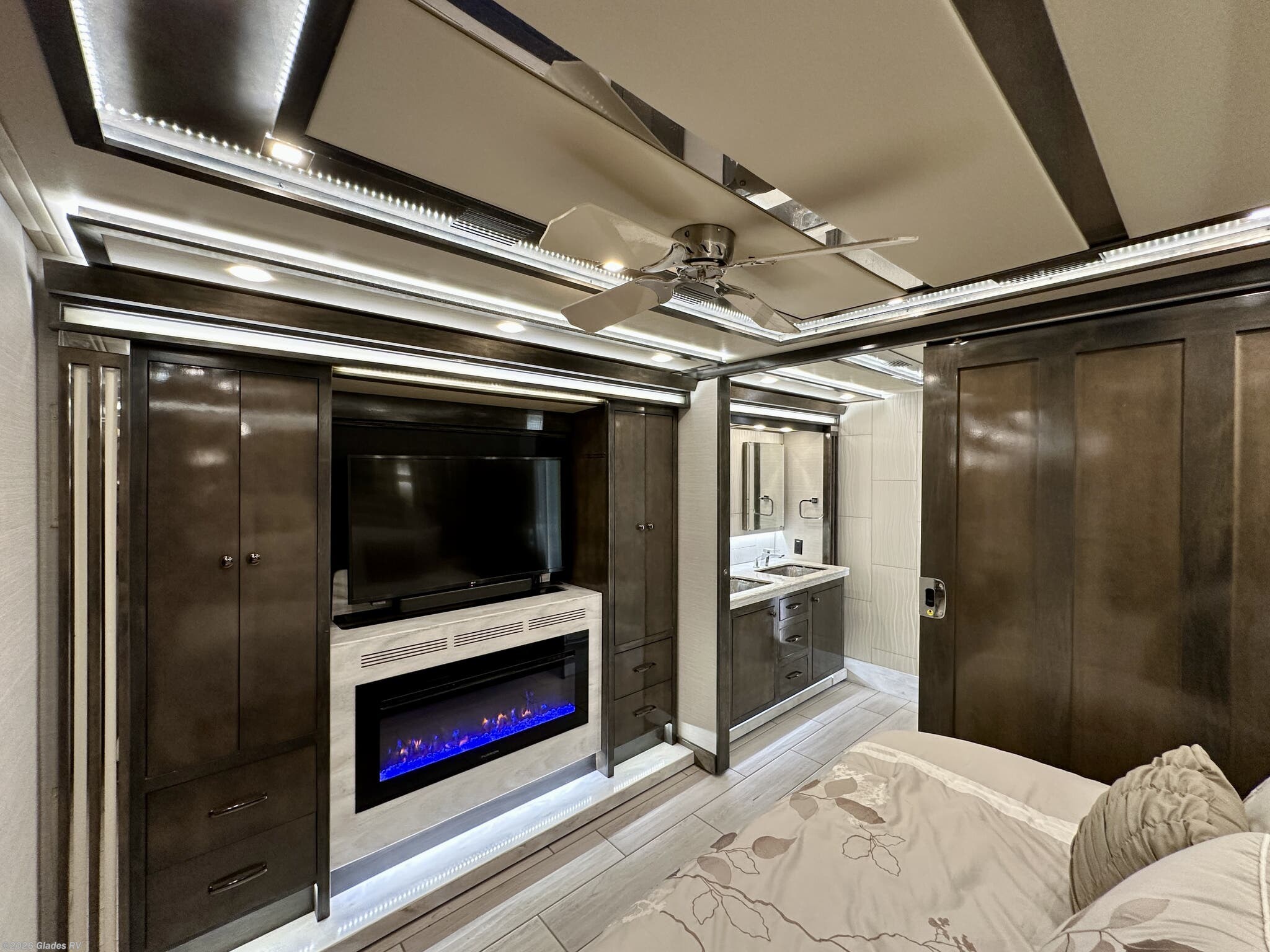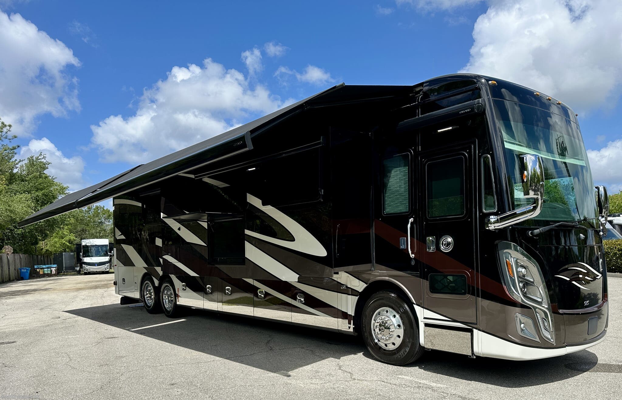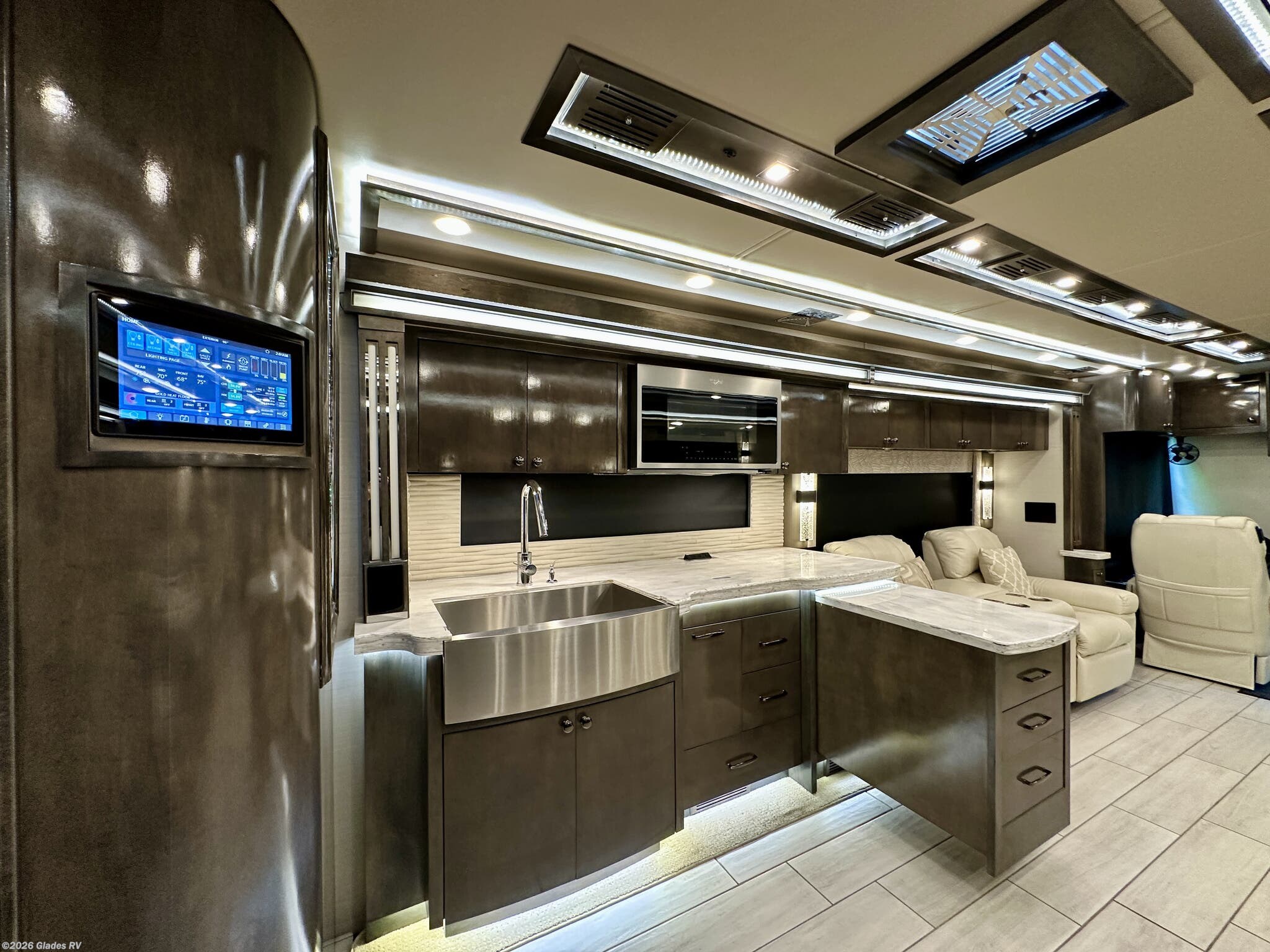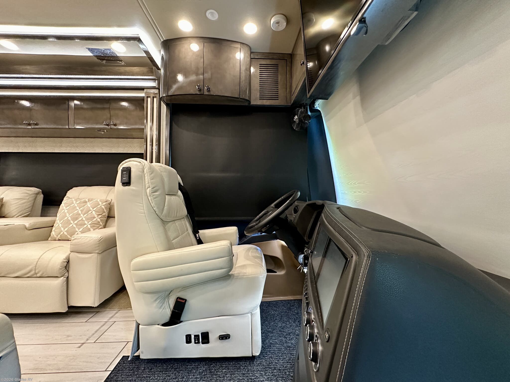 AUTO HYDRAULIC & AIR LEVELING, POWER INTEGRATED AWNINGS, SLIDE TRAYS IN BASEMENT, FIREPLACE, TELEVATOR TVS, HYDRONIC HEATING, POWER DAY/NIGHT SHADES, STACKED WASHER & DRYER, THEATER SEATS, OUTSIDE ENTERTAINMENT, HEATED FLOORS, KING BED, RESIDENTIAL REFRIGERATOR, OUTSIDE FREEZER, POWER WINDOW AWNINGS AND MUCH MORE...