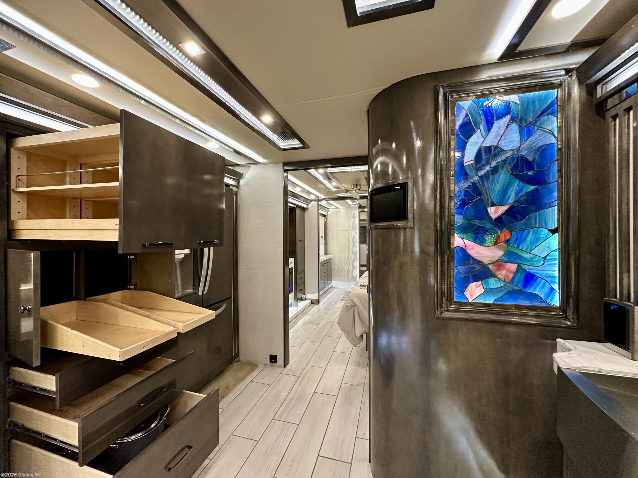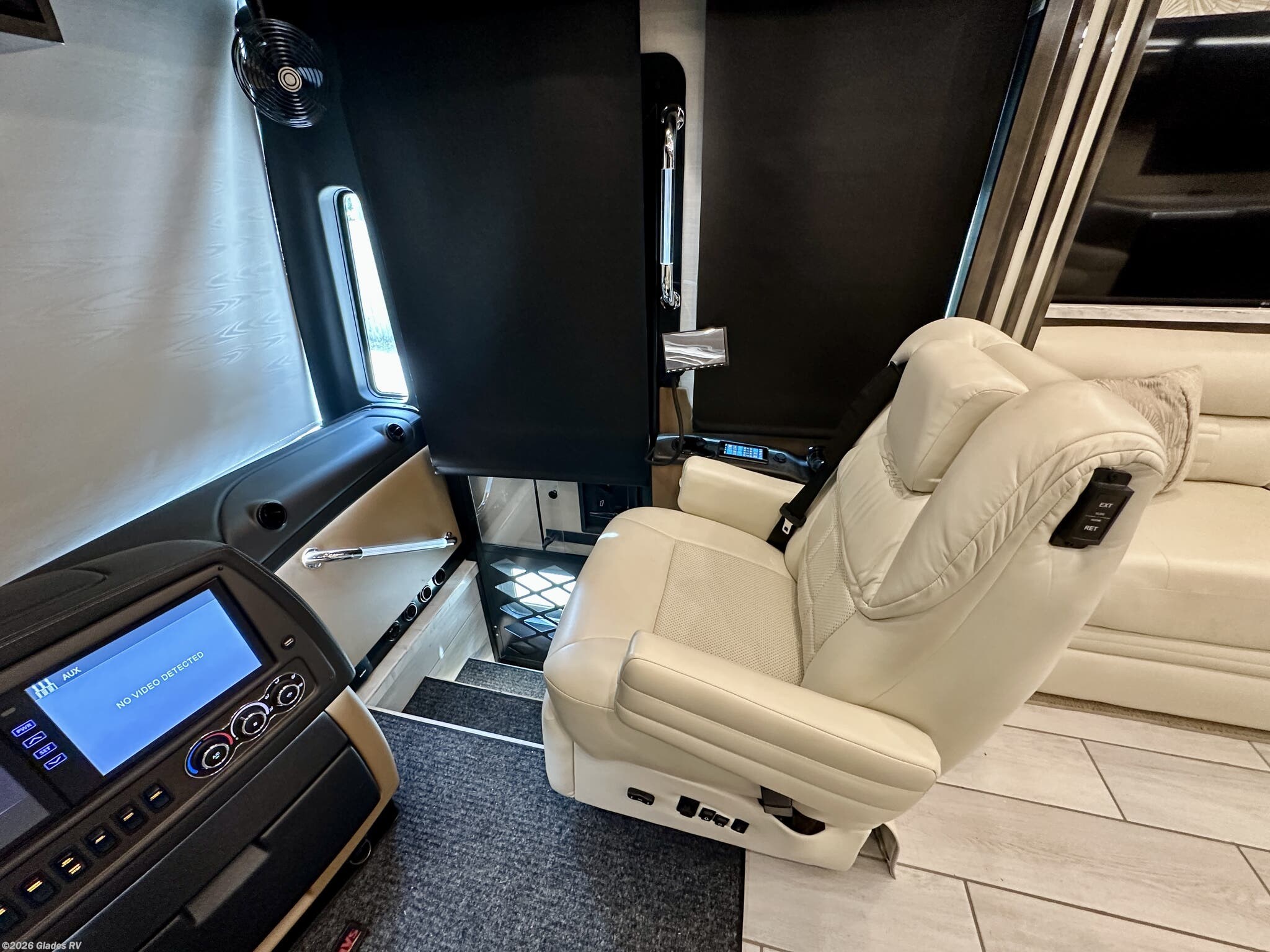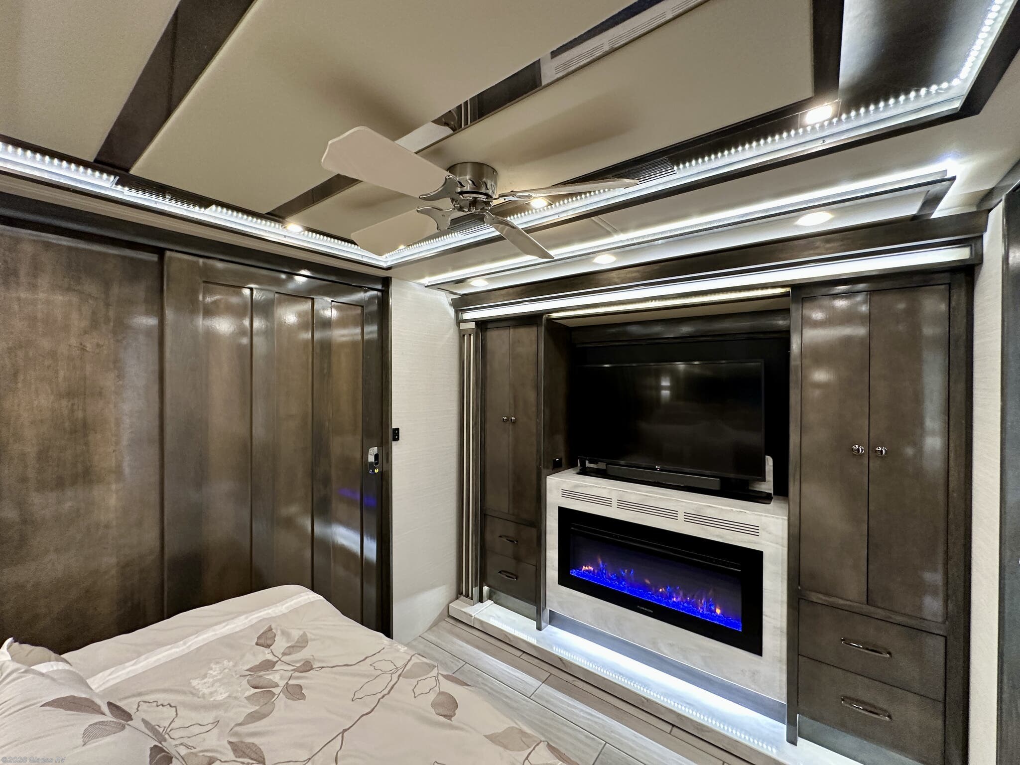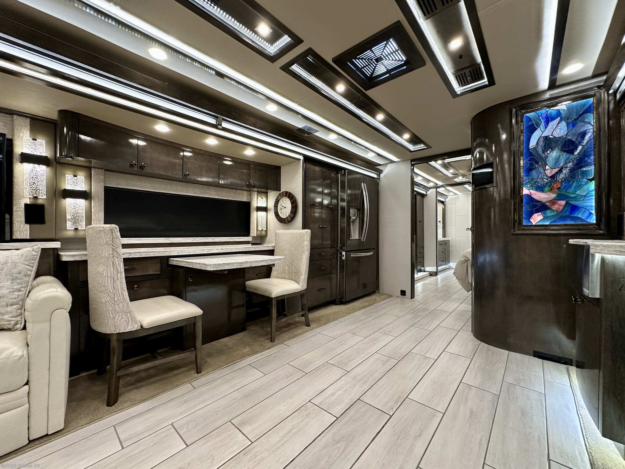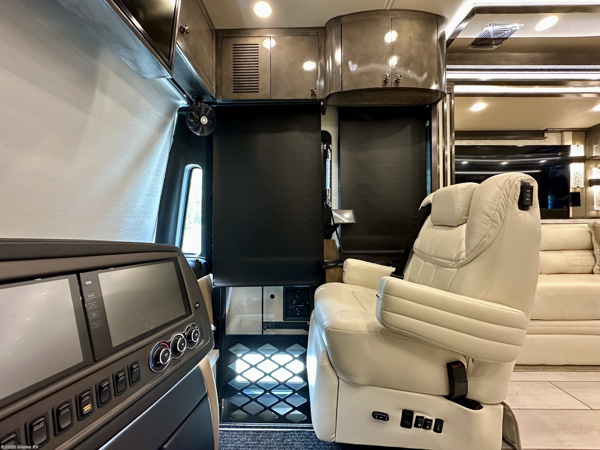 AUTO HYDRAULIC & AIR LEVELING, POWER INTEGRATED AWNINGS, SLIDE TRAYS IN BASEMENT, FIREPLACE, TELEVATOR TVS, HYDRONIC HEATING, POWER DAY/NIGHT SHADES, STACKED WASHER & DRYER, THEATER SEATS, OUTSIDE ENTERTAINMENT, HEATED FLOORS, KING BED, RESIDENTIAL REFRIGERATOR, OUTSIDE FREEZER, POWER WINDOW AWNINGS AND MUCH MORE...