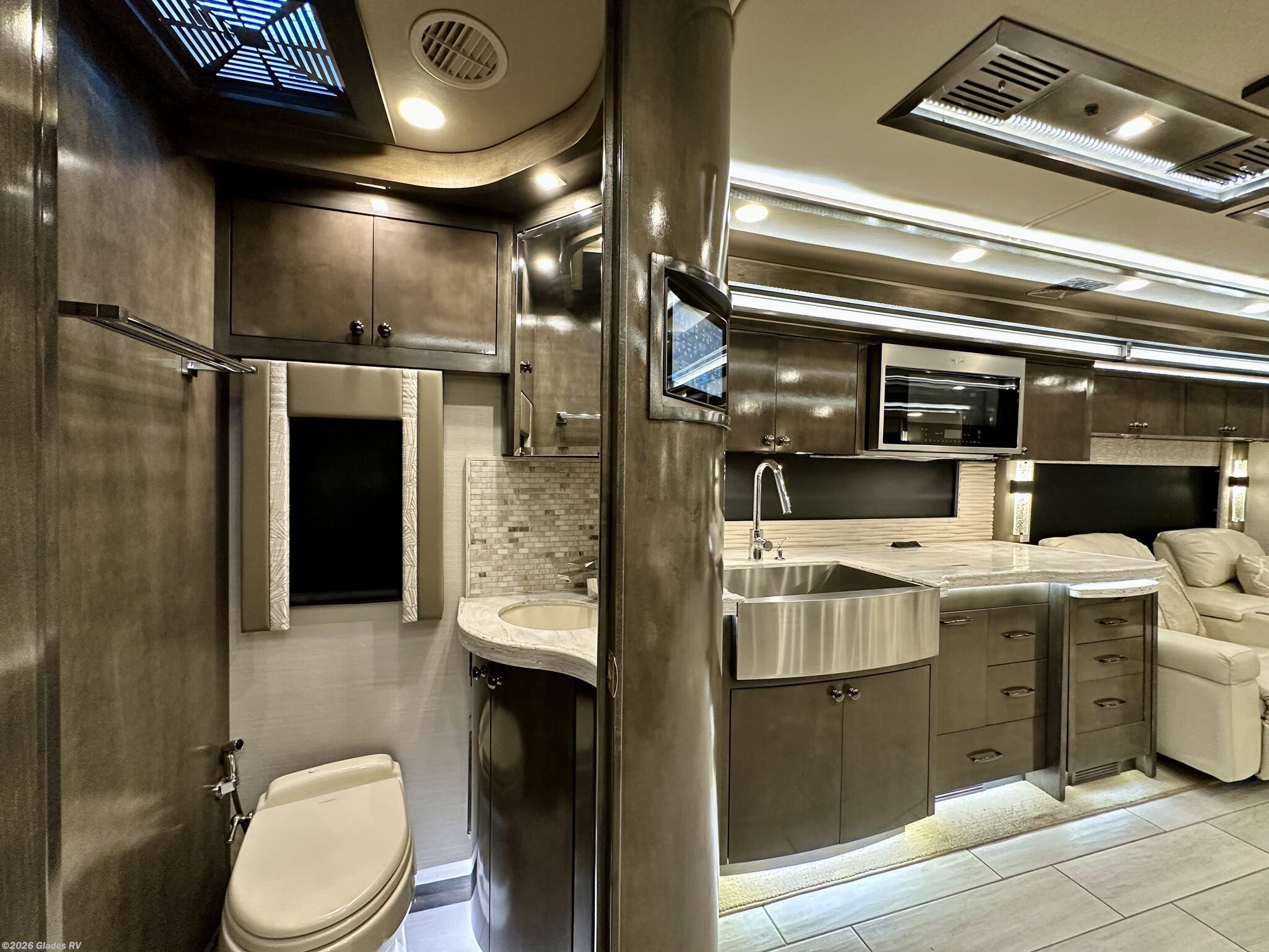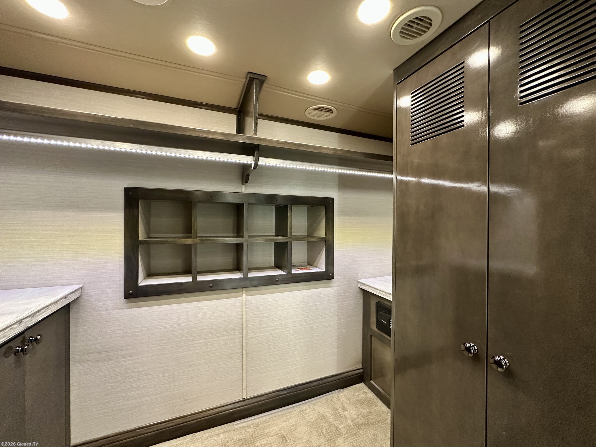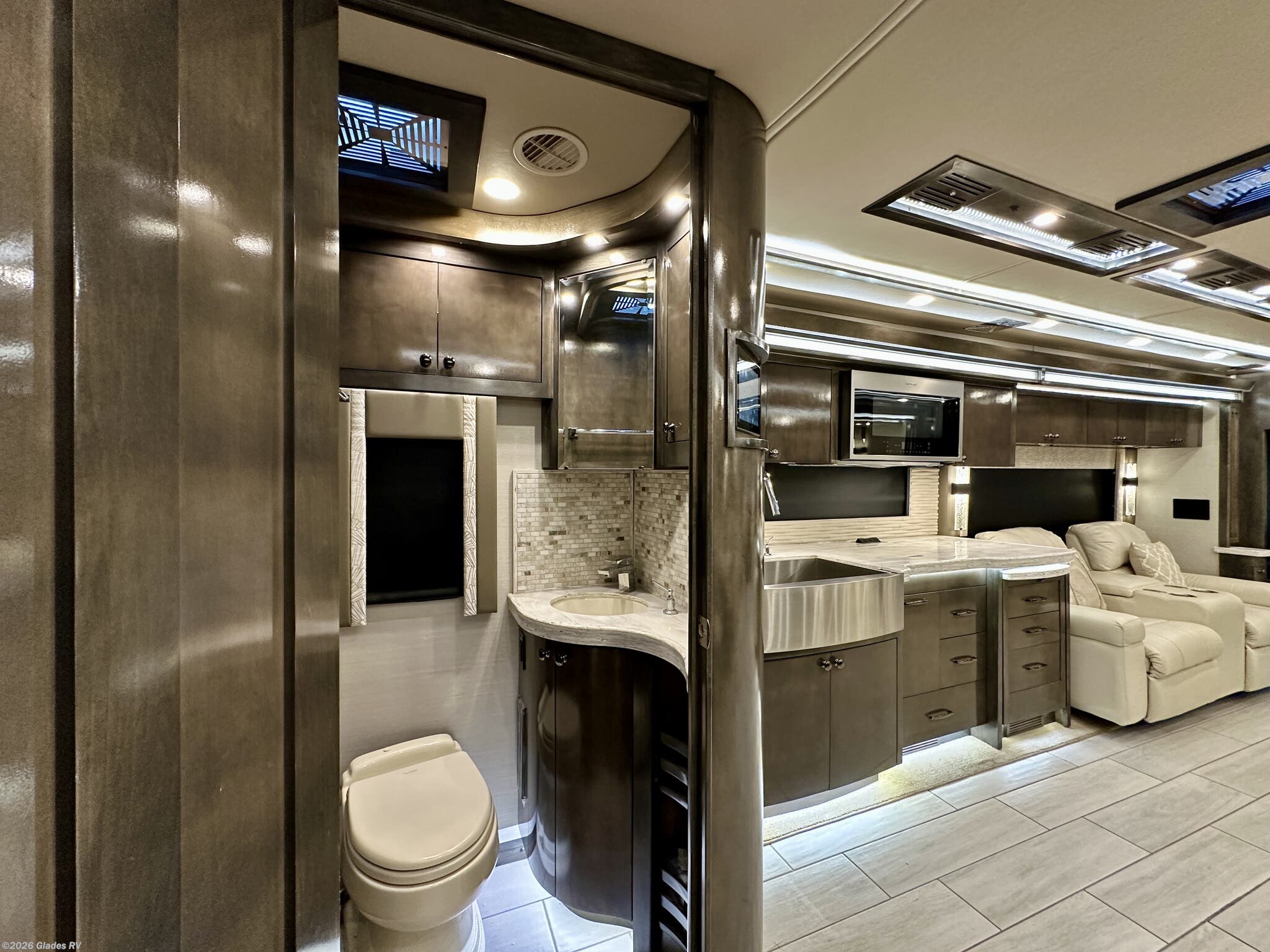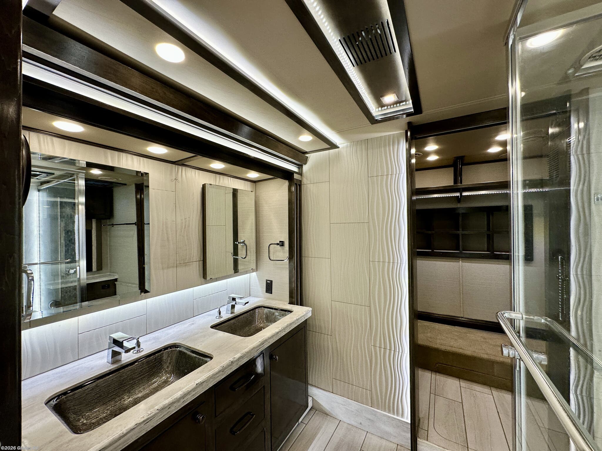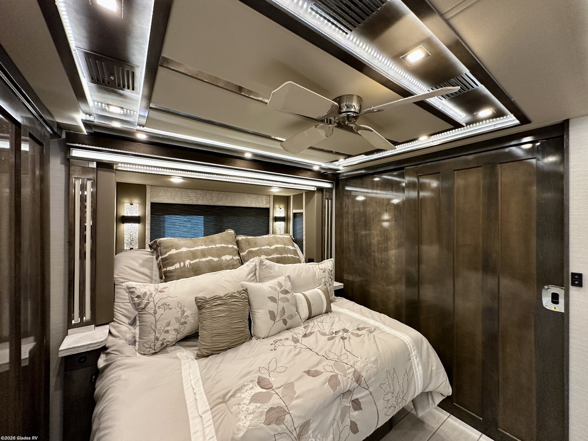 AUTO HYDRAULIC & AIR LEVELING, POWER INTEGRATED AWNINGS, SLIDE TRAYS IN BASEMENT, FIREPLACE, TELEVATOR TVS, HYDRONIC HEATING, POWER DAY/NIGHT SHADES, STACKED WASHER & DRYER, THEATER SEATS, OUTSIDE ENTERTAINMENT, HEATED FLOORS, KING BED, RESIDENTIAL REFRIGERATOR, OUTSIDE FREEZER, POWER WINDOW AWNINGS AND MUCH MORE...