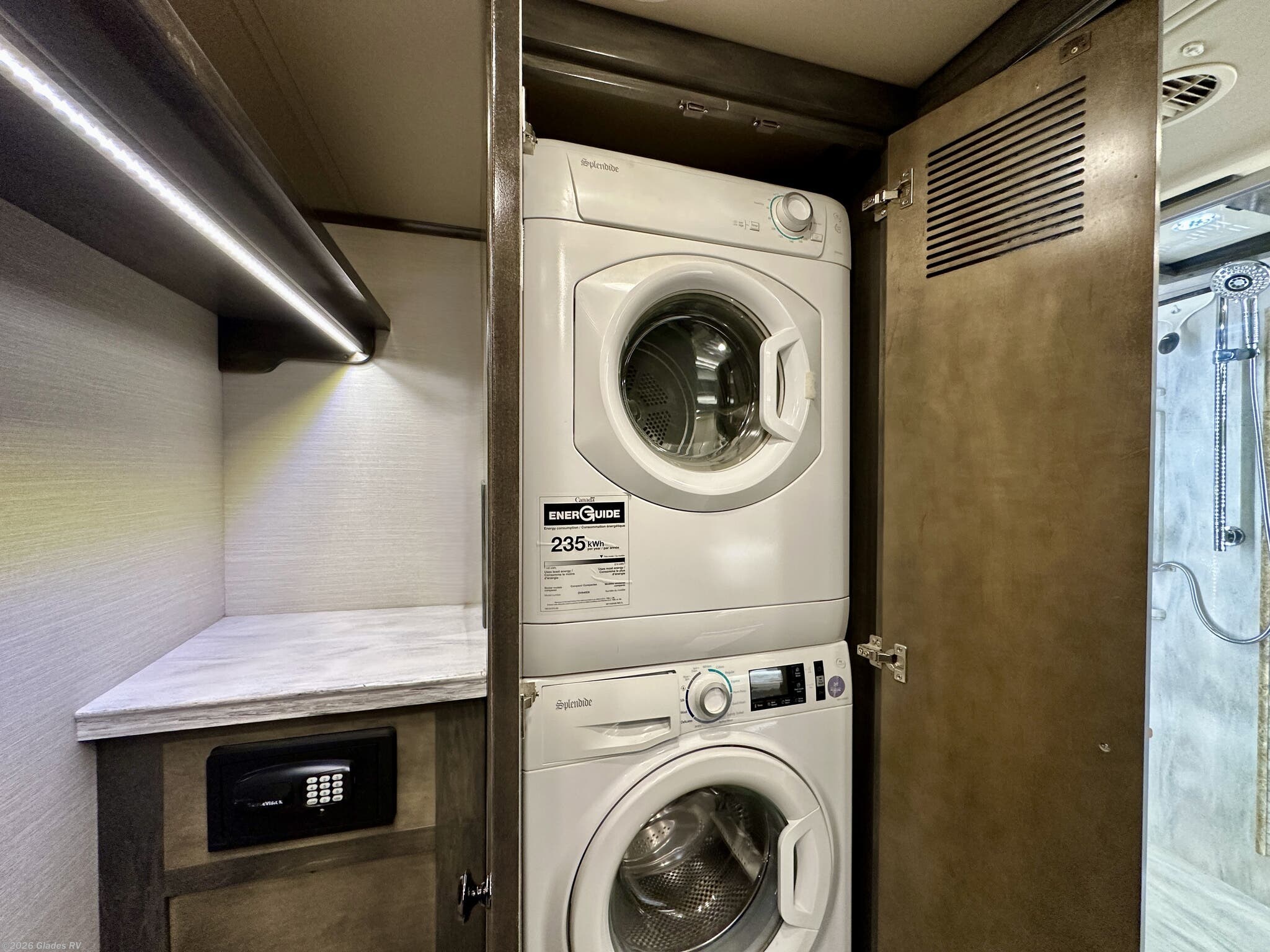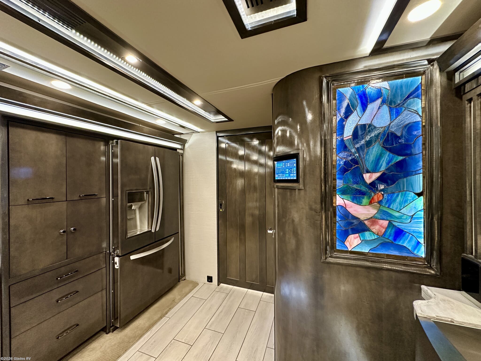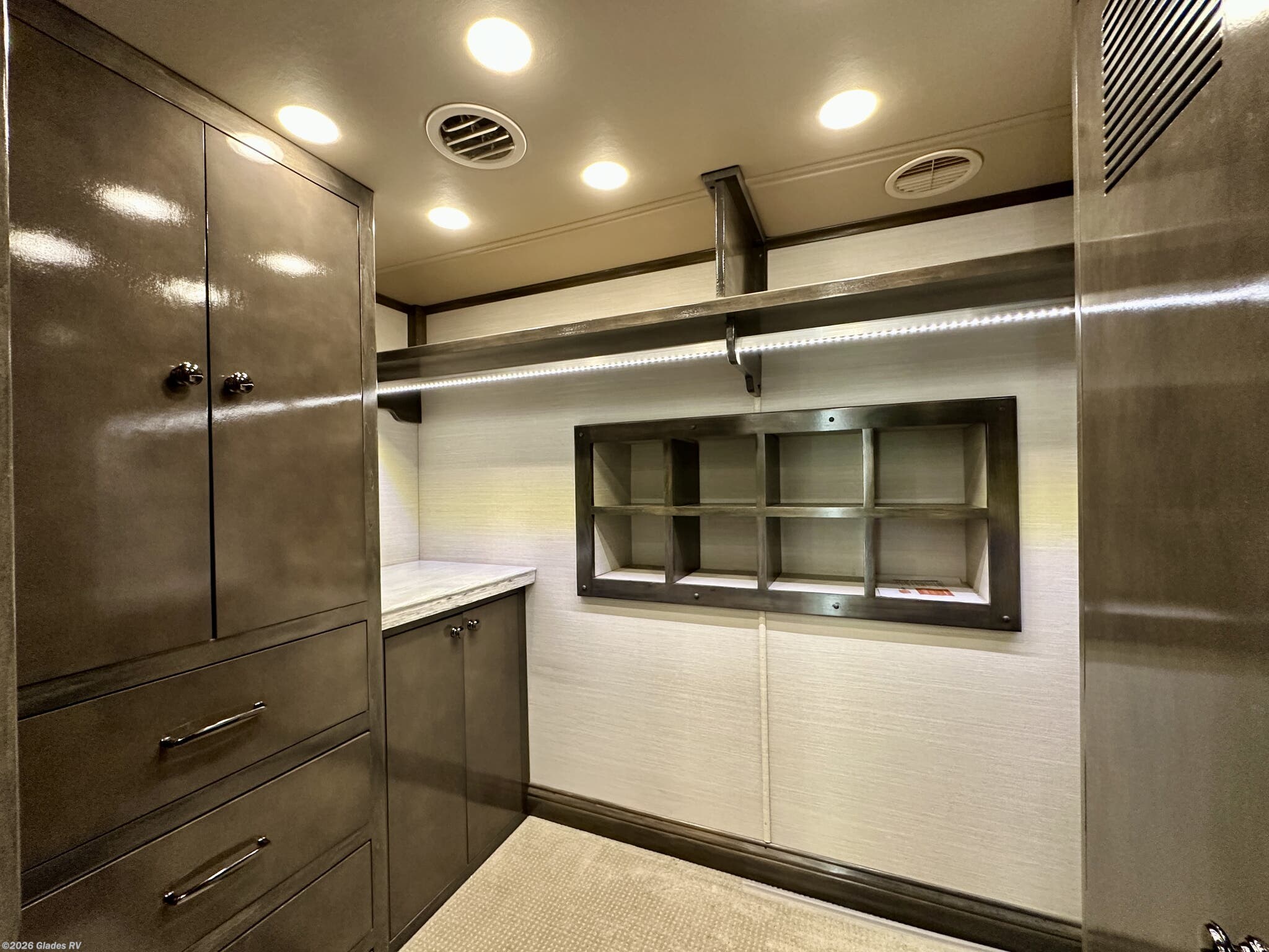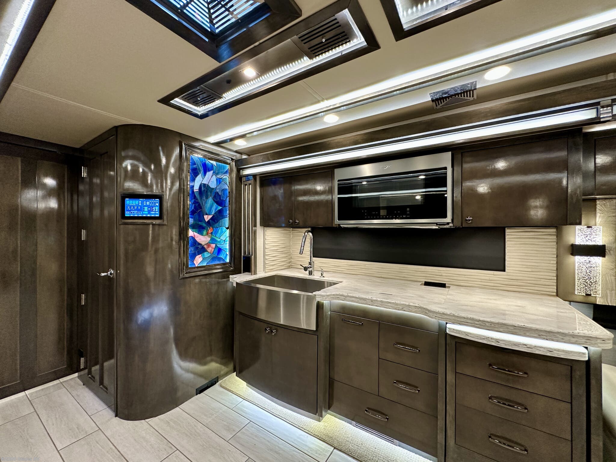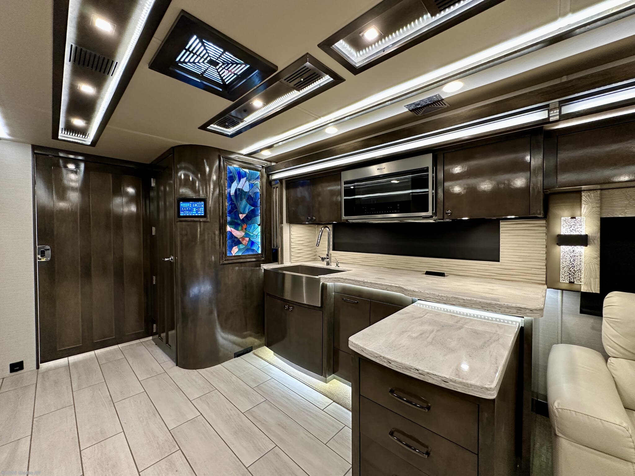 AUTO HYDRAULIC & AIR LEVELING, POWER INTEGRATED AWNINGS, SLIDE TRAYS IN BASEMENT, FIREPLACE, TELEVATOR TVS, HYDRONIC HEATING, POWER DAY/NIGHT SHADES, STACKED WASHER & DRYER, THEATER SEATS, OUTSIDE ENTERTAINMENT, HEATED FLOORS, KING BED, RESIDENTIAL REFRIGERATOR, OUTSIDE FREEZER, POWER WINDOW AWNINGS AND MUCH MORE...