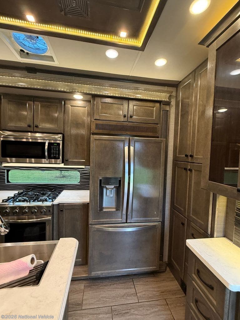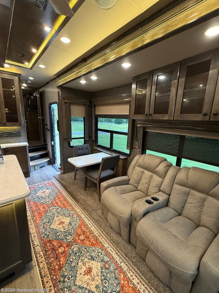Inside, you?ll find a beautifully designed living area featuring solid hardwood cabinetry, residential furnishings, and a spacious rear living floorplan with opposing slides. The dual recliners, fireplace, and large HDTV create a relaxing environment, while the solid-surface countertops, center island, and residential-size fridge with woodgrain front panels elevate the kitchen?s appeal. A dishwasher and washer/dryer add everyday convenience.