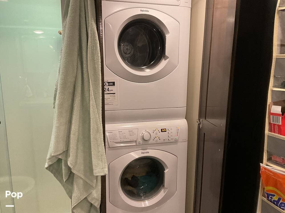 The bathroom is stylish and functional, with a large shower, dual sinks, and a large stacked washer and dryer.