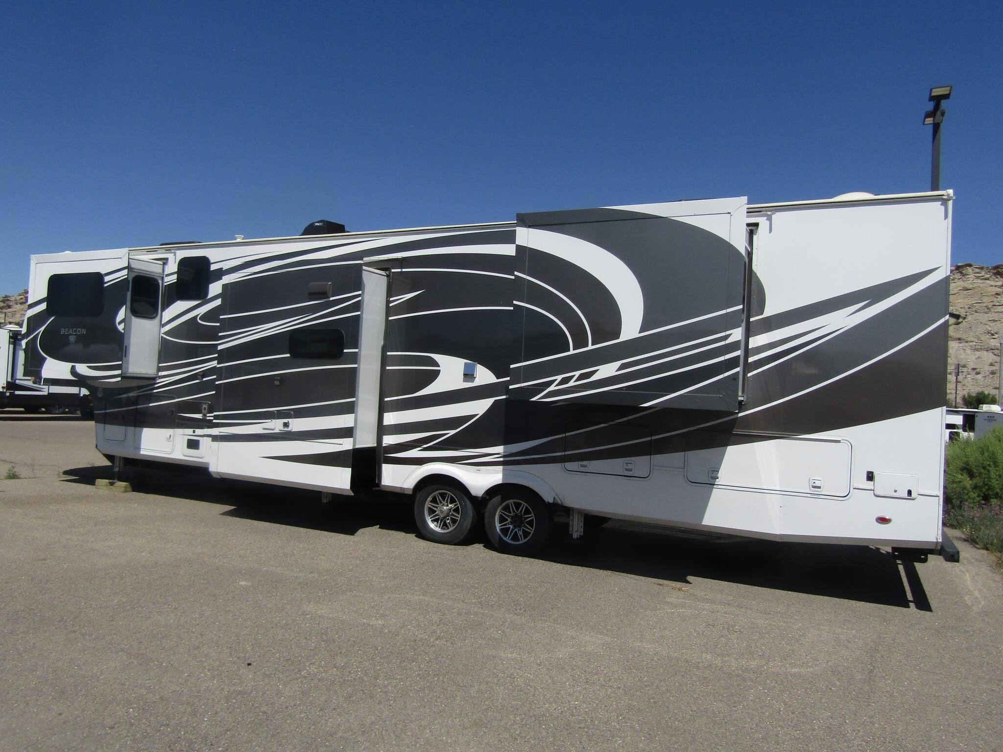 The Vanleigh Beacon features an impressive length of approximately 42 feet 4 inches and a width of about 8 feet 5 inches, providing generous space to comfortably accommodate up to eight travelers. The thoughtfully designed floorplan, model 41FLB, includes five slide-outs that expand the living area, ensuring ample room for relaxation and entertainment. The interior boasts a luxurious king-size bed for restful nights, alongside cozy rocker recliners perfect for unwinding after a day of outdoor adventures. An elegant fireplace adds warmth and ambiance, creating a cozy feel throughout the RV.