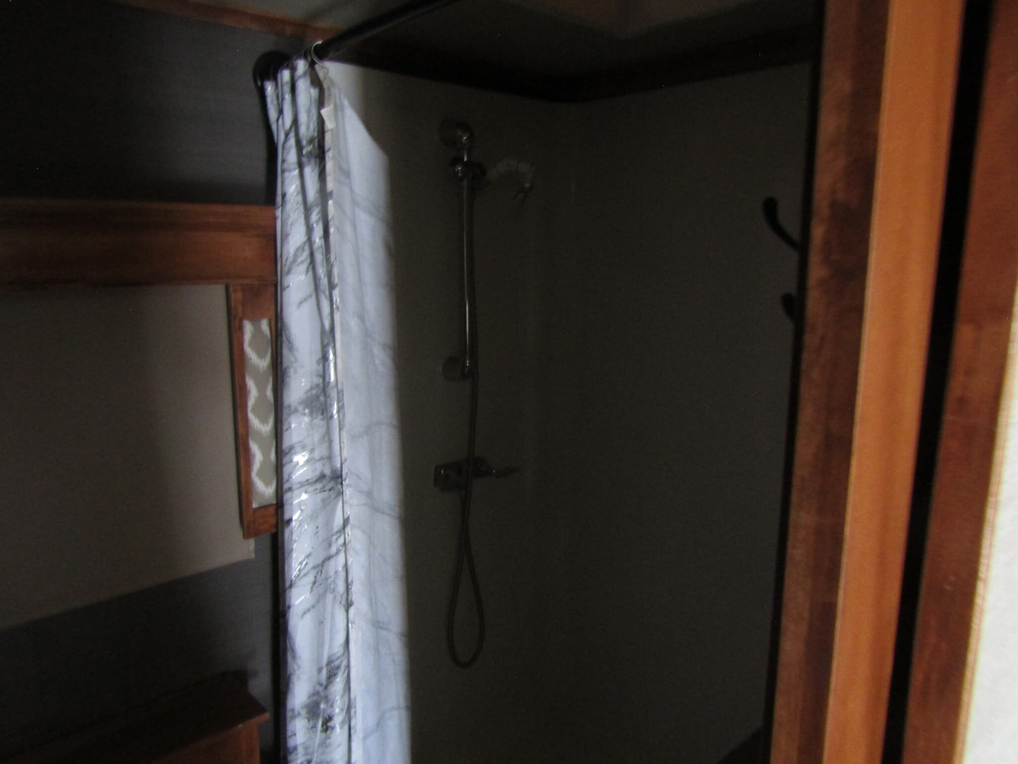 - Bathroom amenities featuring a shower, toilet, and medicine cabinet