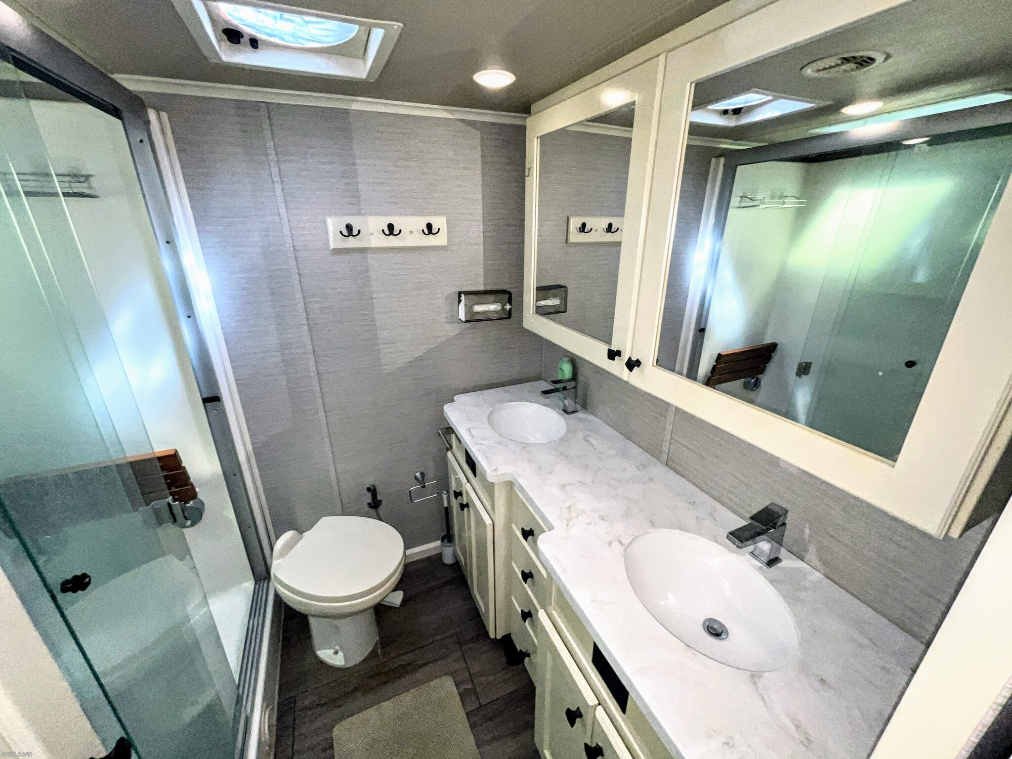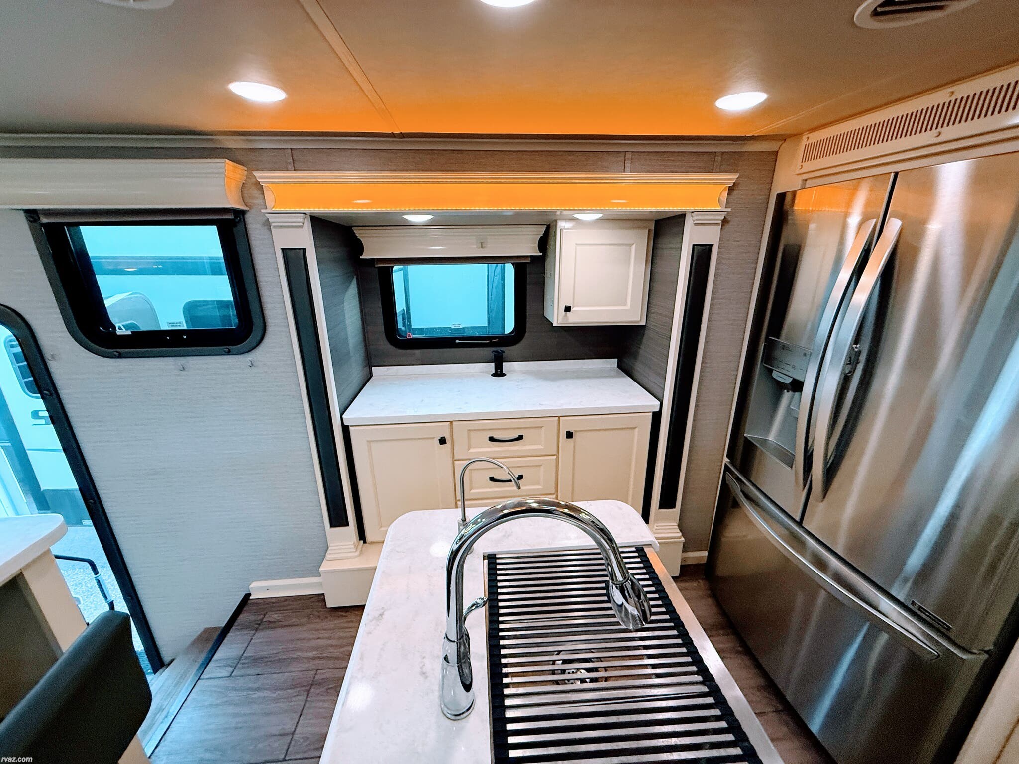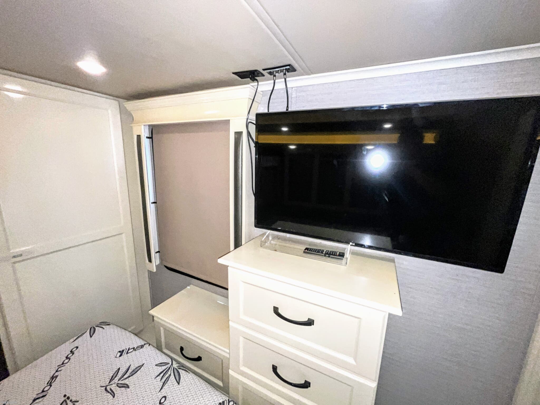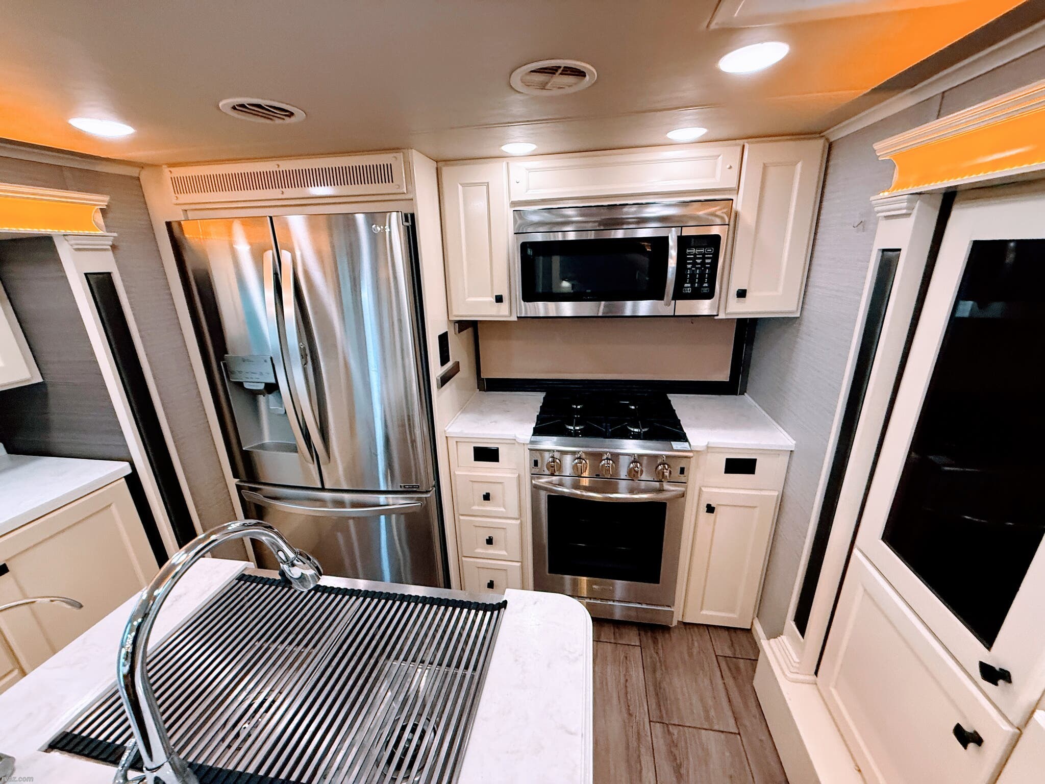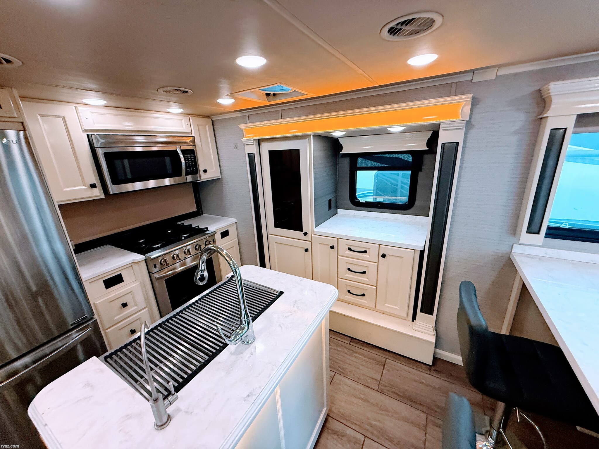 The 42RKB model is designed for comfort, featuring a luxurious king-size bed and an ensuite bathroom fitted with a shower and toilet. The ample storage provided by the medicine cabinet is a thoughtful touch, ensuring you have all necessities at your fingertips. Additionally, this RV includes a central vacuum system, making cleanup effortless!