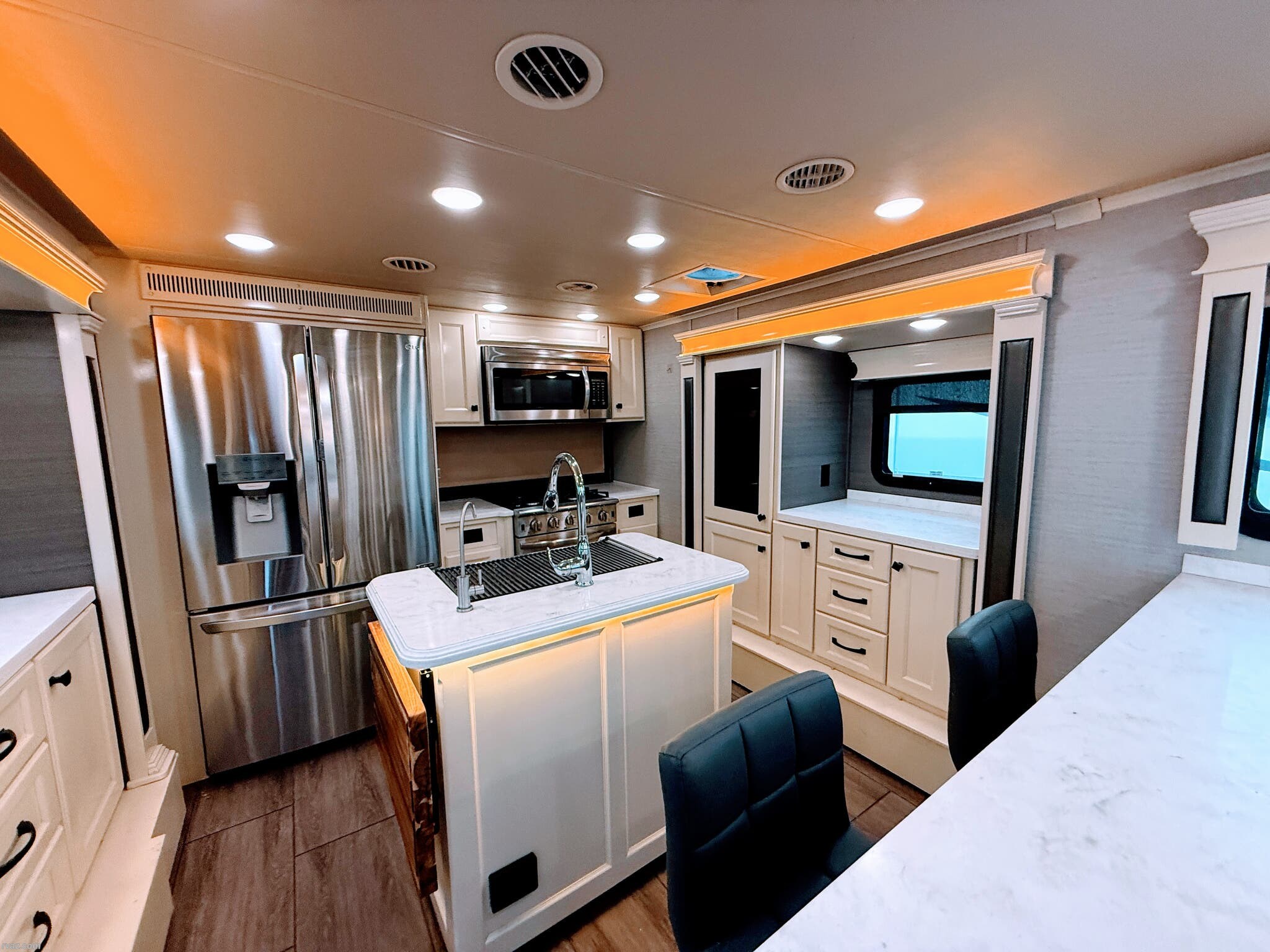 The Beacon 42RKB is packed with premium features that ensure a comfortable stay wherever your journey takes you. Step inside to find a fully equipped kitchen featuring a microwave, oven, stove top burner, and a refrigerator, allowing you to prepare meals with ease. The spacious seating area includes a free-standing dinette with chairs and rockers recliners, perfect for dining and relaxing after a day of exploration.