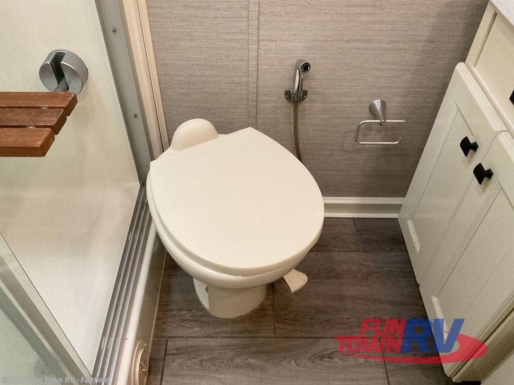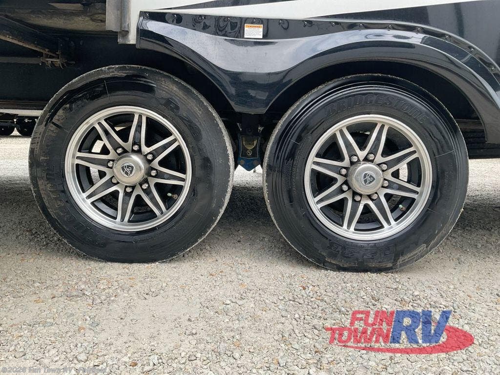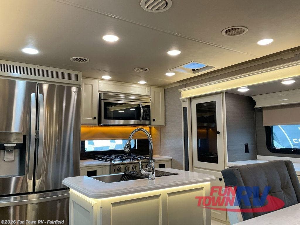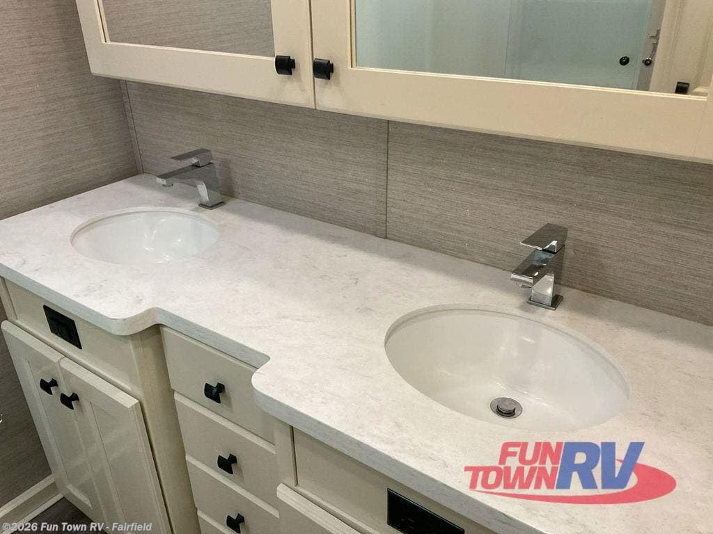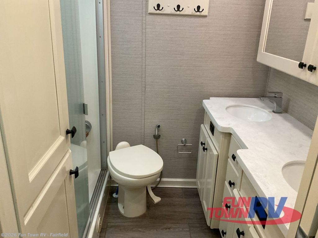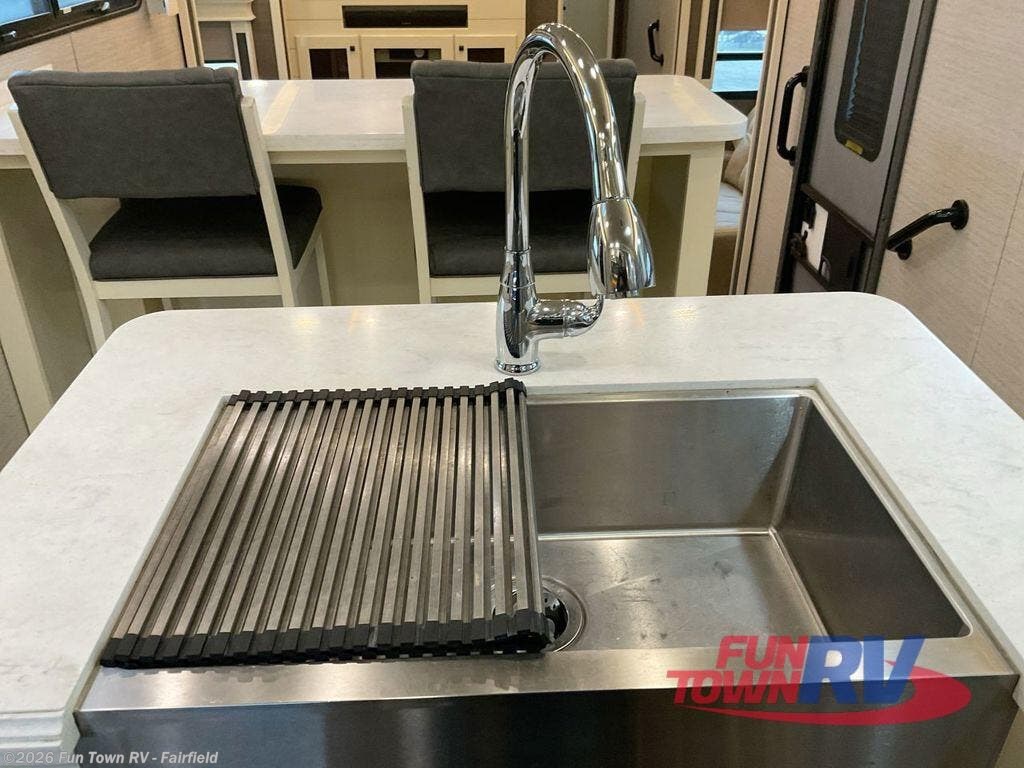 You will thoroughly enjoy every minute spent in this luxurious fifth wheel. Each room is packed with high-end features, such as a Chef Collection oven and cooktop, a residential refrigerator, a 40" fireplace, and a spacious 48" x 30" shower with a seat. While the chef of the family is preparing dinner, the kids can color at the bar style dining table that has a great view of the 55" TV. Within the main living area you will find dual tri-fold sofas within the dual opposing slides, plus a 60" theater sofa for complete comfort. Everyone can easily clean up in the spacious full bath that includes dual bath sinks and a medicine cabinet for your necessities, plus there is a hall closet conveniently located just outside the door to grab a clean towel on your way to shower. You and your spouse will fall in love with the front bedroom that includes a slide out king bed, a Hi-Boy dresser with a TV above, a window seat cabinet, and a large front closet with sliding doors to store your clothes. There is even a space to add an optional washer and dryer for your convenience.