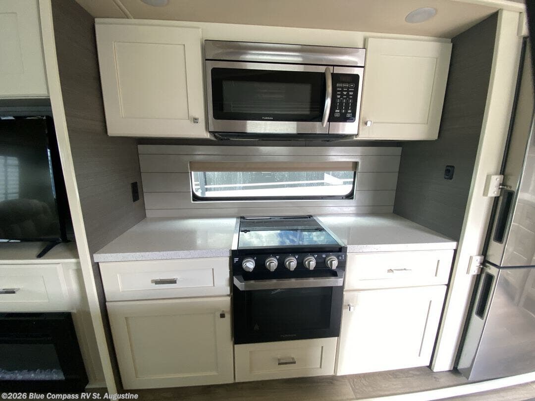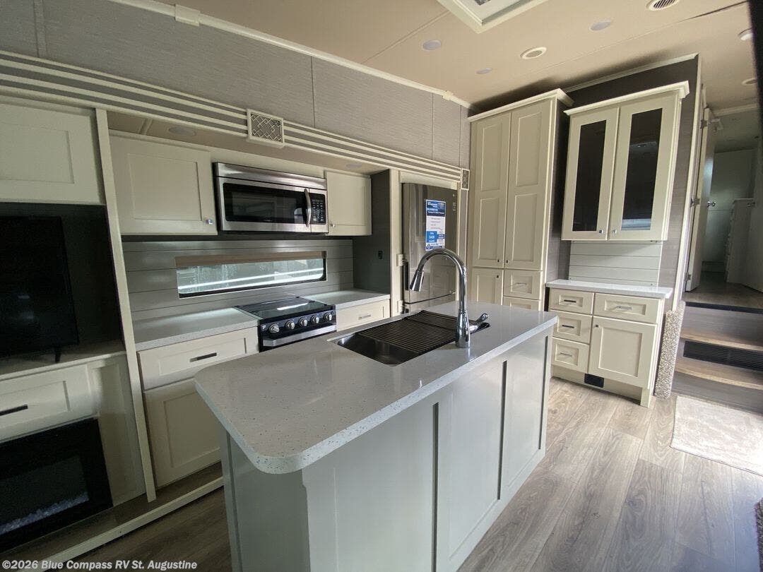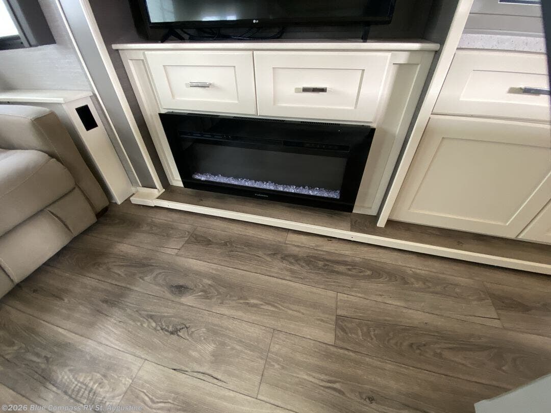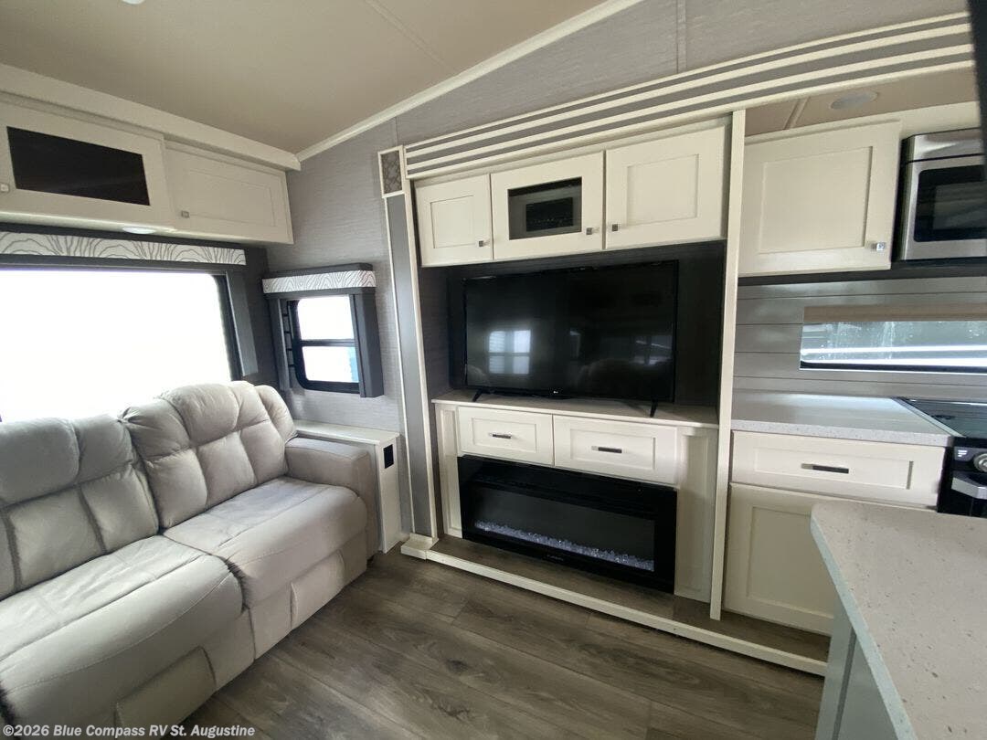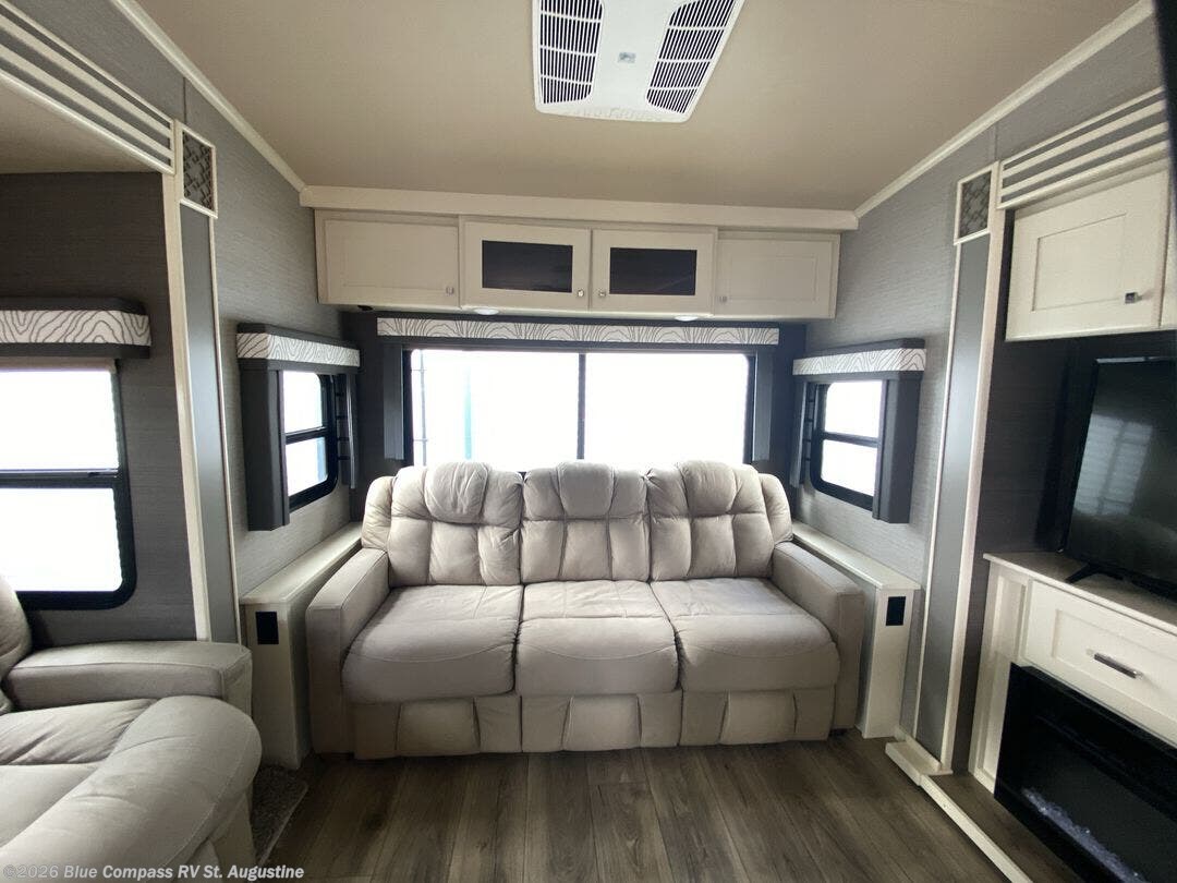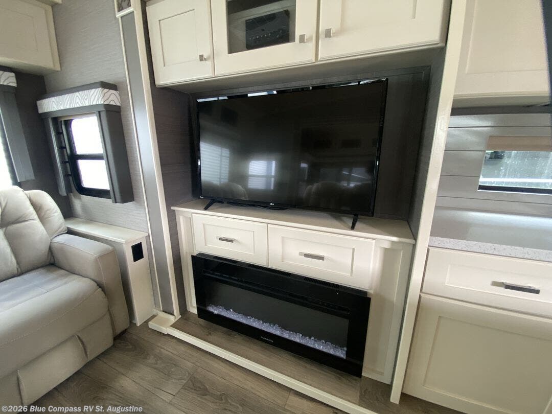 Pack your bags and head out on a new adventure in this luxurious fifth wheel! Since there is a space to add an optional washer and dryer in the front bedroom, this model would be great for full-time RV living. Preparing meals each day will be a snap on the Furrion oven and cooktop, plus there is a residential refrigerator and a large pantry to store all your food. Your nice dishes and seasonal decorations will look great in the hutch with upper and lower cabinets. This model includes dual opposing slides that will provide more space around the kitchen island with overhead lighting. After dinner the kids can play a game at the booth dinette, while you and your spouse relax on the theater sofa. There is even a 40" monitor TV and fireplace directly across from the theater sofa for easy viewing. Your guests or the kids can sleep on the 80" sofa bed, and you can enjoy the queen bed slide out in the front private bedroom. And don't forget about the large front closet and dressers for all your clothes!