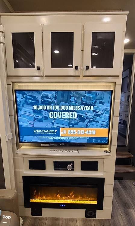 The center living area has a sleeper sofa, a theater-style sofa, a dinette table, an entertainment center with an electric fireplace, and a half bathroom.