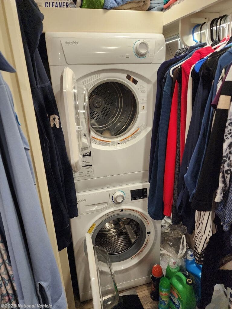 The master suite provides a true retreat with a king bed, large wardrobe, dresser storage, and a washer/dryer for extended stays. The residential-style bathroom features a spacious shower, solid-surface vanity, and upscale fixtures that elevate everyday comfort.