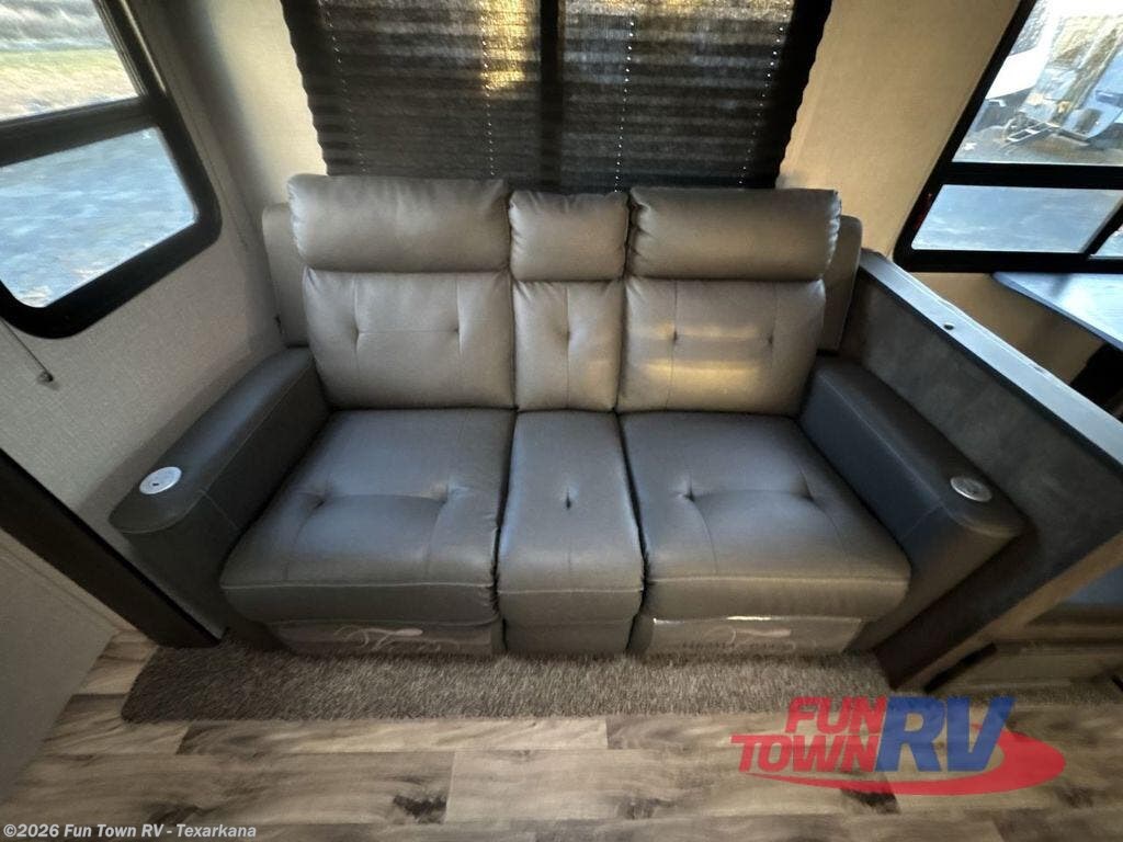 This SportTrek travel trailer has excellent storage capacity with its exterior trunk door, pass-through storage, and interior hidden pantry! You will also find that this trailer has many kitchen amenities with the microwave, Furrion oven, 10-cubic foot refrigerator, and large undermount stainless steel sink on the interior, as well as the additional tools at the outdoor kitchen. The front private bedroom has sliding doors to close it off from the rest of the trailer, and you will find a walk-around queen bed with bedside closets within the bedroom. Out in the main living area, you can put your feet up on the 70" sofa, or you can use the 42" dinette to sit down with an afternoon snack.