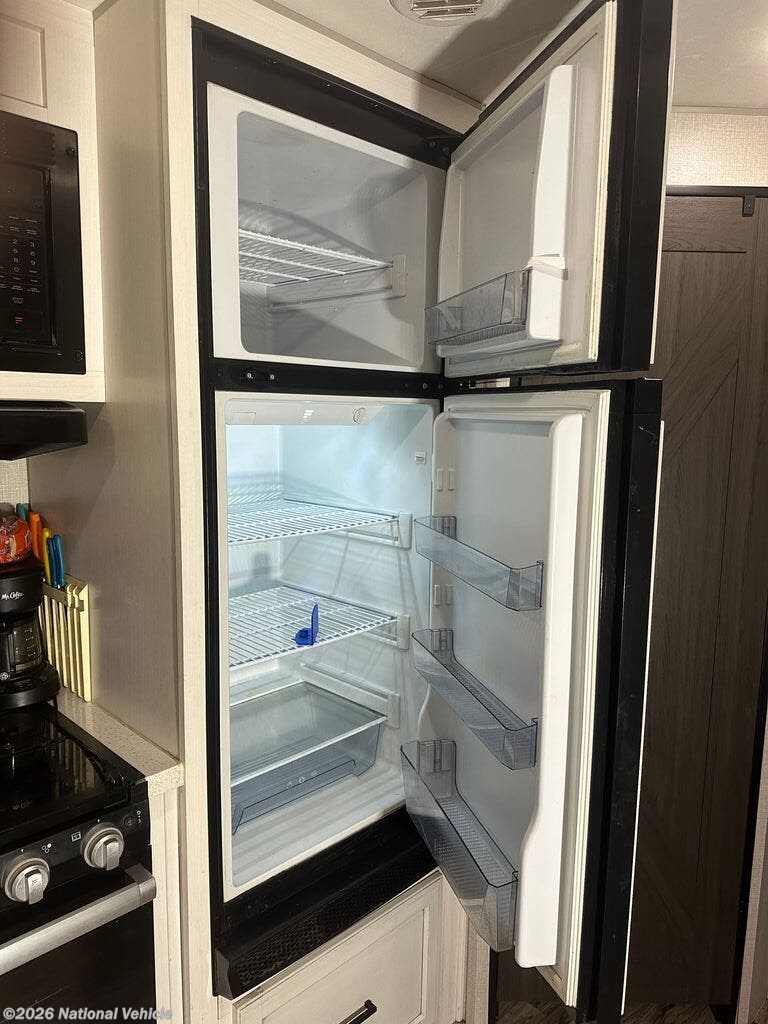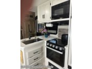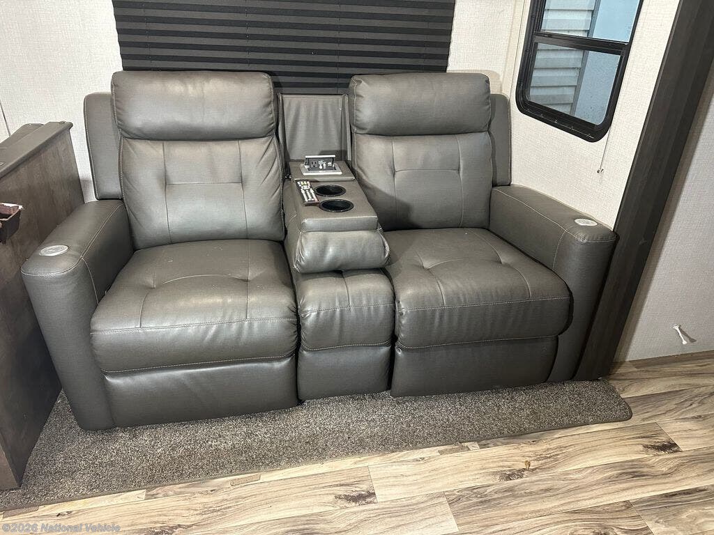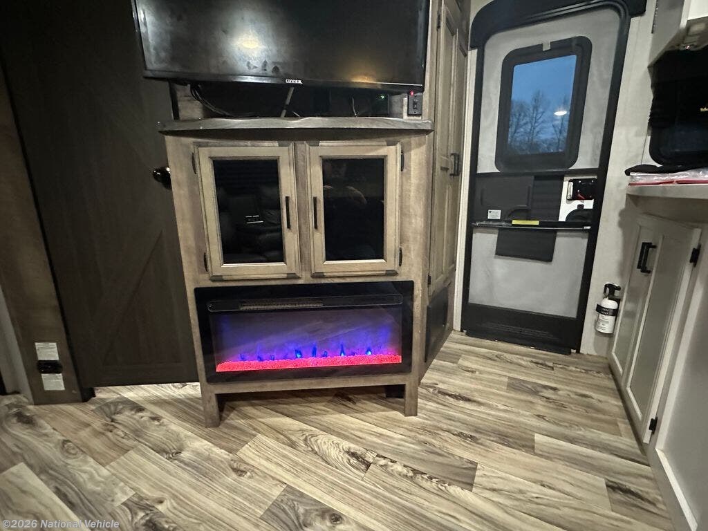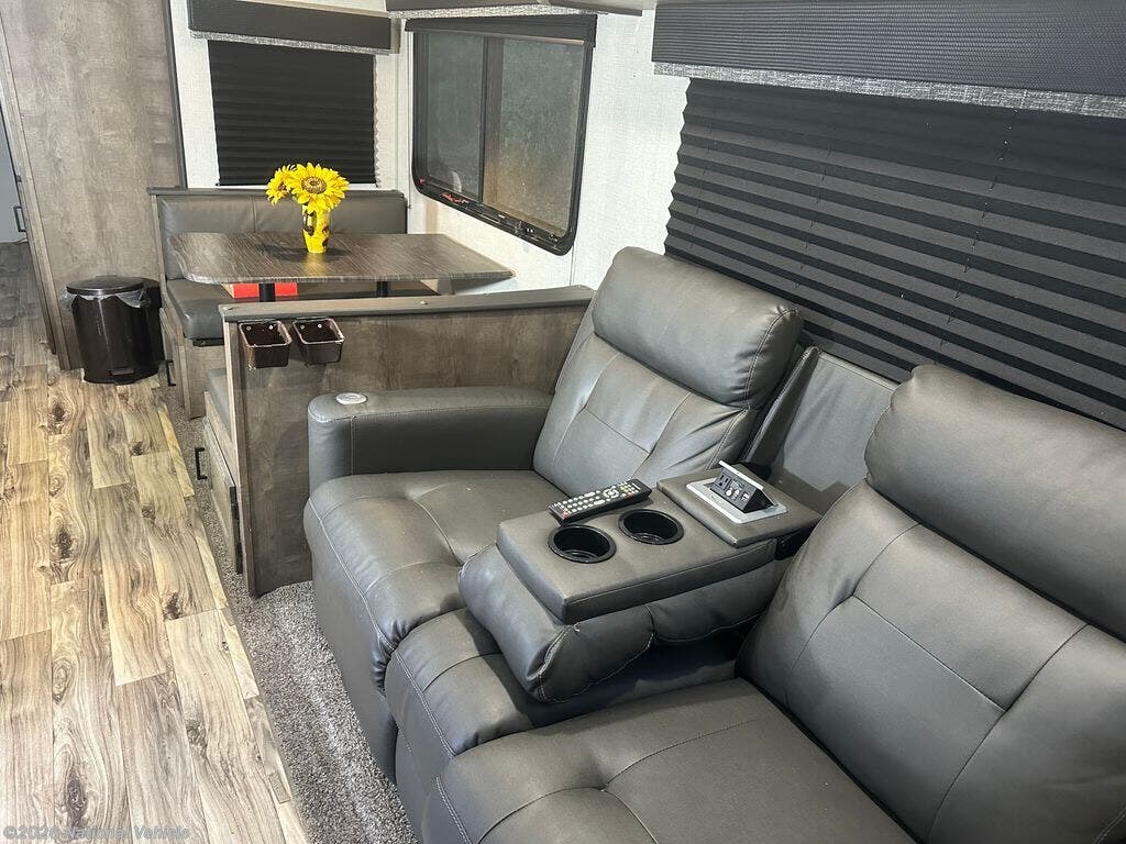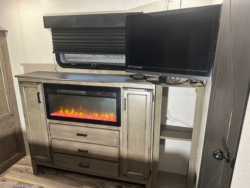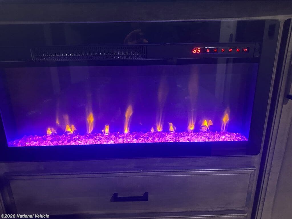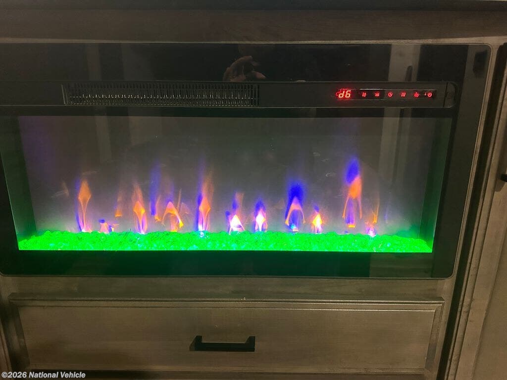Step inside to discover an inviting interior with a large living area featuring theater seating, a cozy fireplace, and an entertainment center with a flat-screen TV. The fully equipped kitchen offers a residential refrigerator, three-burner cooktop, microwave, solid-surface countertops, and a kitchen island for extra prep space. A freestanding dinette adds to the home-like feel, making mealtime enjoyable.