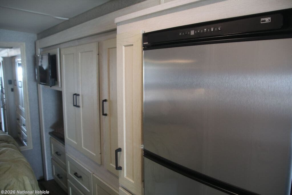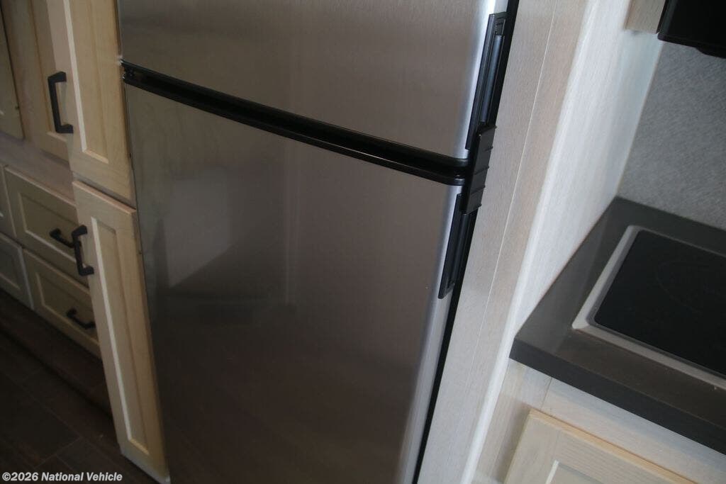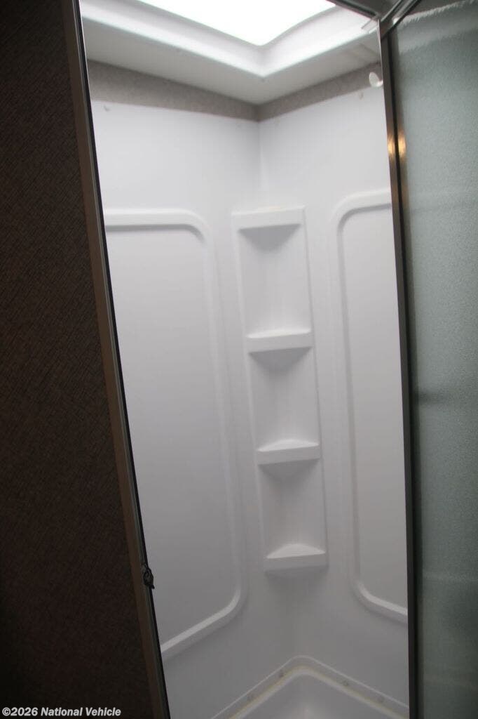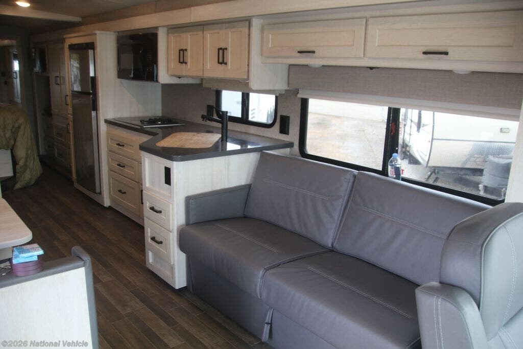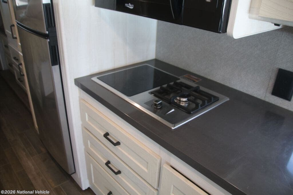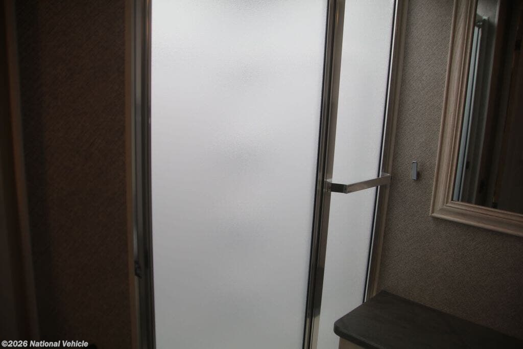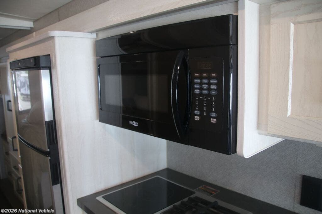 The fully equipped kitchen boasts solid-surface countertops, a large refrigerator, convection microwave, and ample storage, making meal prep on the road effortless. A centrally located bathroom with a porcelain toilet and glass-enclosed shower adds residential-style comfort wherever you travel.