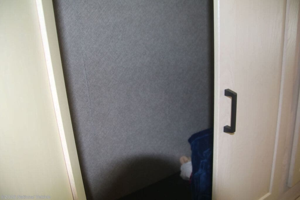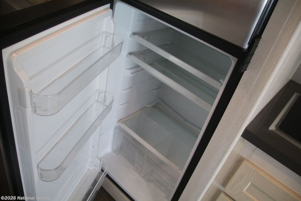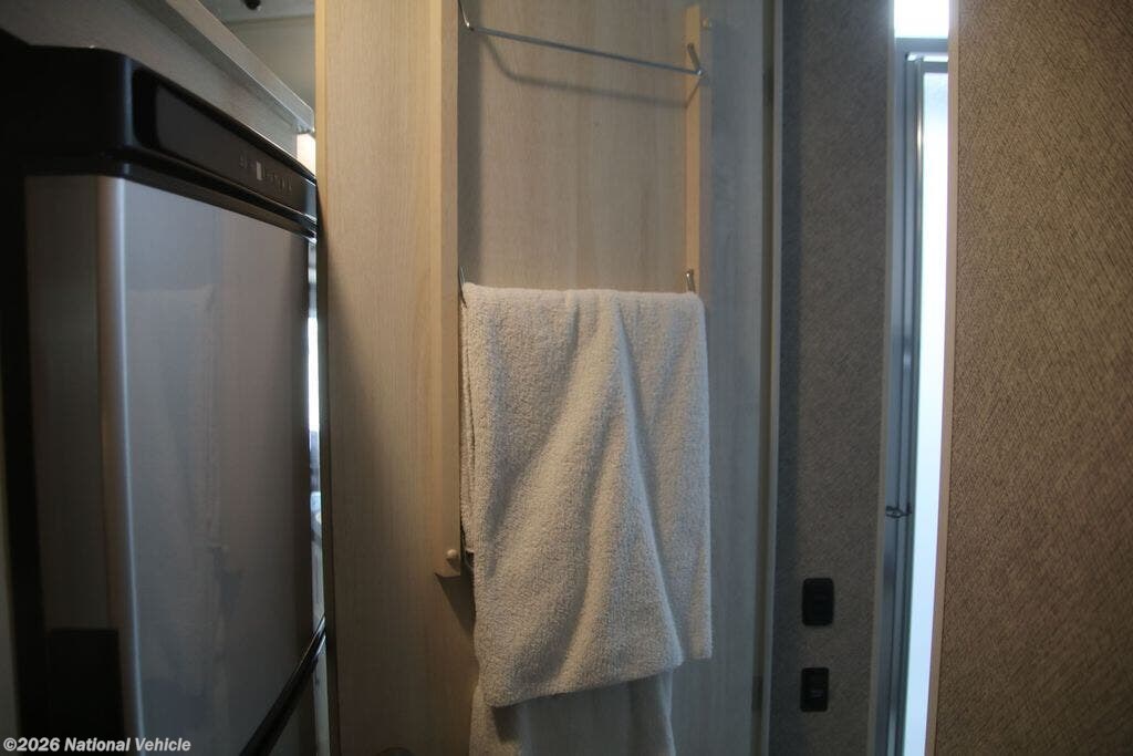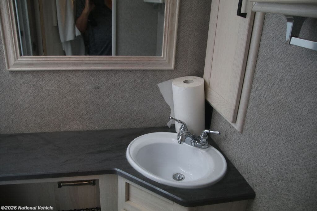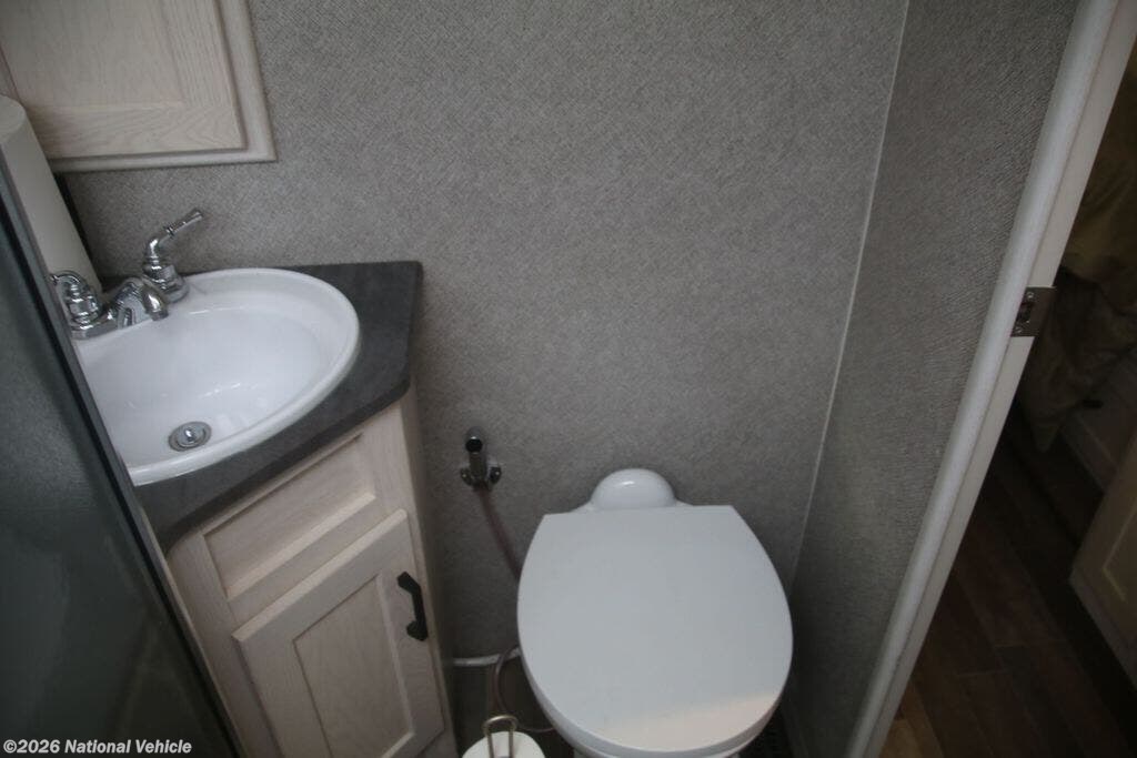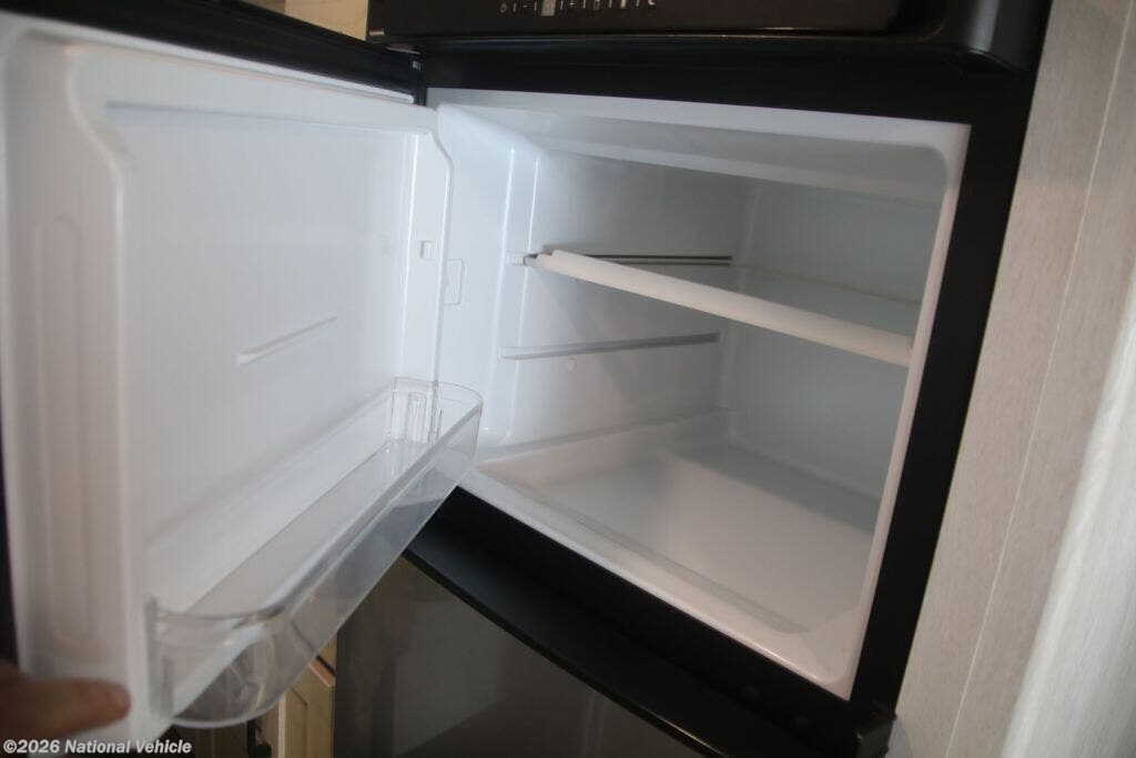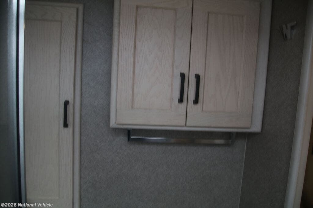 The fully equipped kitchen boasts solid-surface countertops, a large refrigerator, convection microwave, and ample storage, making meal prep on the road effortless. A centrally located bathroom with a porcelain toilet and glass-enclosed shower adds residential-style comfort wherever you travel.