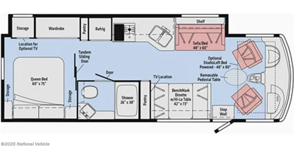 Stretching just over 30 feet in length, this coach is designed for easy maneuverability without sacrificing interior space. Inside, a thoughtfully designed floorplan features a full-wall slide-out, creating a spacious living area perfect for relaxing or entertaining. With sleeping accommodations for up to 8, including a rear private bedroom, convertible sofa, dinette, and an overhead powered bunk, it?s ideal for families or travel groups.
