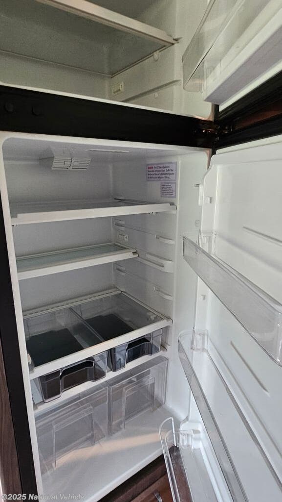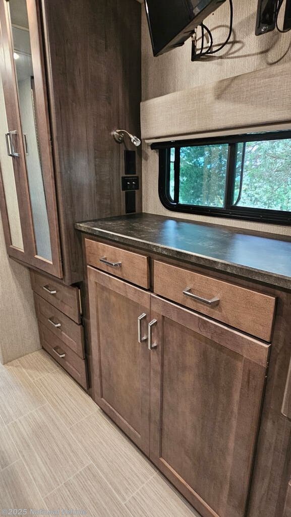 Inside, you'll find ultra-leather theater seating, a convertible dinette, and an entertainment center with a large TV that is lowered inside the cabinet giving you additional counter space. The fully equipped galley includes solid-surface countertops, a residential-style refrigerator, convection microwave, 3-burner range with oven, and plenty of pantry and cabinet space.
