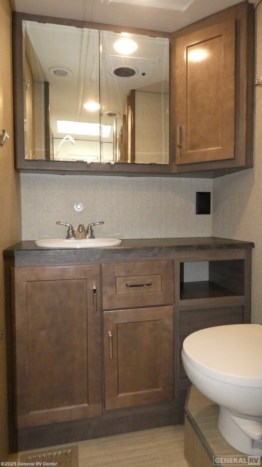 Winnebago Adventurer Class A gas motorhome 30T highlights: TrueComfort+ Sofa Dining Table with Chairs Pet Palace Flip-Up Countertop Retractable 39" HDTV Separated Bathroom If you're looking to upgrade from a travel trailer to a motorhome, this Adventurer Class A gas motorhome is for you! You will find plenty of comfortable seating spaces on the TrueComfort+ sofa, the dining table with chairs that also includes storage, plus the swivel captain's seats. The dual opposing slides in the main living area will open up the coach so that everyone can move about freely, and you'll find a third slide out in the rear bedroom. Prepare meals on the recessed three-burner range top or in the convection microwave, and then take your plate to sit under the 19' power awning. This model features a private toilet and sink with the independent shower right across the hall so that two people can freshen up at once, and the rear bedroom will feel just like home. Here, you'll enjoy the queen bed slide, dual nightstands, plus your own 24" HDTV! The family-friendly Adventurer Class A gas motorhome by Winnebago is the ultimate family getaway for your trips near and far. The swivel captain's seats include fixed lumbar support and multi-adjustable slide/recline for a truly comfortable ride. You will appreciate the 7" Bluetooth multimedia radio with a rearview/sideview monitor system and color touchscreen for easy navigation, and the powered MCD blackout roller visor/shade on the front windshield will provide privacy when you stop for lunch. Each model includes residential vinyl flooring throughout, a soft vinyl ceiling, a solid-surface kitchen countertop, and a double stainless steel sink with bamboo sink covers. The under-bed storage will provide a place for your luggage, and you'll find lighted storage compartments outside for all your larger gear. These models are constructed with a premium high-gloss fiberglass skin for a sleek look, and the electronic stability control will provide a smooth ride wherever the road takes you!