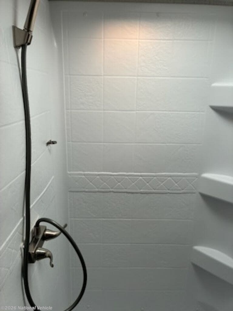 At the rear of the trailer, you will find a spacious full bathroom with a large shower, skylight, vanity, foot-flush toilet, medicine cabinet, and additional linen storage. The bathroom layout provides the comfort and convenience typically found in much larger travel trailers.