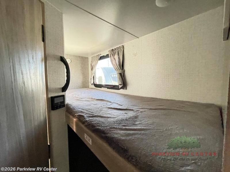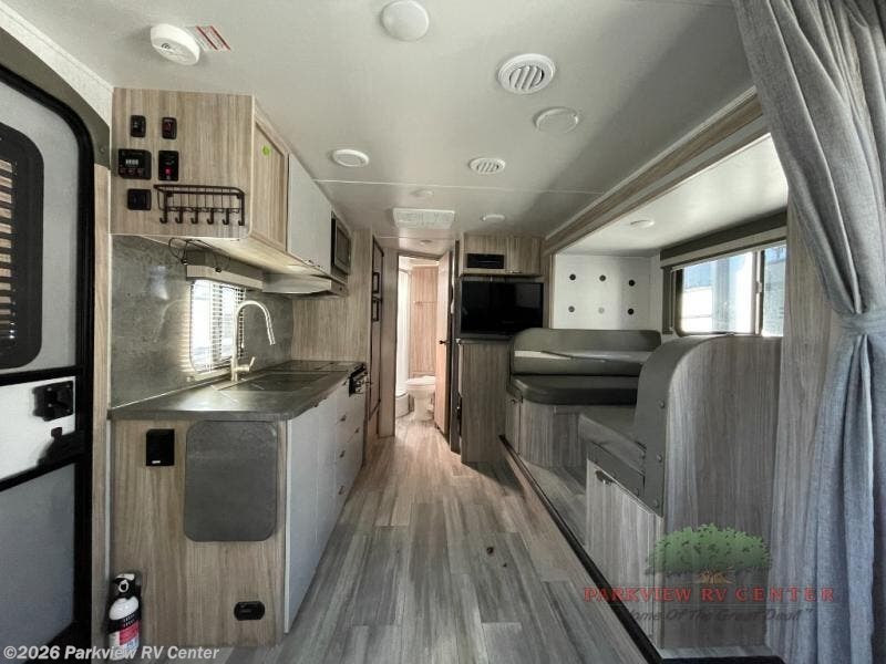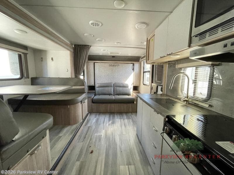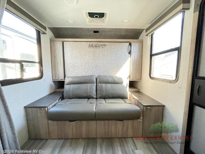 Load your kids into this travel trailer and experience a fun family getaway! The front Murphy bed offers versatile living by transforming into a 54" x 74" bed to sleep on at night and a sofa to sit on while socializing with the chef cooking at the three burner cooktop. The 44" x 72" booth dinette slide is a great place to eat your meals at, play games as a family, and even transform into an extra sleeping space if your kids want a friend to tag along. The kids will love sleeping on the rear corner 28" x 72" bunk beds and having the rear corner bathroom right next to them. As if that wasn't enough, there is an exterior pack-n-play door, a power awning with LED lighting, and patio speakers to crank up the tunes!