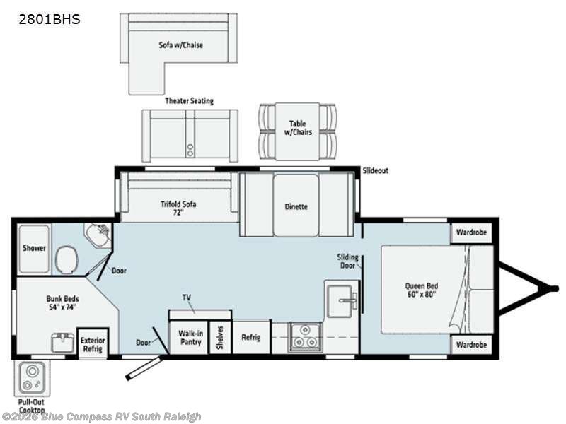 Think how wonderful it will be to cook for the family in the main kitchen with full amenities including a convection microwave and cooktop, plus 10.3 cu. ft. refrigerator or you can choose the 8 cu. ft. gas/electric option. And you will be able to make meals using the pull-out cooktop with sink and the exterior refrigerator for more cold storage in the outside kitchen. When it is time for bed, the kids will run to the double size bunks while you can slide the front bedroom door open to your own private retreat. The walk-around queen bed will be calling your name. In the morning the spacious living and kitchen area offers a large slide out with a tri-fold sofa and dinette, or maybe you choose different furniture options.
