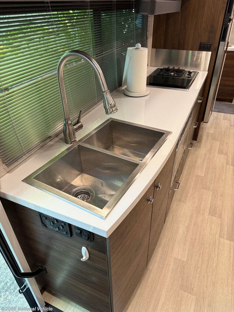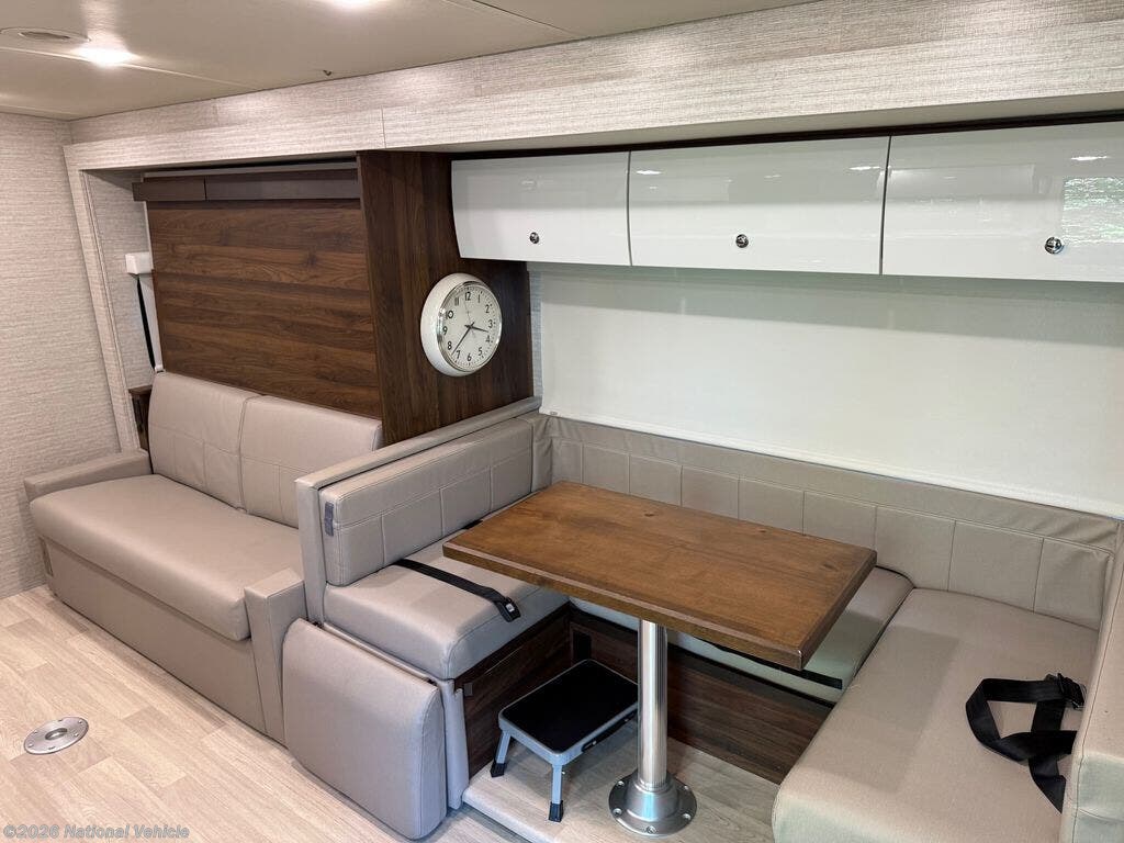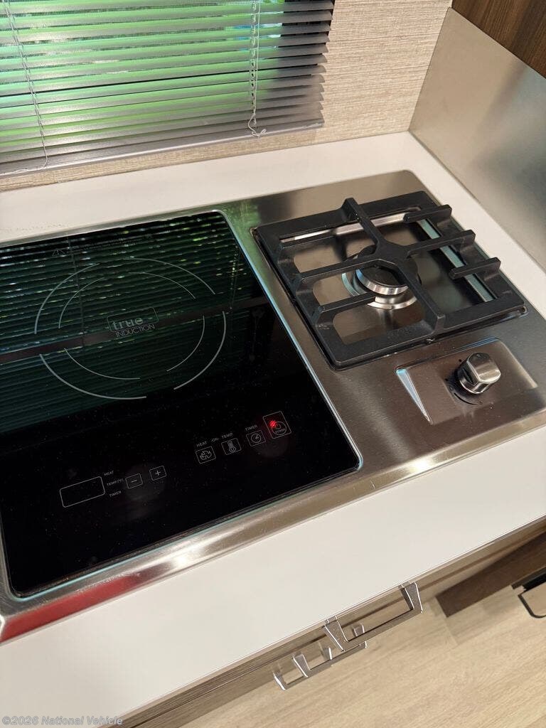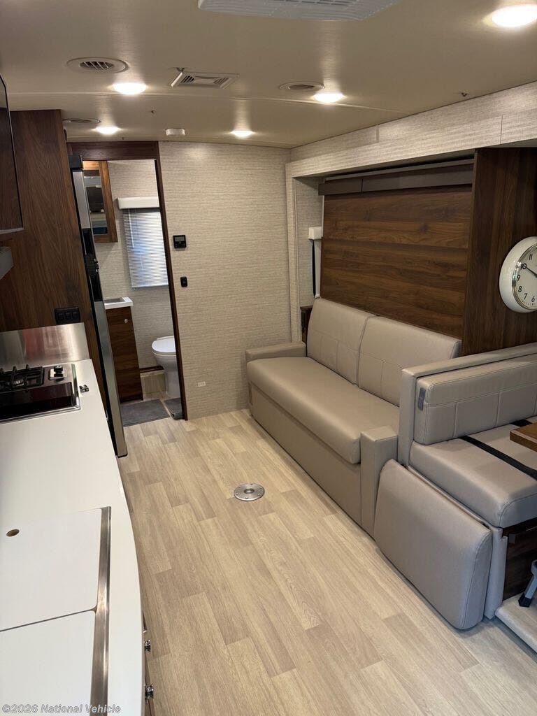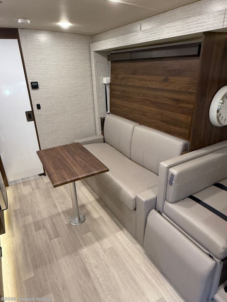 Inside, the 24D features a smart, space-saving layout with a large slide-out, a convertible dinette, and a Murphy+ bed that tucks away to create a roomy lounge area during the day. The rear full bathroom includes a separate shower, vanity, and ample storage. The kitchen is equipped with a dual-fuel cooktop, convection microwave, and a large compressor refrigerator, ideal for extended trips.