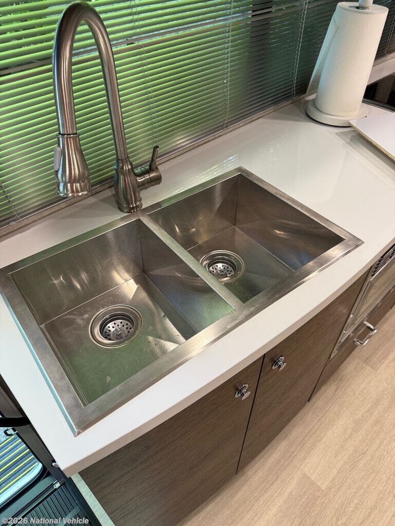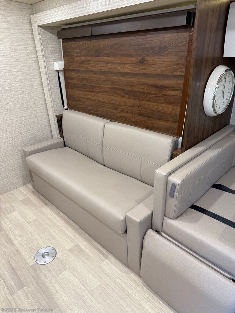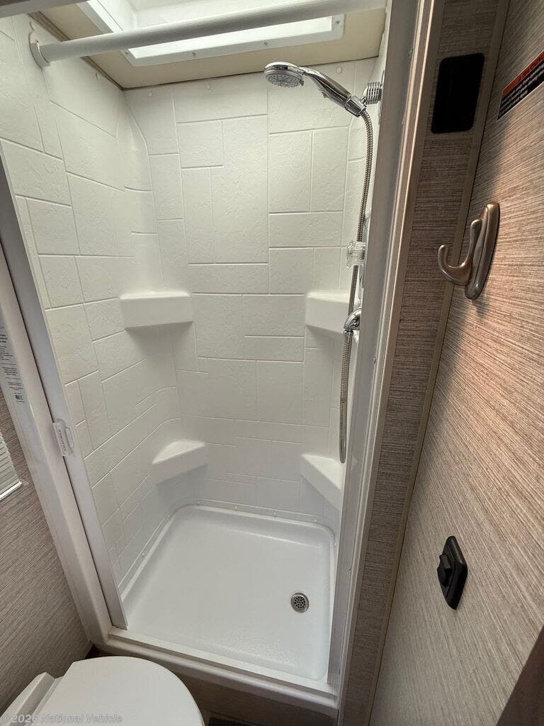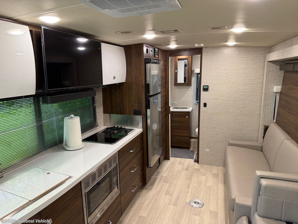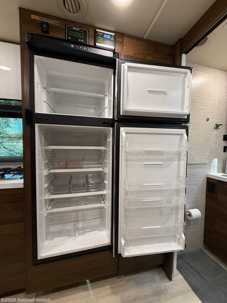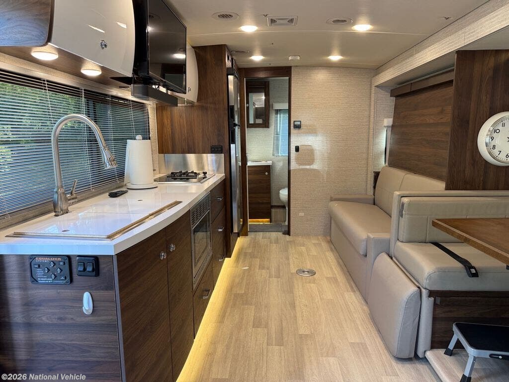 Inside, the 24D features a smart, space-saving layout with a large slide-out, a convertible dinette, and a Murphy+ bed that tucks away to create a roomy lounge area during the day. The rear full bathroom includes a separate shower, vanity, and ample storage. The kitchen is equipped with a dual-fuel cooktop, convection microwave, and a large compressor refrigerator, ideal for extended trips.