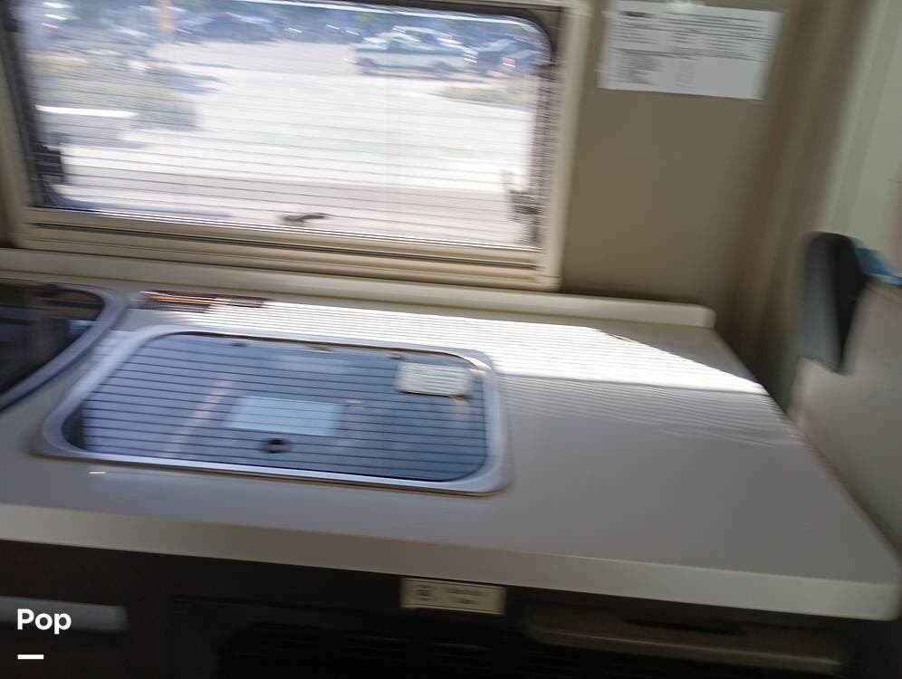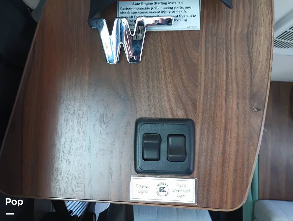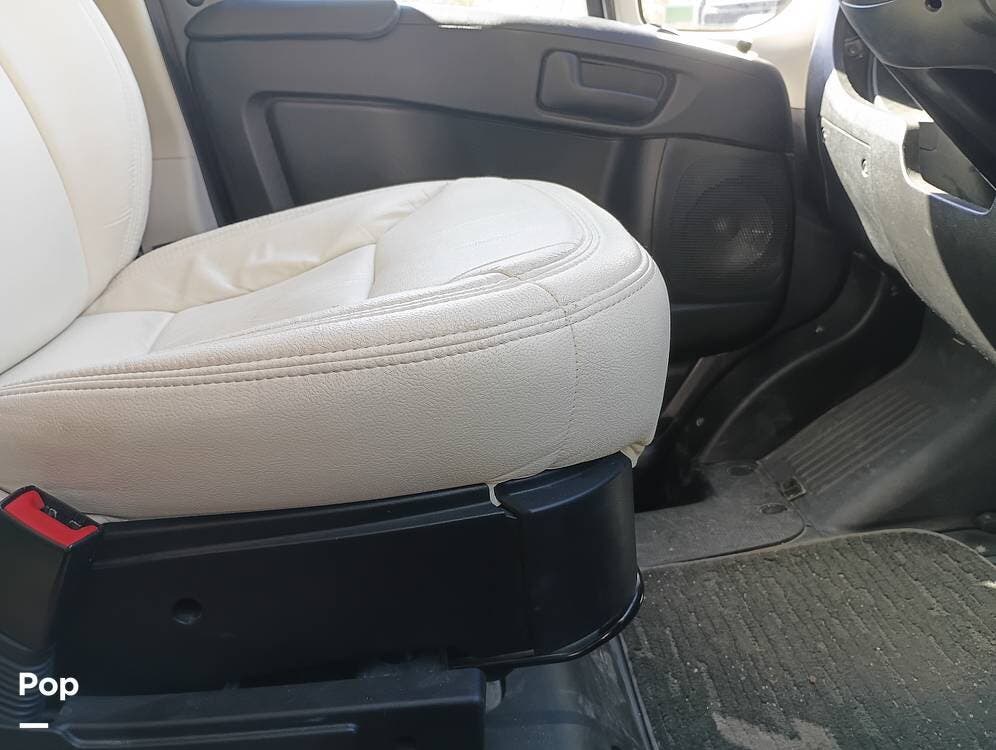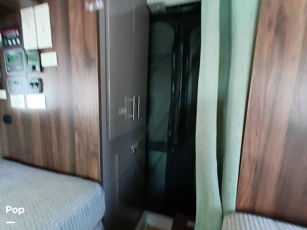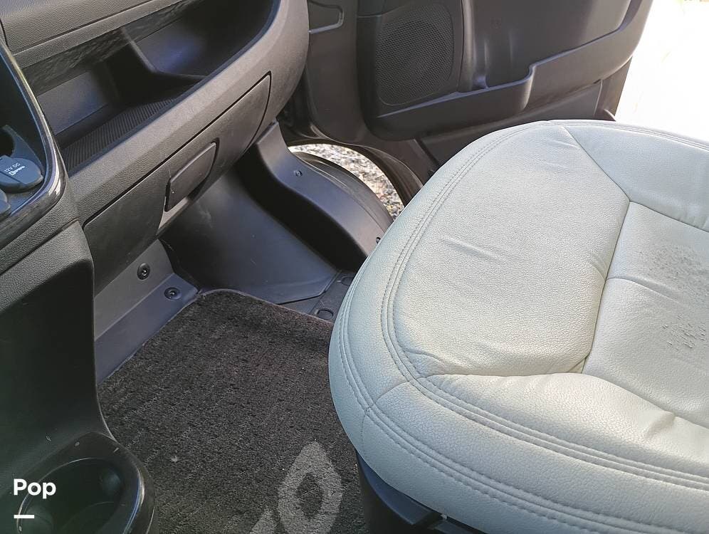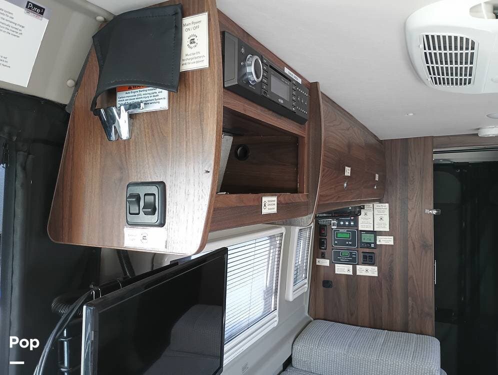 Behind the passenger seat is the entry door, and a mounted TV is located there. The TV is below the line of cabinetry that will hold all your necessities and a convenient control center.