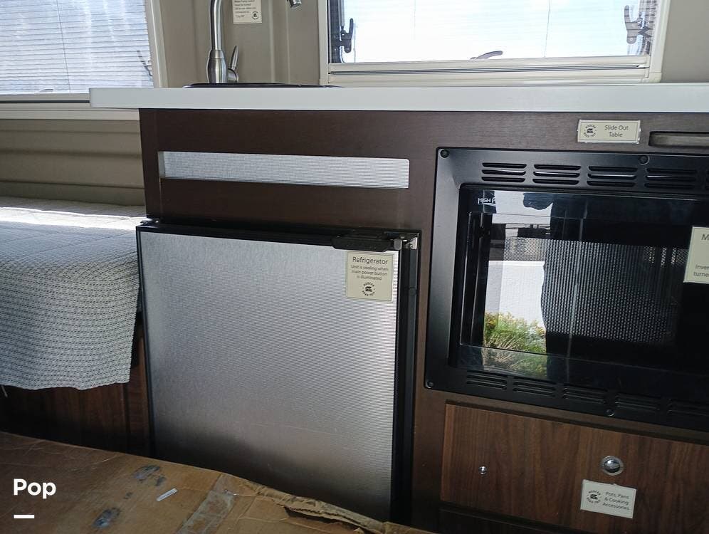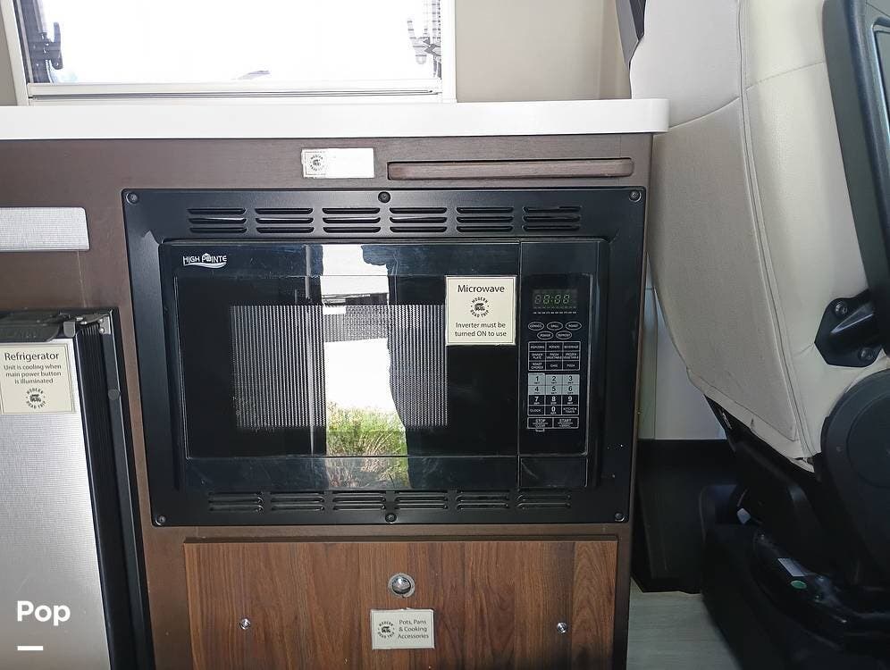 Behind the driver's seat is the front kitchen that features a two-burner cooktop, a microwave, and a compressor-based refrigerator/freezer.