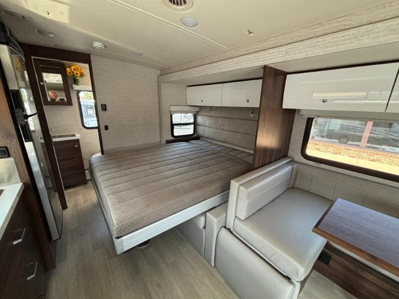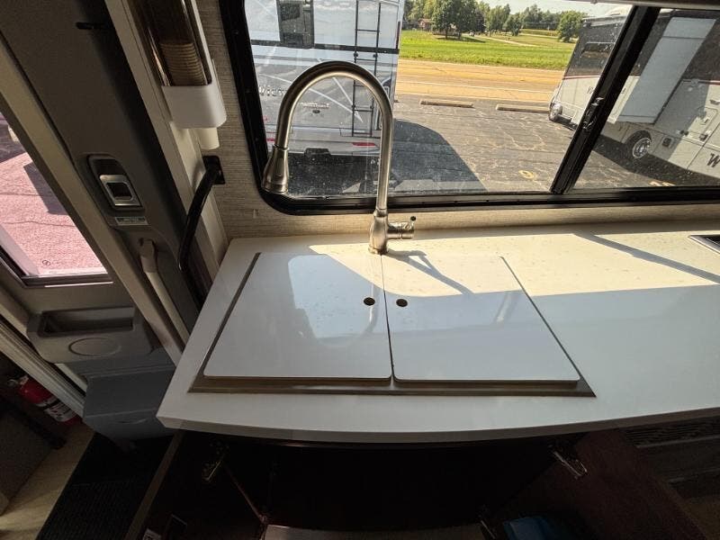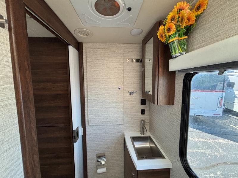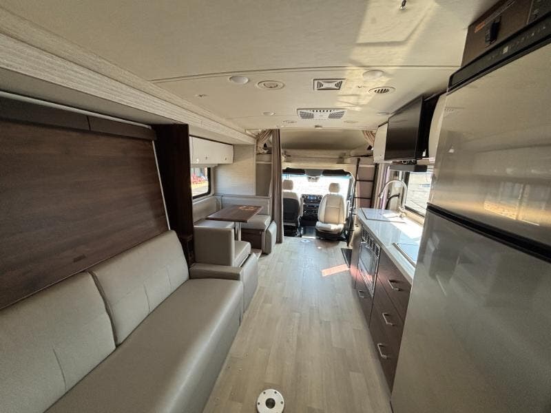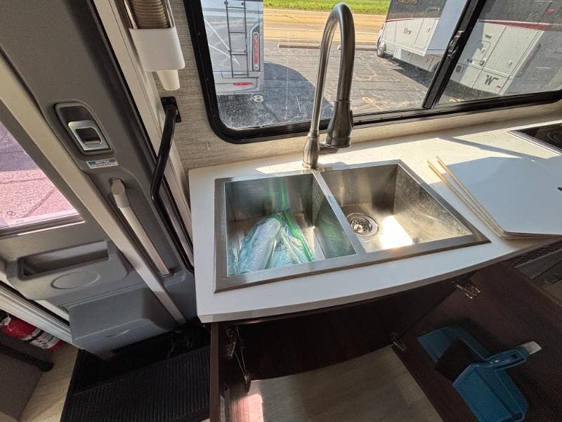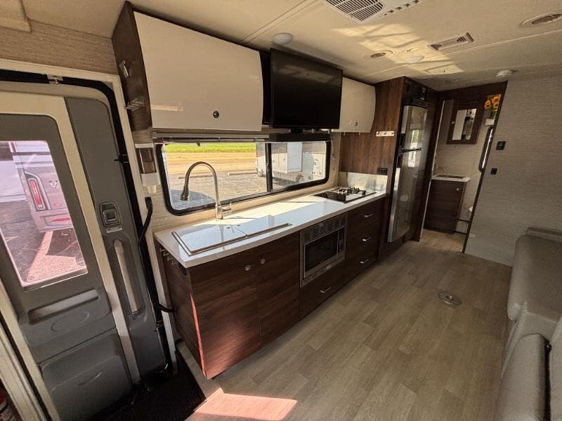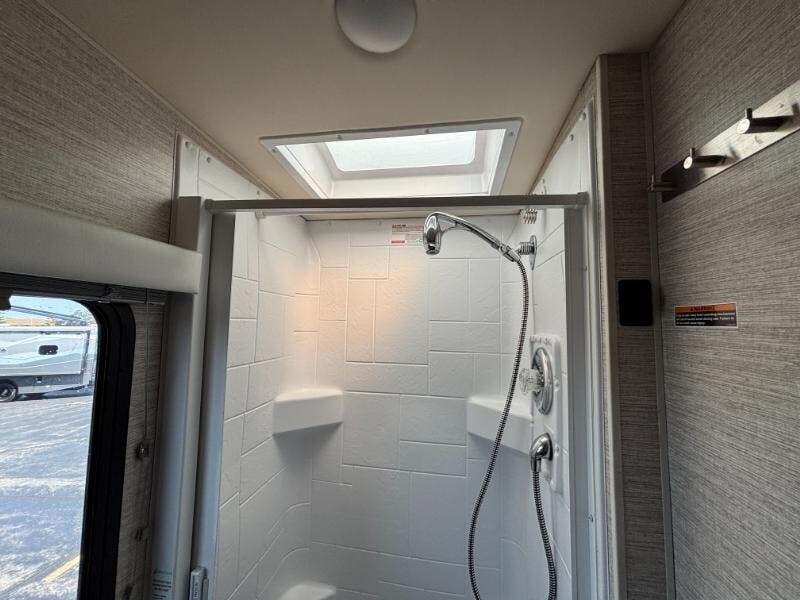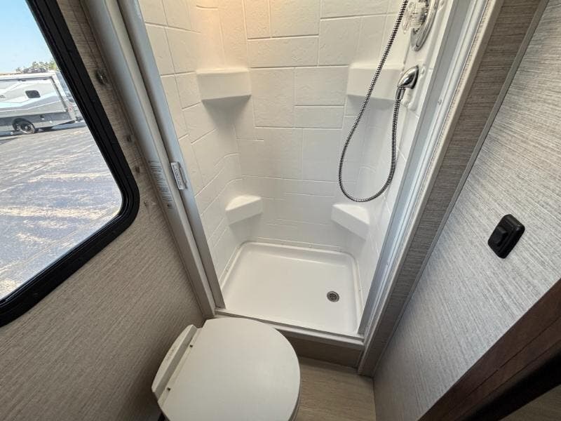 Features Include: 188 HP, 220-Amp Alternator, 3-Point Seat Belts, Color Touch Screen, Handheld Remote, Color Rear Camera, Power Windows, Power Mirrors, LED Headlights, Lane Keeping Assist, Running Board, Stepwell Light, Vinyl Flooring, Soft Vinyl Ceiling, Tinted Coach Windows, Galley Mini Blinds, Laminate Countertops, Stainless Steel Sink, USB Charger, Cable TV Input, LED HDTV, Privacy Curtain, Medicine Cabinet, Flexible Shower Head, Foot Pedal Toilet, 30-Amp Service Cord, 45-Amp 12v Converter, 15k AC, Lockable Water Fill, Fiberglass Roof