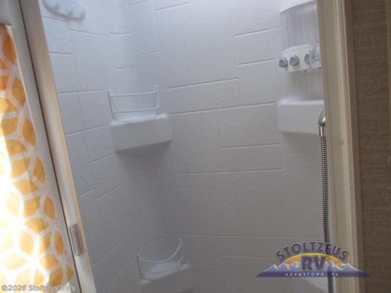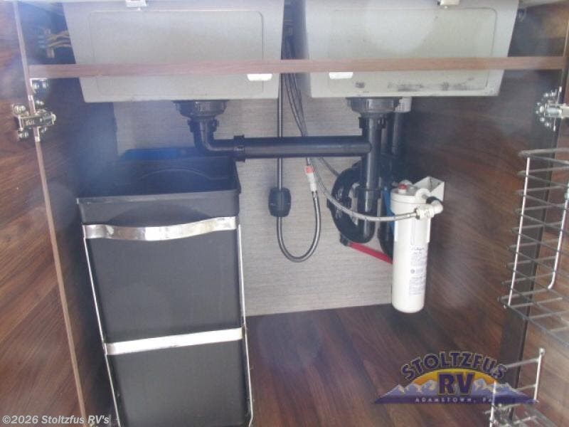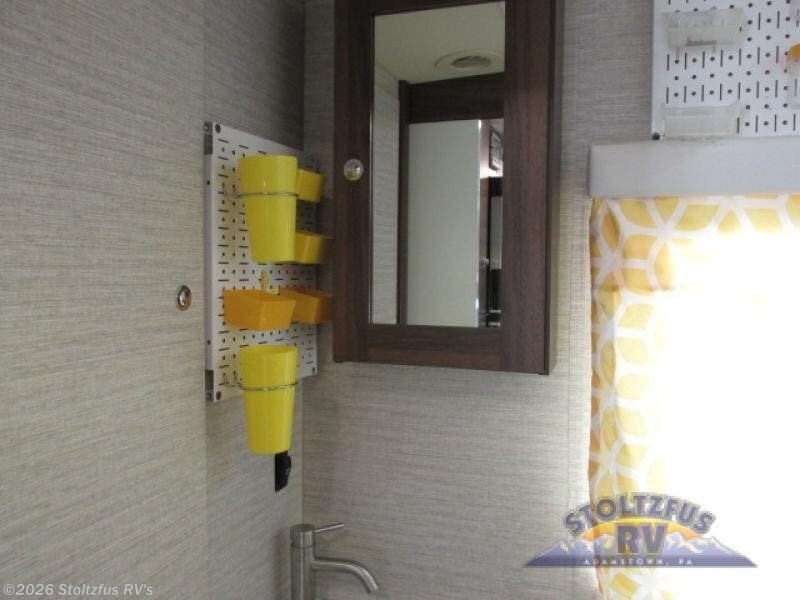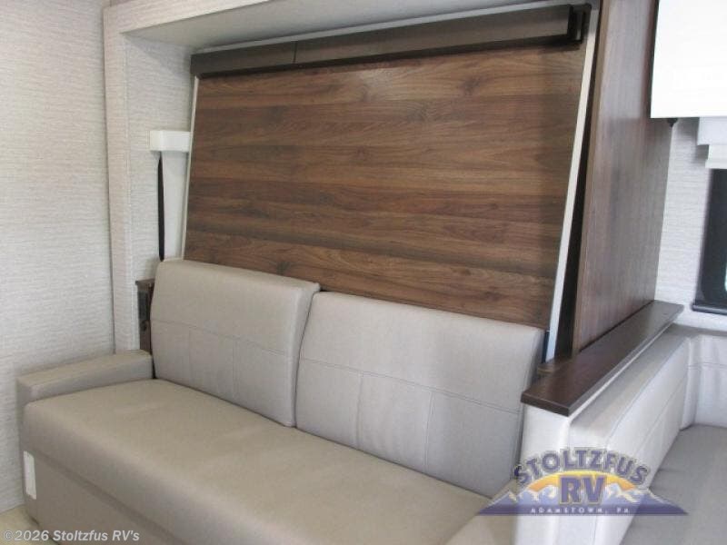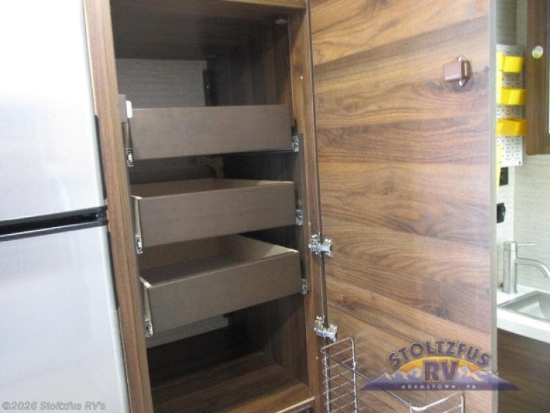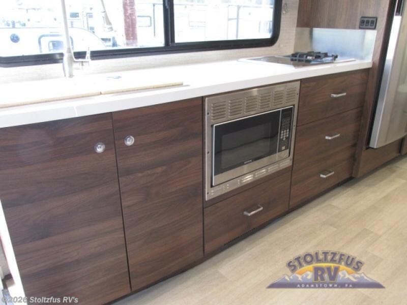 A couple or family will enjoy the look of the interior each time they take the RV on the road. From the curved cabinets, the lighted soft close galley drawers and the sprung-cushion dinette and sofa seats there will surely be a favorite feature for everyone. The cross-coach storage holds larger items, and the above-bed Anything Keeper storage stows things such as cellphones, keys, chargers, and more. You will be able to easy set up the queen Murphy+ bed when it's time for bedtime while the kids sleep on the cabover bunk or the U-shaped dinette. You might like to add the theater seating option if you don't need that extra sleeping space. Everyone can get cleaned up in the full rear bathroom with a space savings sliding door before making meals with full amenities including a convection microwave/oven.