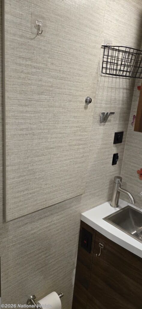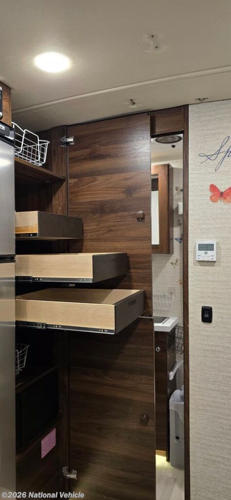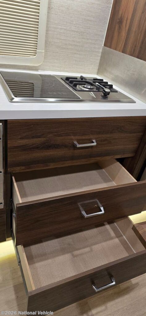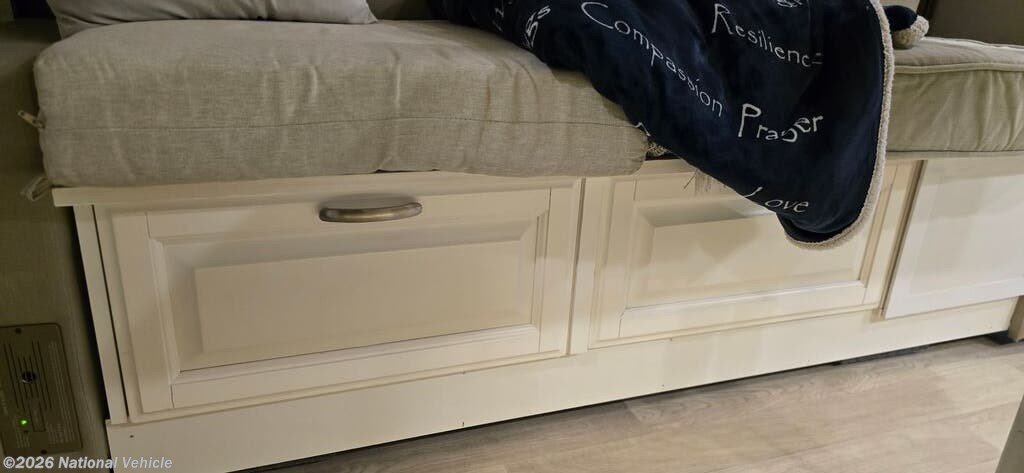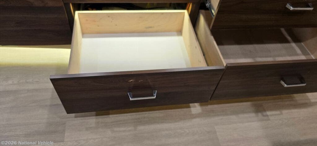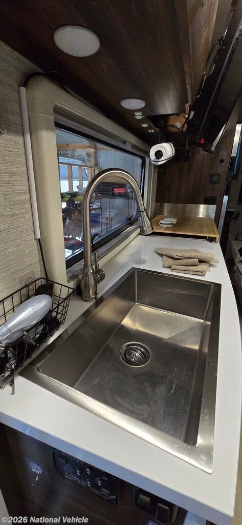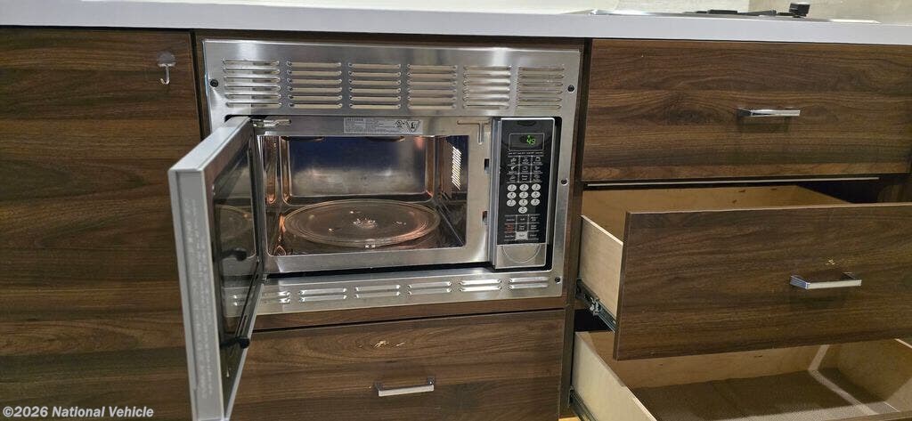 The well-equipped kitchen is designed for convenience on the road with ample cabinet storage and quiet close drawers. The large one bay sink allows for easier washing of dishes.