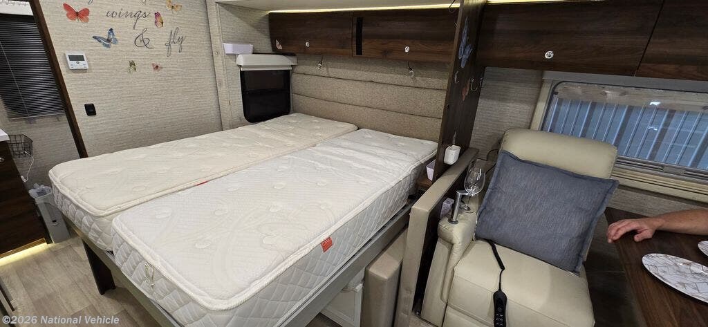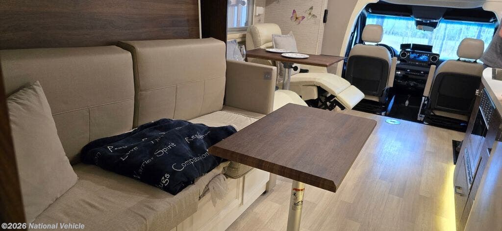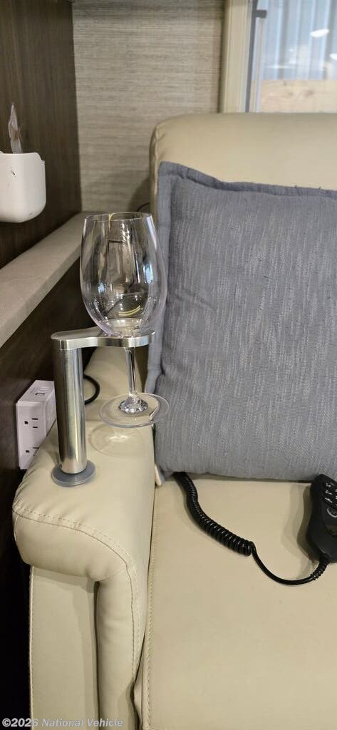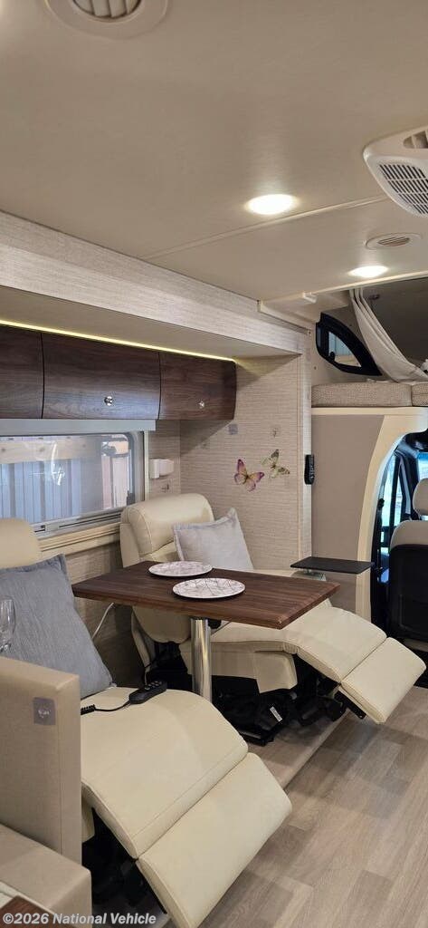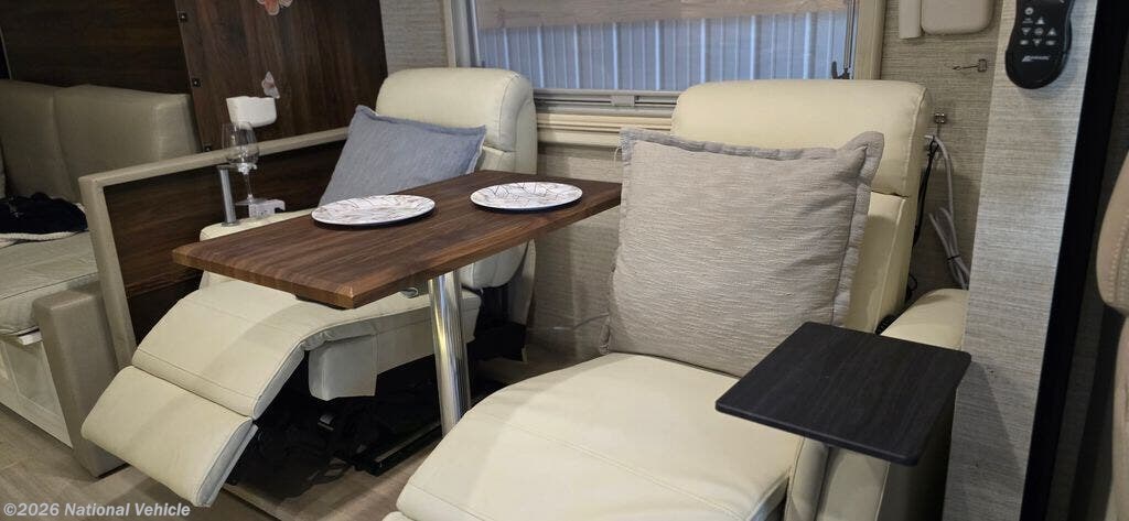 Sellers have upgraded the dinette to power recliner leather theater seating with heat and air massage. A wine glass holder and two smaller tables for computer work are included. A dining table fits nicely between the two seats. The seats can fully recline when the slide is in allowing for a quick rest without setting up for camp.