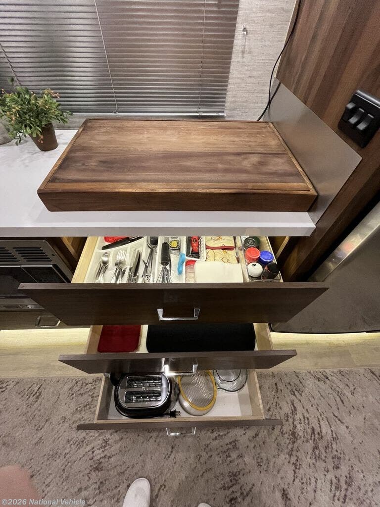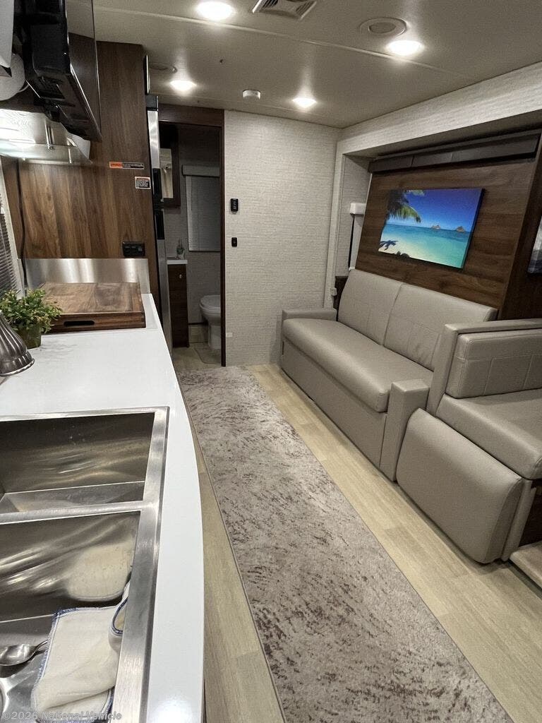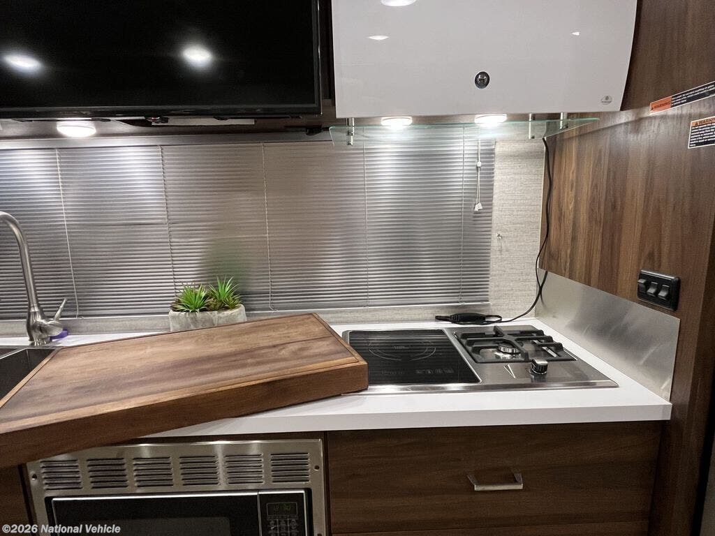 Inside, the innovative layout features a full-wall slide that opens up the living area, along with a versatile Murphy+ bed that transforms your lounge into a comfortable sleeping space. A U-shaped dinette, modern galley with convection microwave, induction cooktop, and large refrigerator make it easy to relax and entertain on the road.