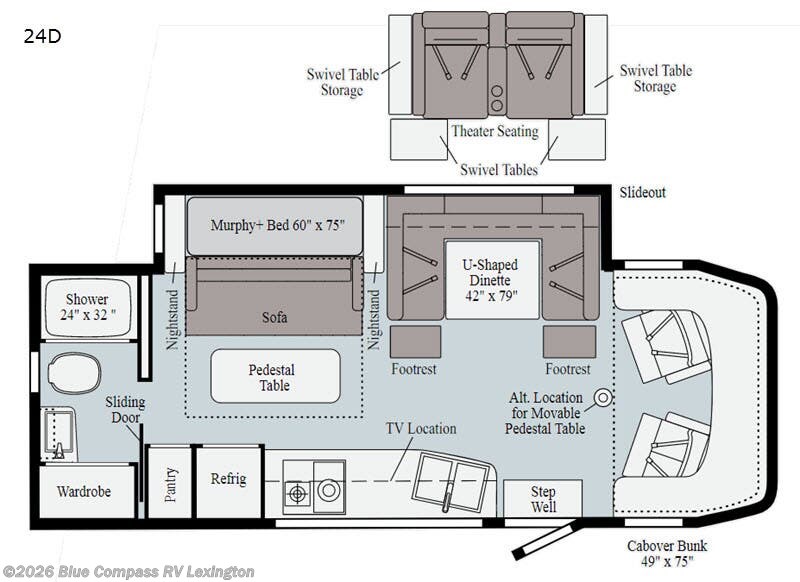 A couple or family will enjoy the look of the interior each time they take the RV on the road. From the curved cabinets, the lighted soft close galley drawers and the sprung-cushion dinette and sofa seats there will surely be a favorite feature for everyone. The cross-coach storage holds larger items, and the above-bed Anything Keeper storage stows things such as cellphones, keys, chargers, and more. You will be able to easy set up the queen Murphy+ bed when it's time for bedtime while the kids sleep on the cabover bunk or the U-shaped dinette. You might like to add the theater seating option if you don't need that extra sleeping space. Everyone can get cleaned up in the full rear bathroom with a space savings sliding door before making meals with full amenities including a convection microwave/oven.