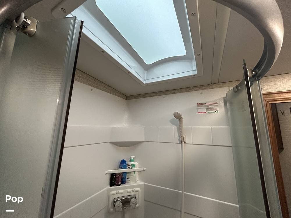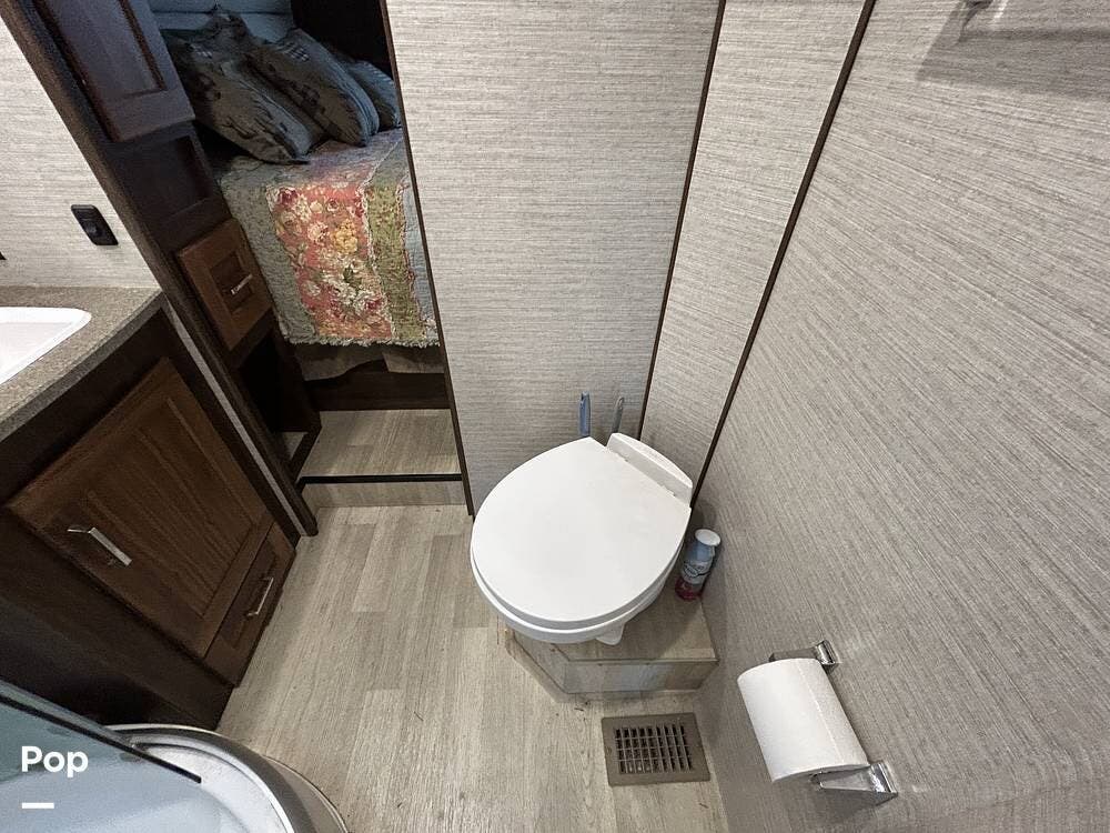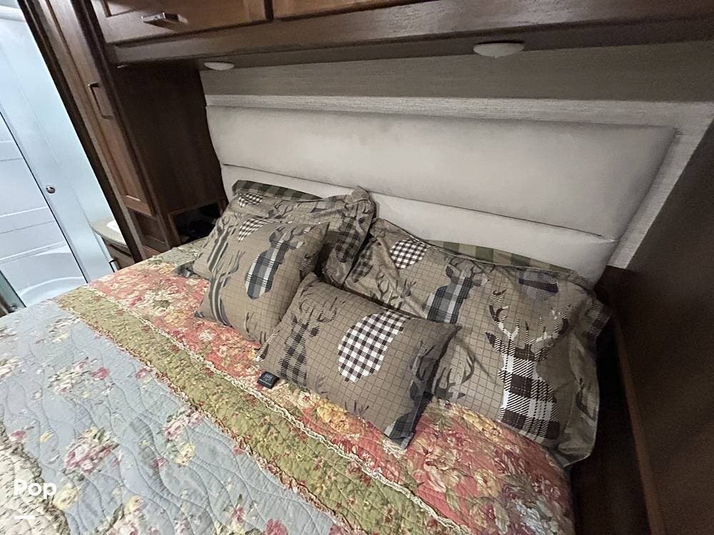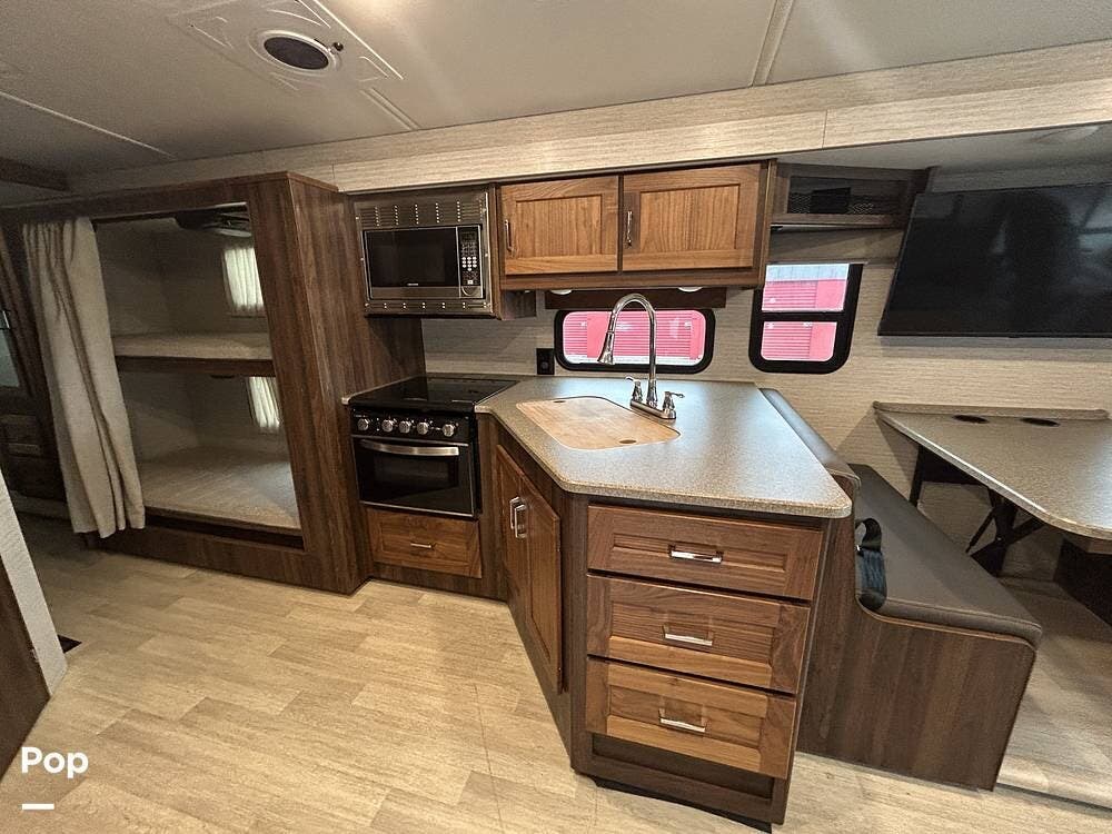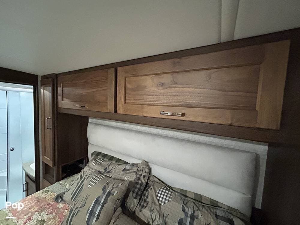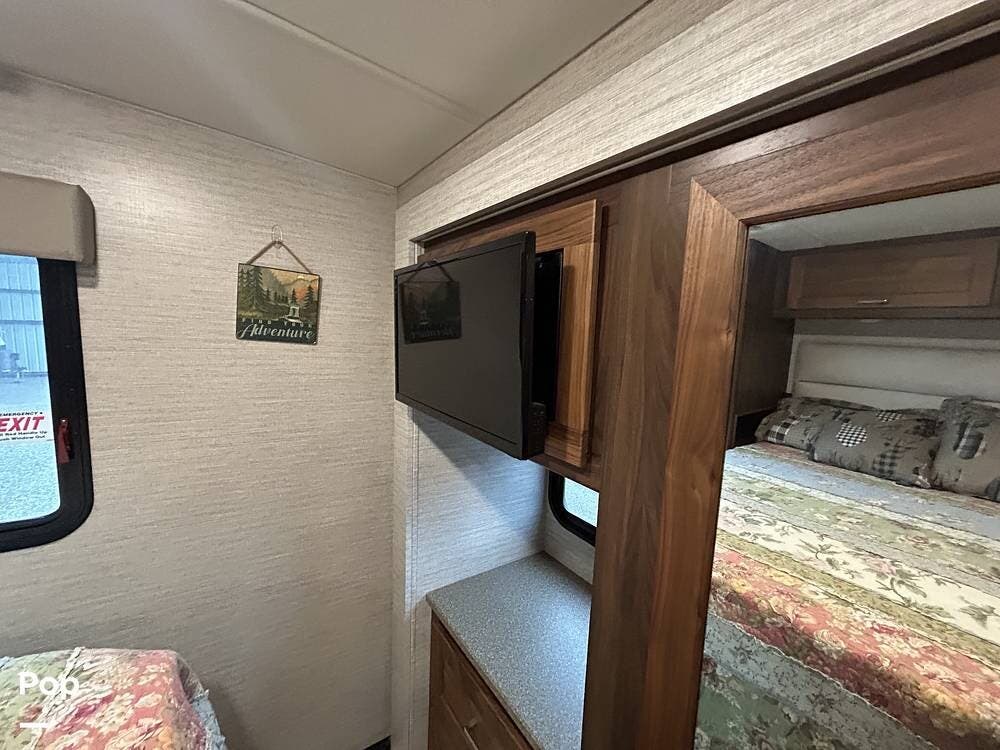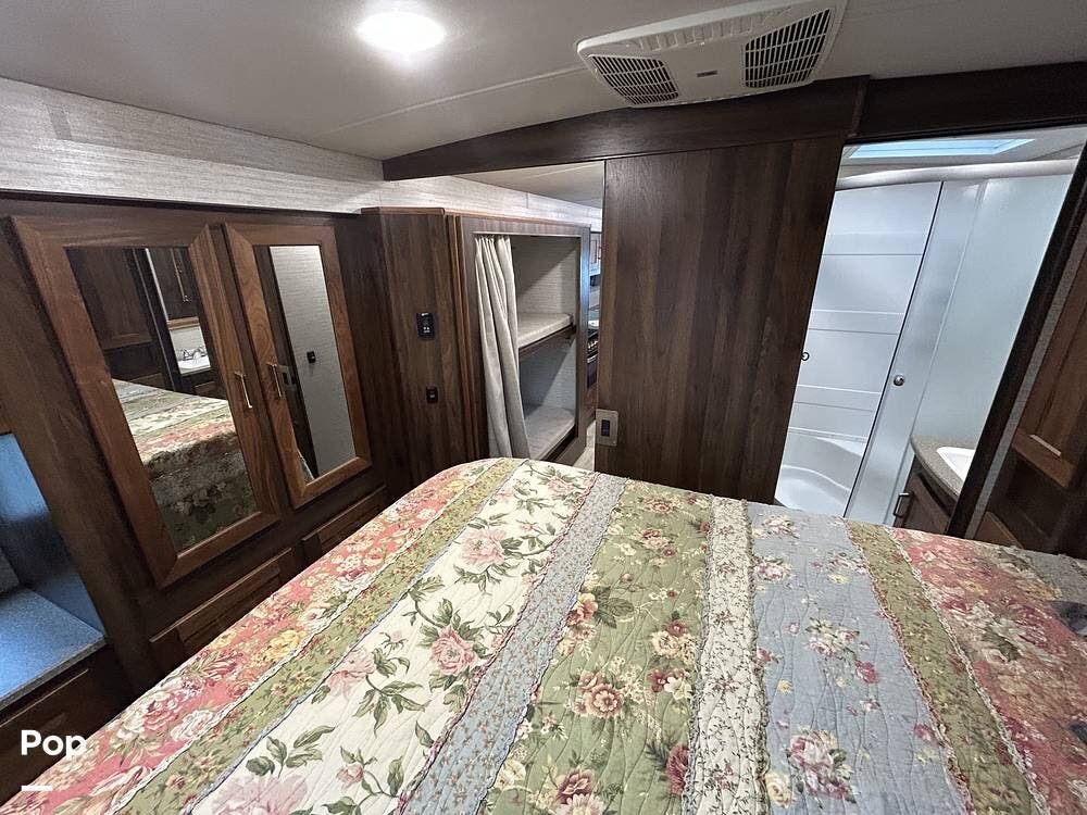 The primary bedroom features a cozy queen bed, while guests can enjoy multiple sleeping options, including bunk beds, a cab-over bunk, a jackknife sleeper sofa, and a convertible dinette.