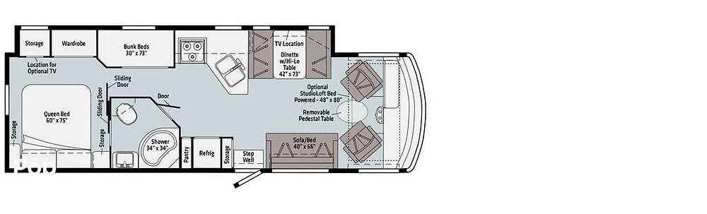 Built on a durable Ford F53 chassis, it's powered by a 7.3L V8 engine generating 350 horsepower, offering reliable performance for all your adventures.