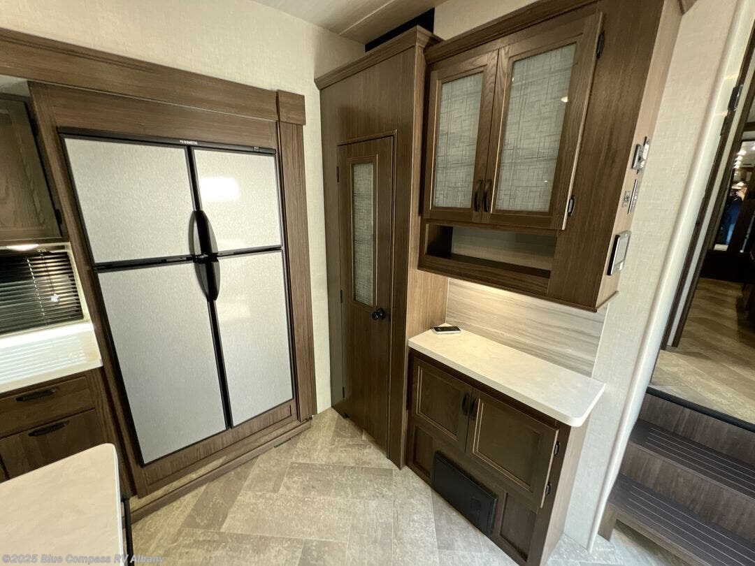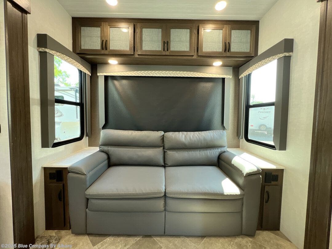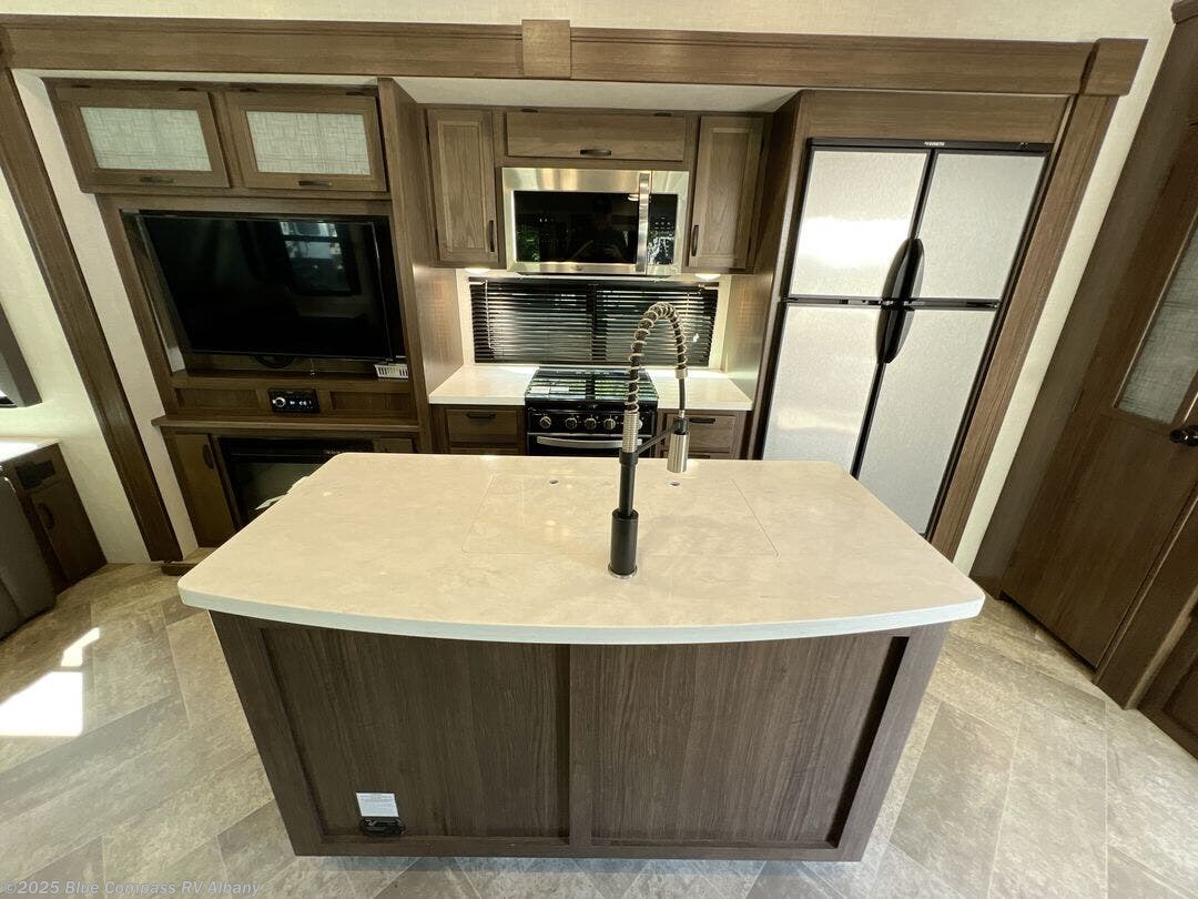 As you spend time lounging on the tri-fold sofa or in the theater seating on this Voyage fifth wheel, you'll be glad to have extra living space because of the opposing slides! You can keep your meals simple, or you can make all of the family favorites with the recessed three-burner cooktop, convection microwave, and 10.3-cubic foot refrigerator. Then, you can sit down with that meal at the free-standing table with chairs. Clean up the dishes like a pro using the high-rise pull-out faucet in the sink on the kitchen island, and then reward yourself by watching your favorite show on the LED TV. When you need to get changed for bed, you can find your clothes in the dresser and full-width wardrobe within the front bedroom.