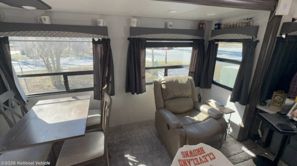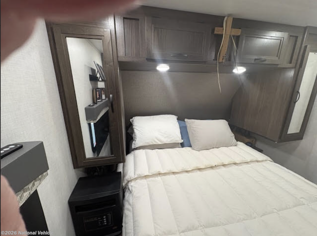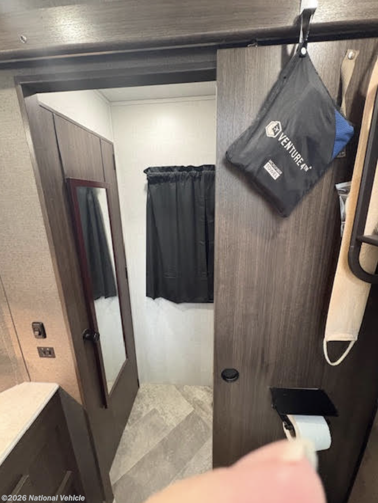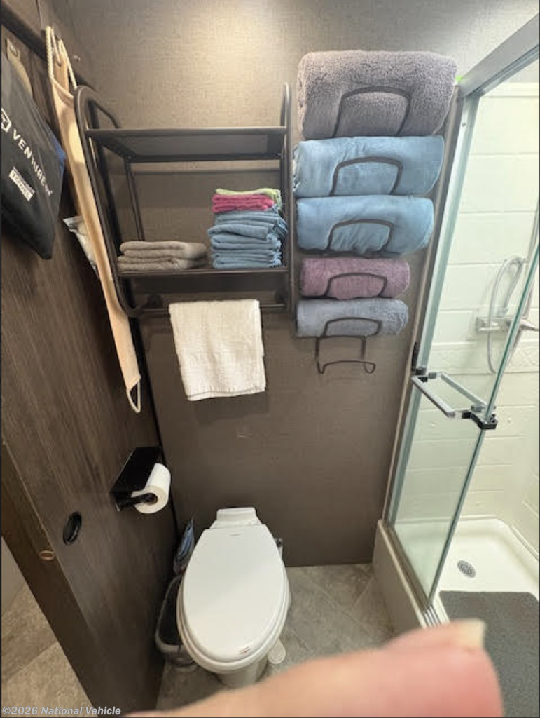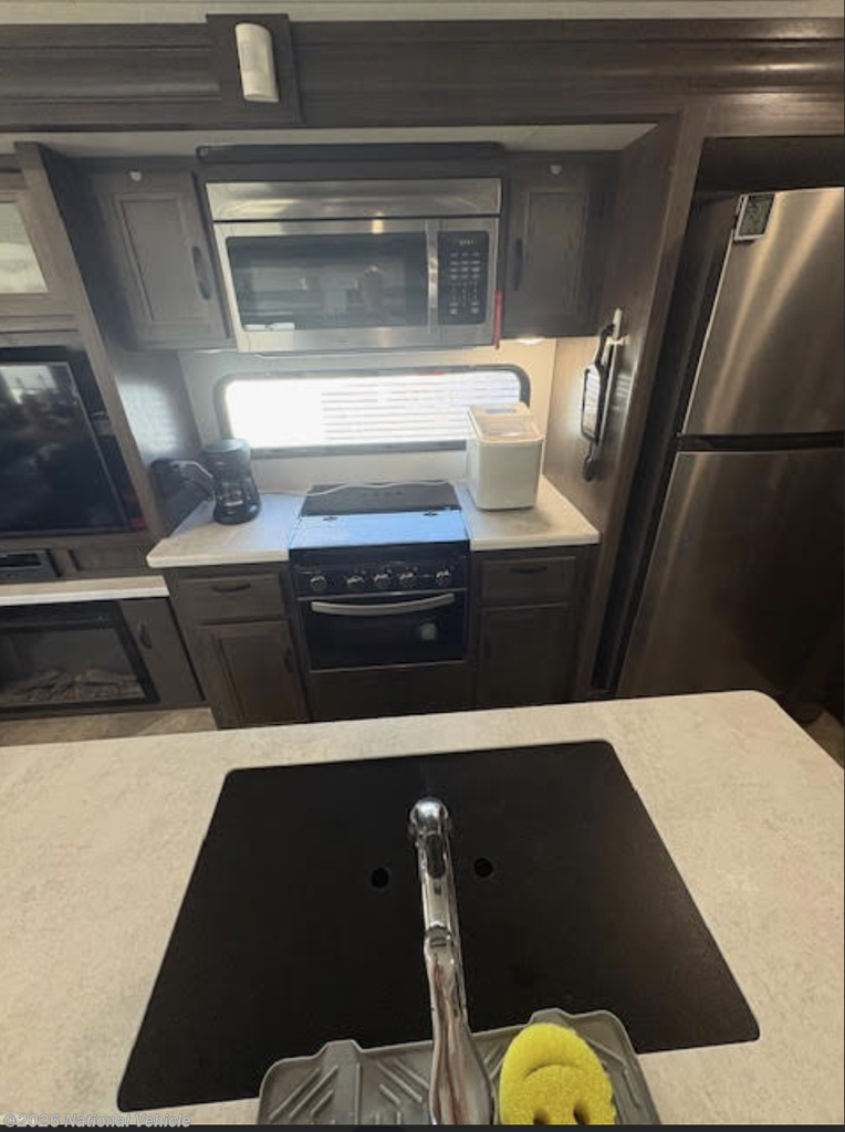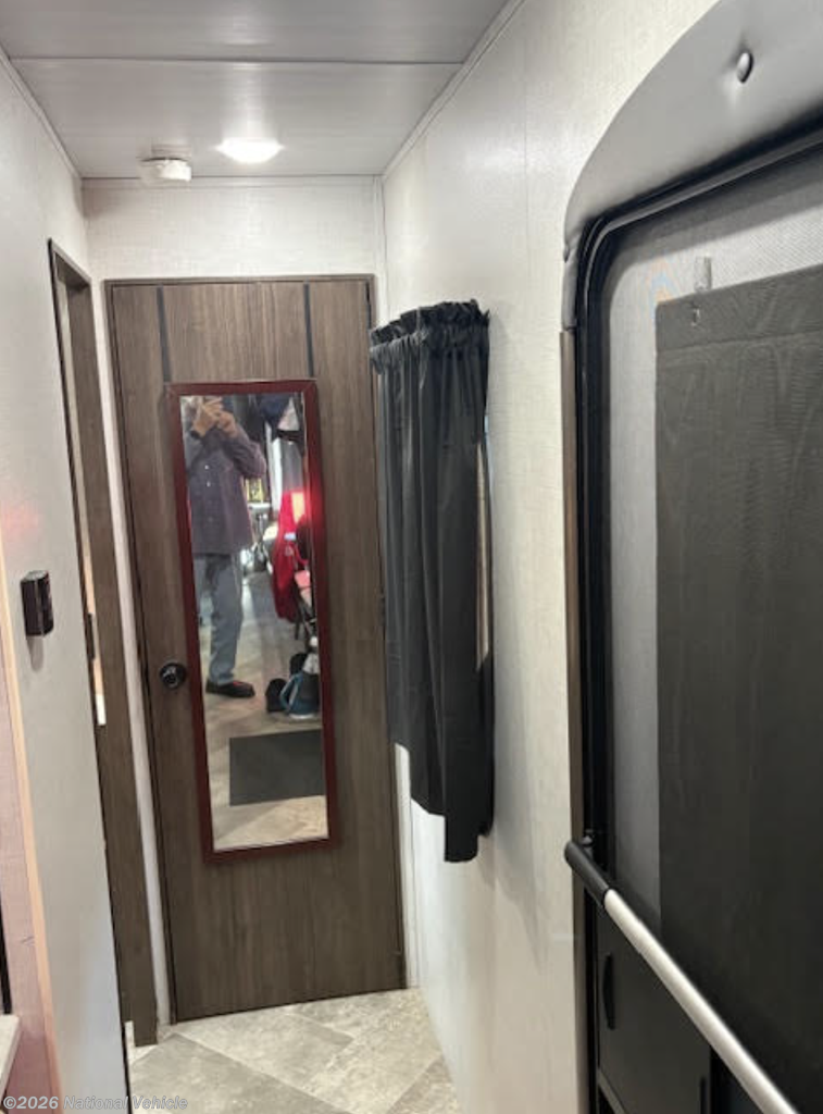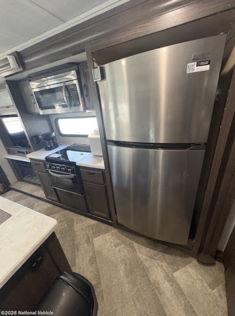 Inside, you?ll find a stylish and functional living space enhanced by a residential refrigerator, perfect for long trips or full-time living. The kitchen shines with a Moen faucet, while the bathroom features a quality Pfister faucet, adding both elegance and reliability.